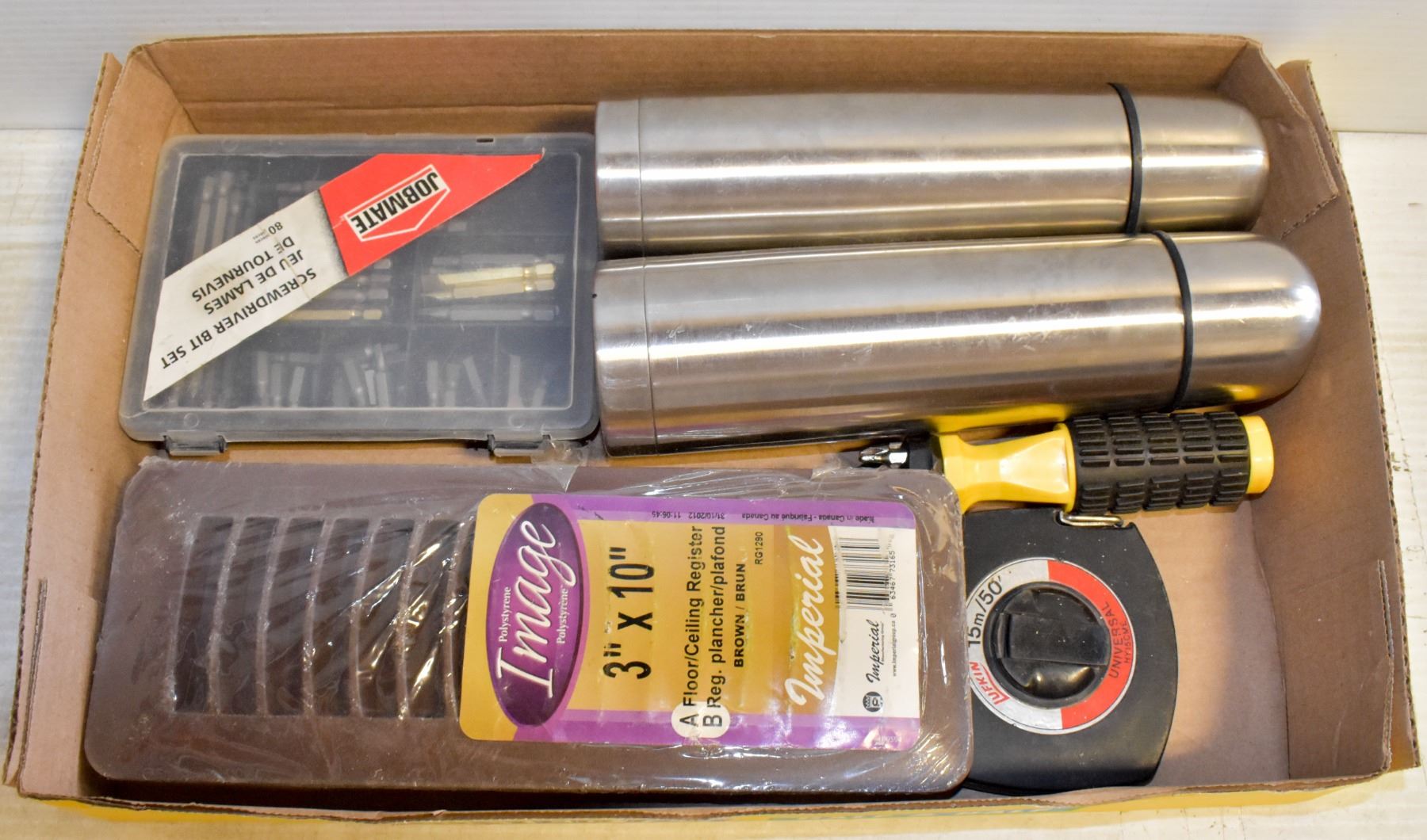 STANLEY 30' MEASURING TAPE + 2 NEW THERMOSES, BIT