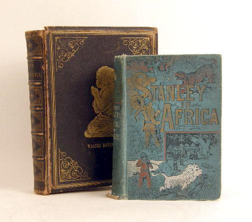 First edition, Stanley Publishing Company, 1889, illustrated with engravings, color plates and maps. A High Victorian gem from the Age of Exploration, the hard cover lavishly illustrated with red, silver and gilt title and images of Stanley, a man-eating lion, leopard, African village, the spine with a hunting party, the back blind-stamped with a foliate crest. Together with a large Victorian "Child`s Bible", profusely illustrated with woodcuts, the cover gilt-stamped with a kneeling, praying child and the name "Walter Mangels", gilt page ends. 2 pieces. "Stanley" with wear to edges of cover and spine, flyleaves loose and with nicks to edges of paper. Bible with cover and first few pages detached.