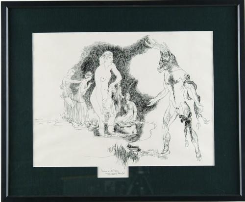 STANTON MACDONALD WRIGHT (American, 1890-1973) "DIANA and THE MINOTAUR". Pen and ink drawing showing a nude woman bathing with four other women being approached by a standing minotaur. Titled and signed at center bottom. Housed in a fine ebonized wood frame with green matte with cutout for title and signature. PROVENANCE: Originally owned by Mrs. Tozzer Lincoln (Dole) of the Dole family of Hawaii, New York, New Hampshire and Los Angeles. SIGHT SIZE: 19-1/4in. x 23-1/2in.. CONDITION: Very good. 9-25781