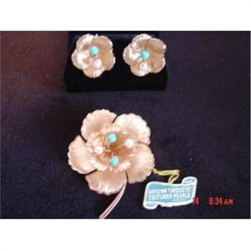 Here is a wonderful set from the 1940-1950s!! the original tag remains on this, this is obviously never been worn! The Tag says STAR on one side and the other side says Genuine Turquoise Cultured Pearls. This floral design brooch has 2 hand placed cultured pearls and 2 hand placed turuqoise pieces. The earrings have one of each and are clipped. the earrings are signed STAR!! WONDERFUL Vintage costume jewelry designer set!