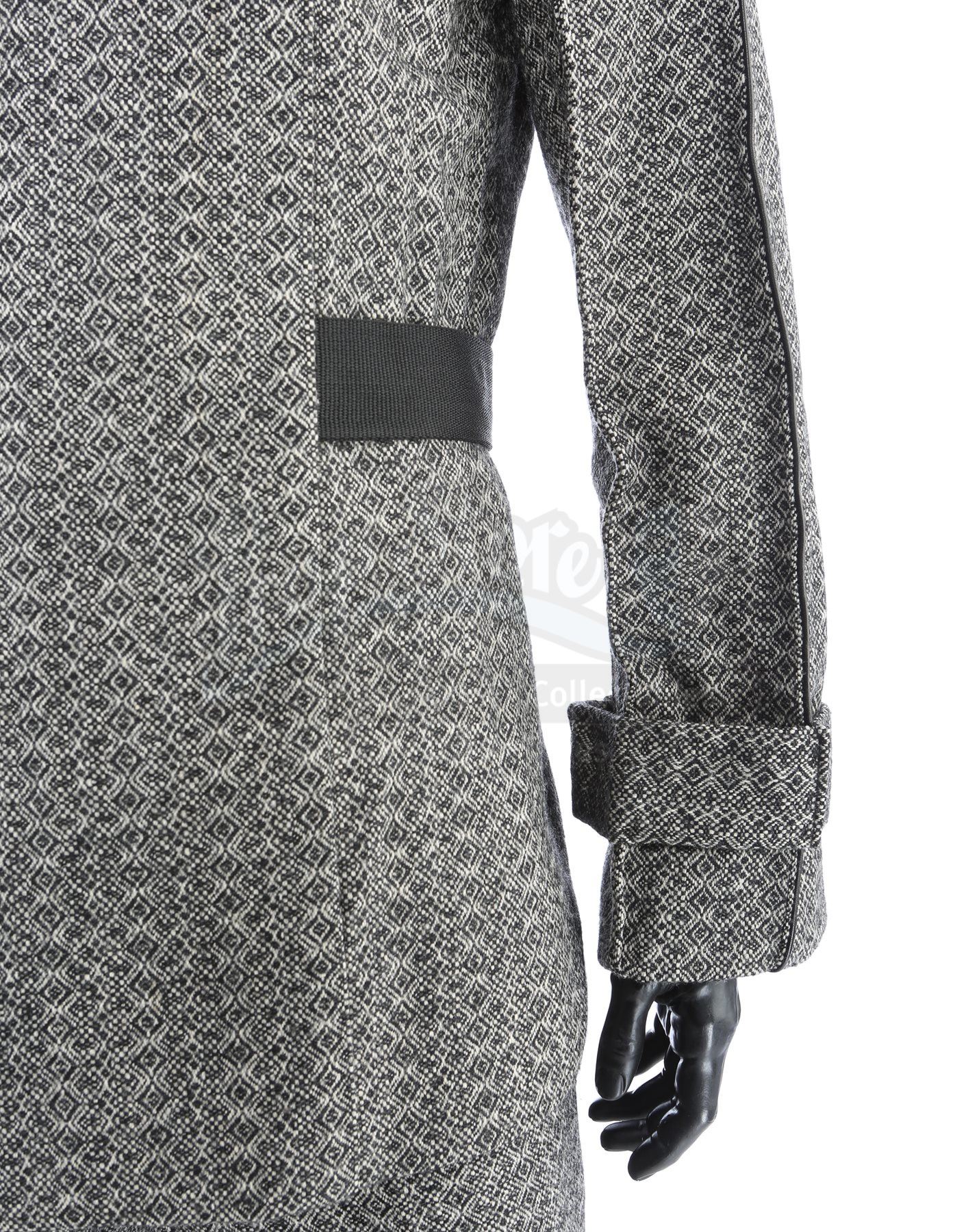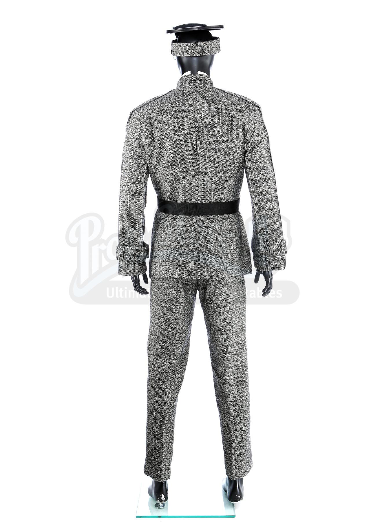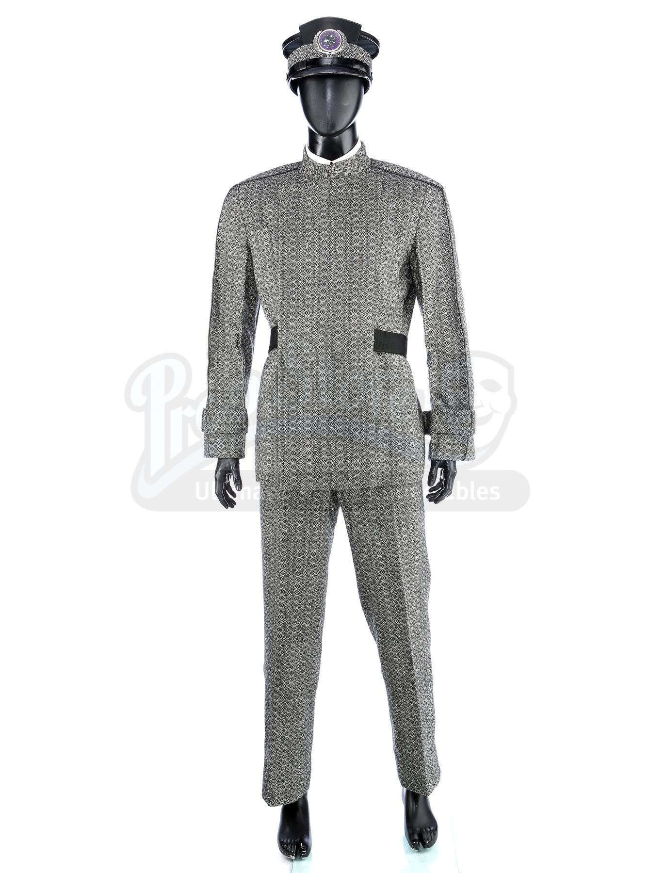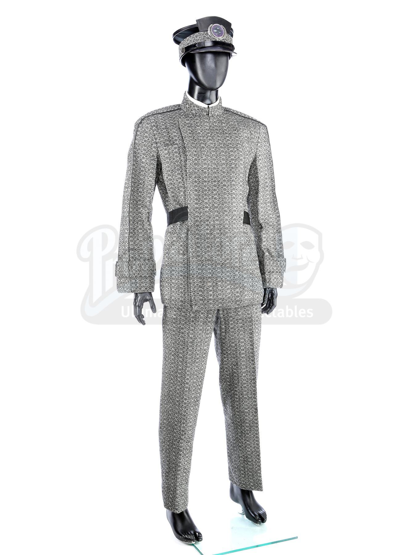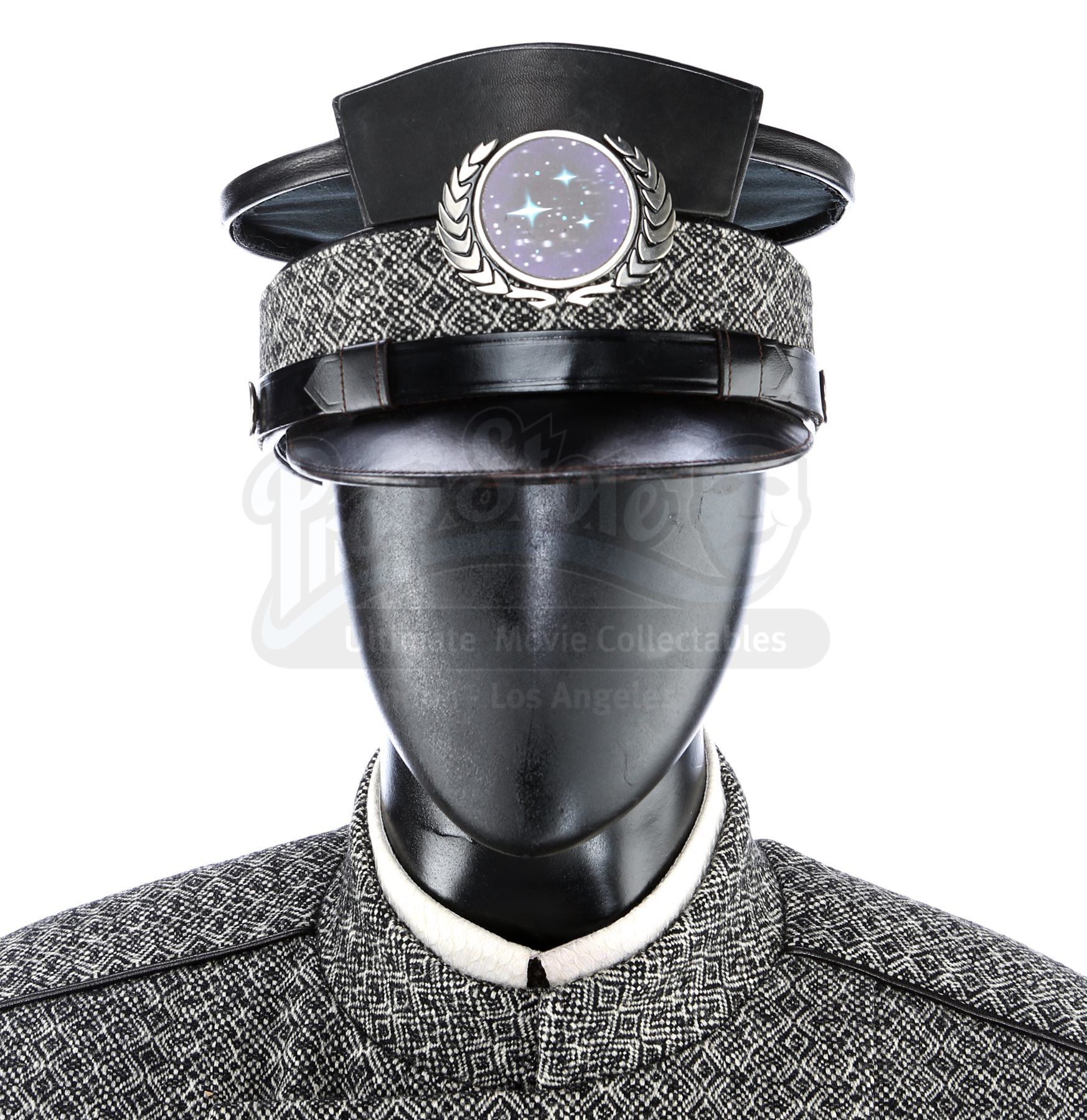 The custom-made uniform is largely made of furniture upholstery fabric with faux leather components. The cap features a unique leather top that is only attached at the front, with the sides completely open. The front of the cap includes a lenticular Federation pin. The double-breasted jacket features a leather collar and cuffs and sturdy piping at the seams. The pants are made of the same material with a zipper fly and hook-and-bar closure. The military cap, collar and pants are the proper type for the costume; they were used in the production but not specifically by this character.