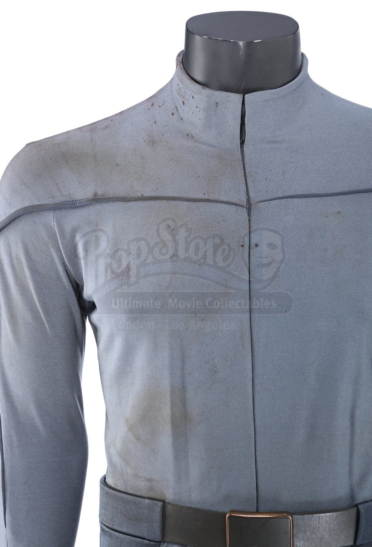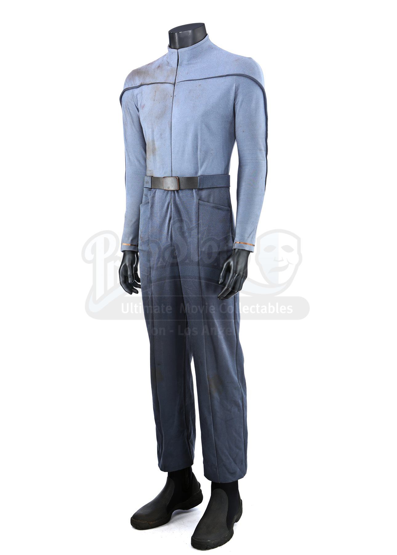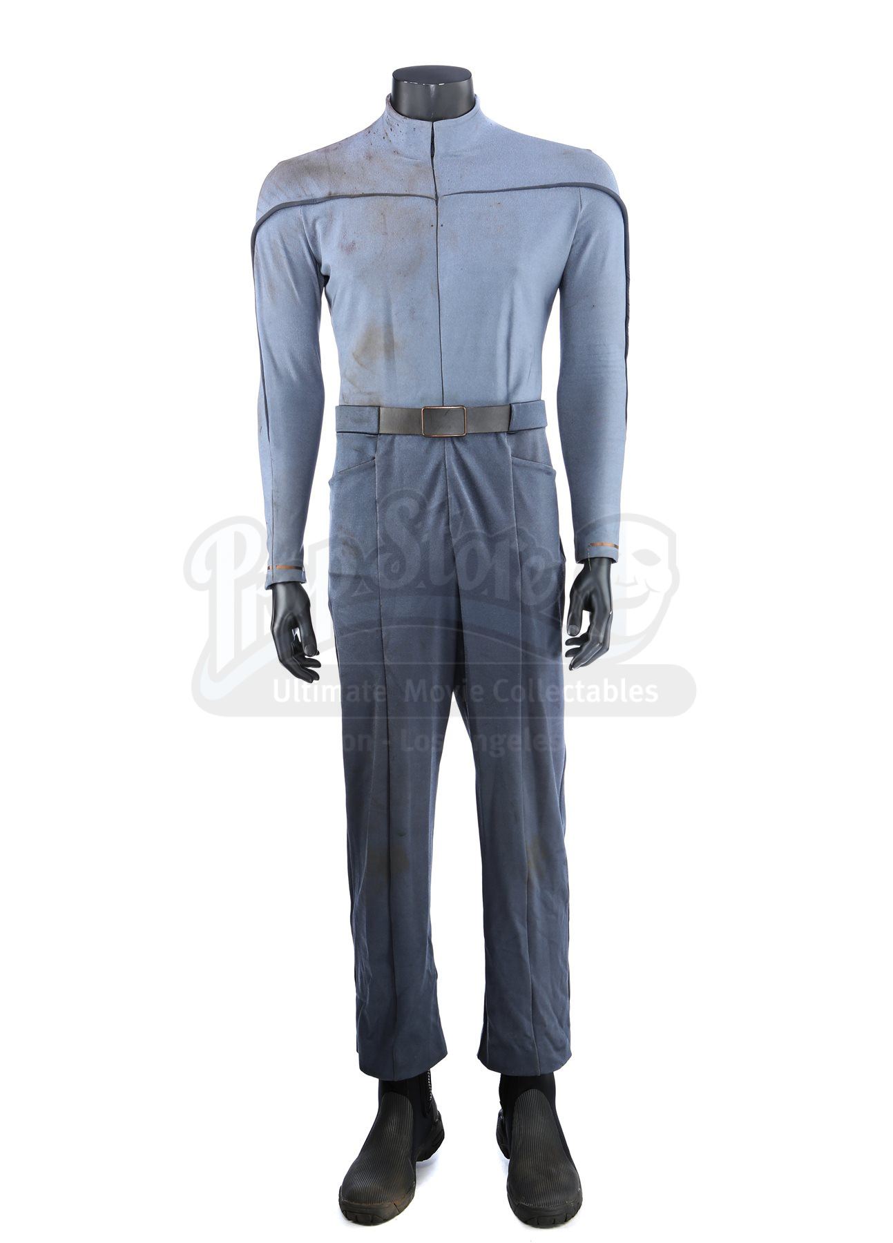A men's Kelvin distressed sciences uniform from Star Trek. Crewmen wore their uniforms on the USS Kelvin when they were attacked by the Narada, a Romulan ship that brought about an alternate reality. The uniform includes a custom-made Spandex Starfleet jumpsuit (medium) and a pair of neoprene diving boots (extra large).