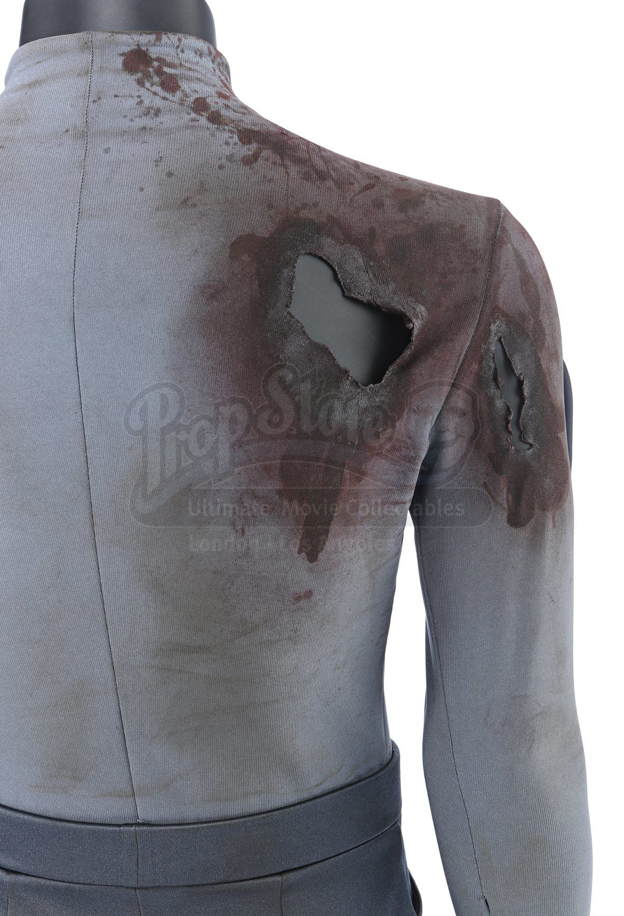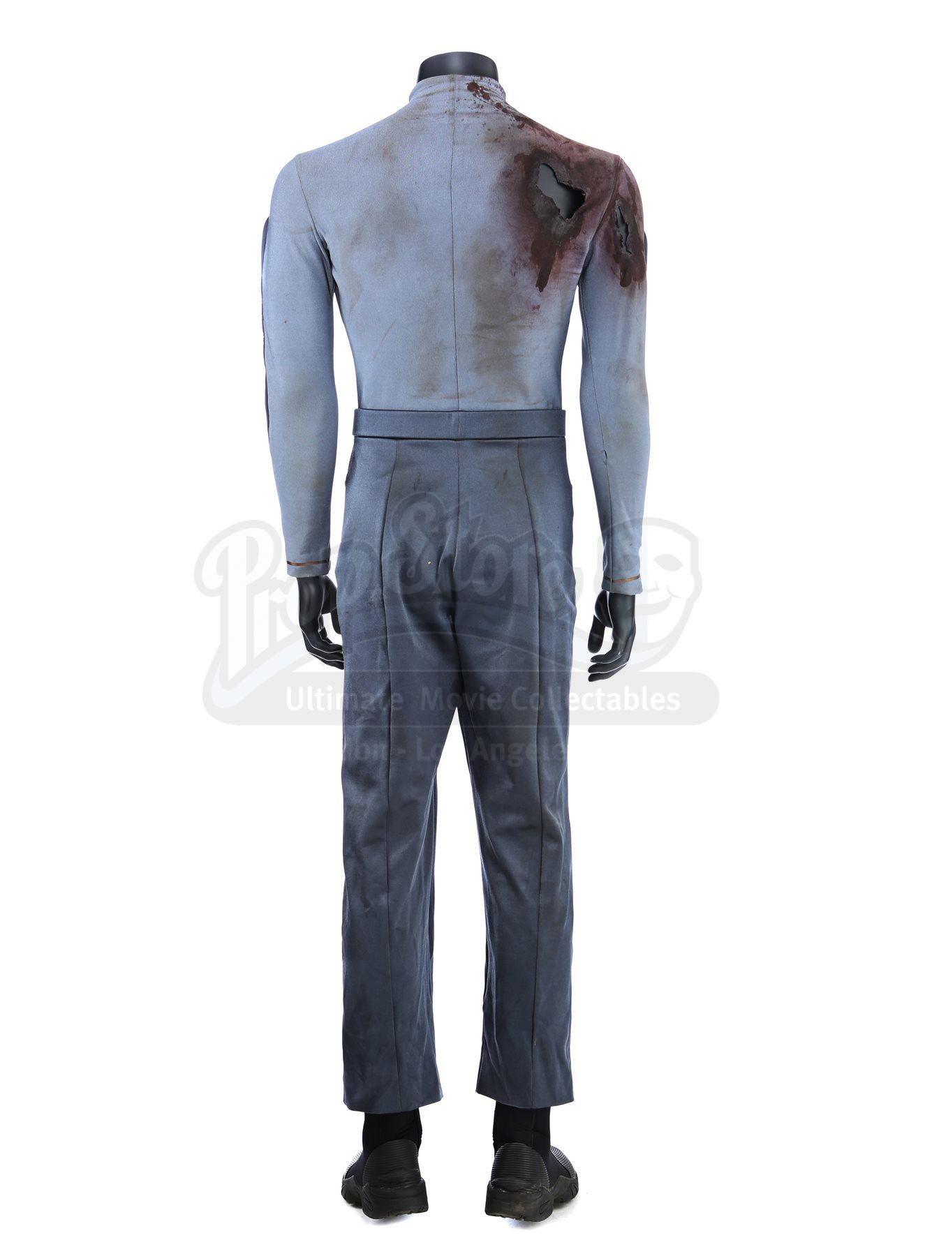 The grey Spandex jumpsuit has a zip front and features piping from the chest to the wrists and a built-in leather belt. The costume is distressed by the production with two wounds at the back right shoulder, which are heavily dressed with stage blood. The high-top diving boots are made of neoprene with sturdy rubber soles and feature side zippers.