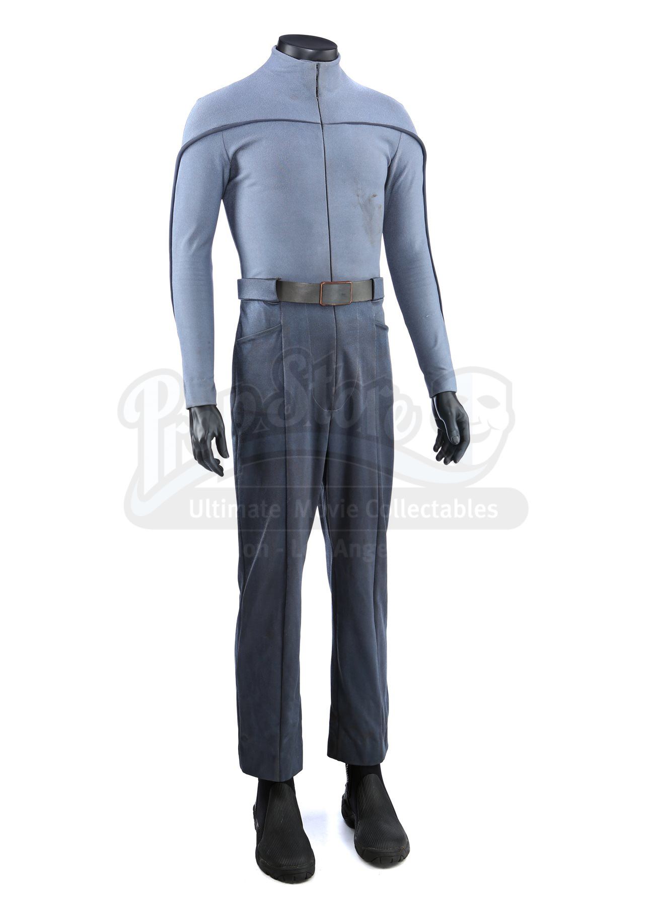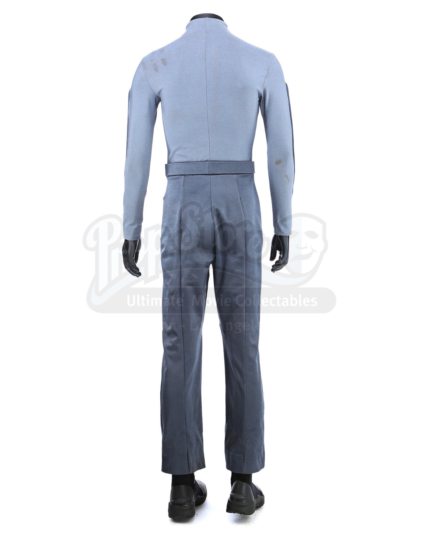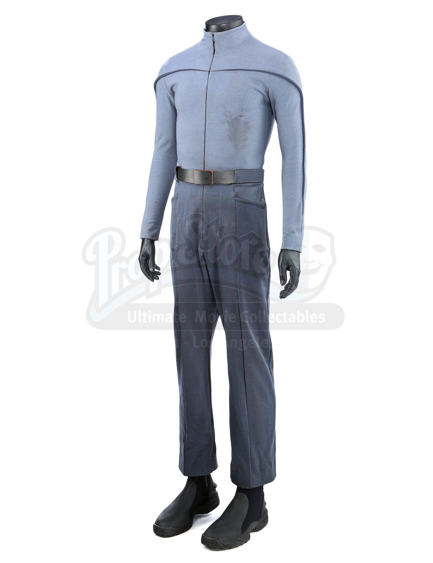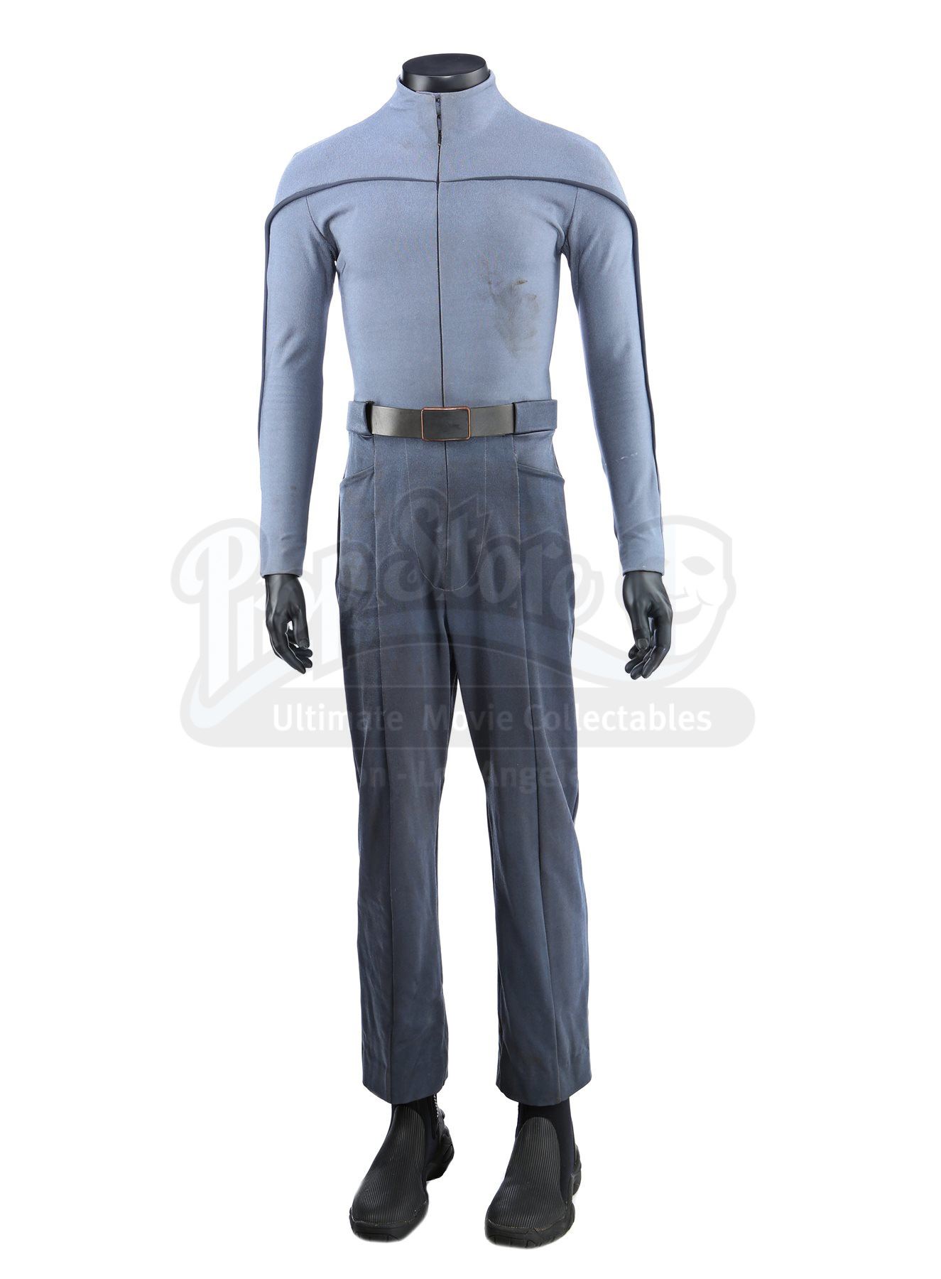 A men's Kelvin sciences uniform from Star Trek. Crewmen wore their uniforms on the USS Kelvin when they were attacked by the Narada, a Romulan ship that brought about an alternate reality. The uniform includes a custom-made Spandex Starfleet jumpsuit (small) and a pair of neoprene diving boots (large).