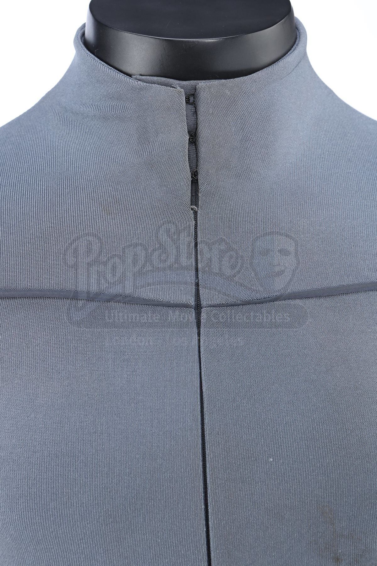 The grey Spandex jumpsuit has a zip front and features piping from the chest to the wrists and a built-in leather belt. The high-top diving boots are made of neoprene with sturdy rubber soles and feature side zippers.
