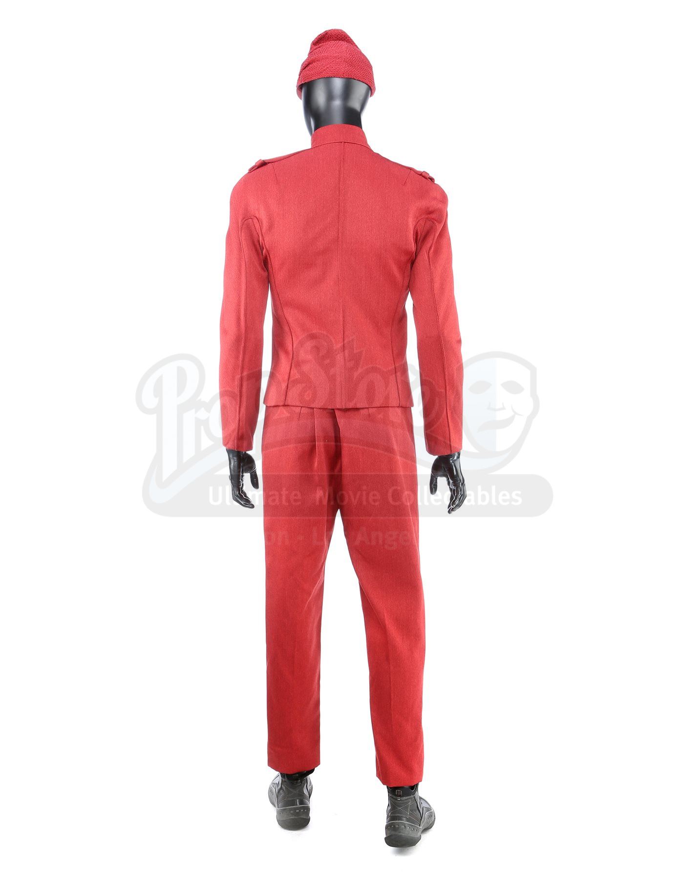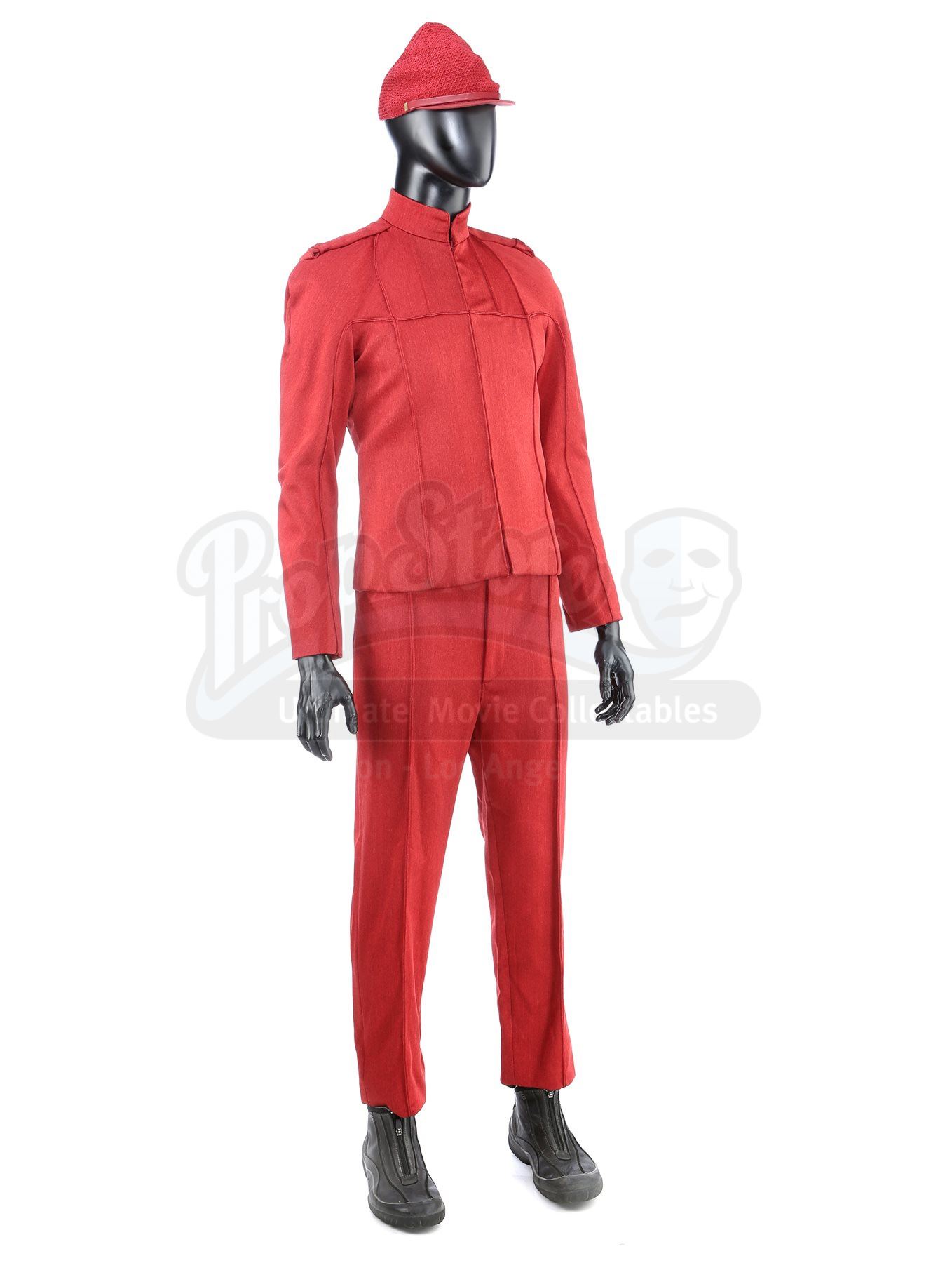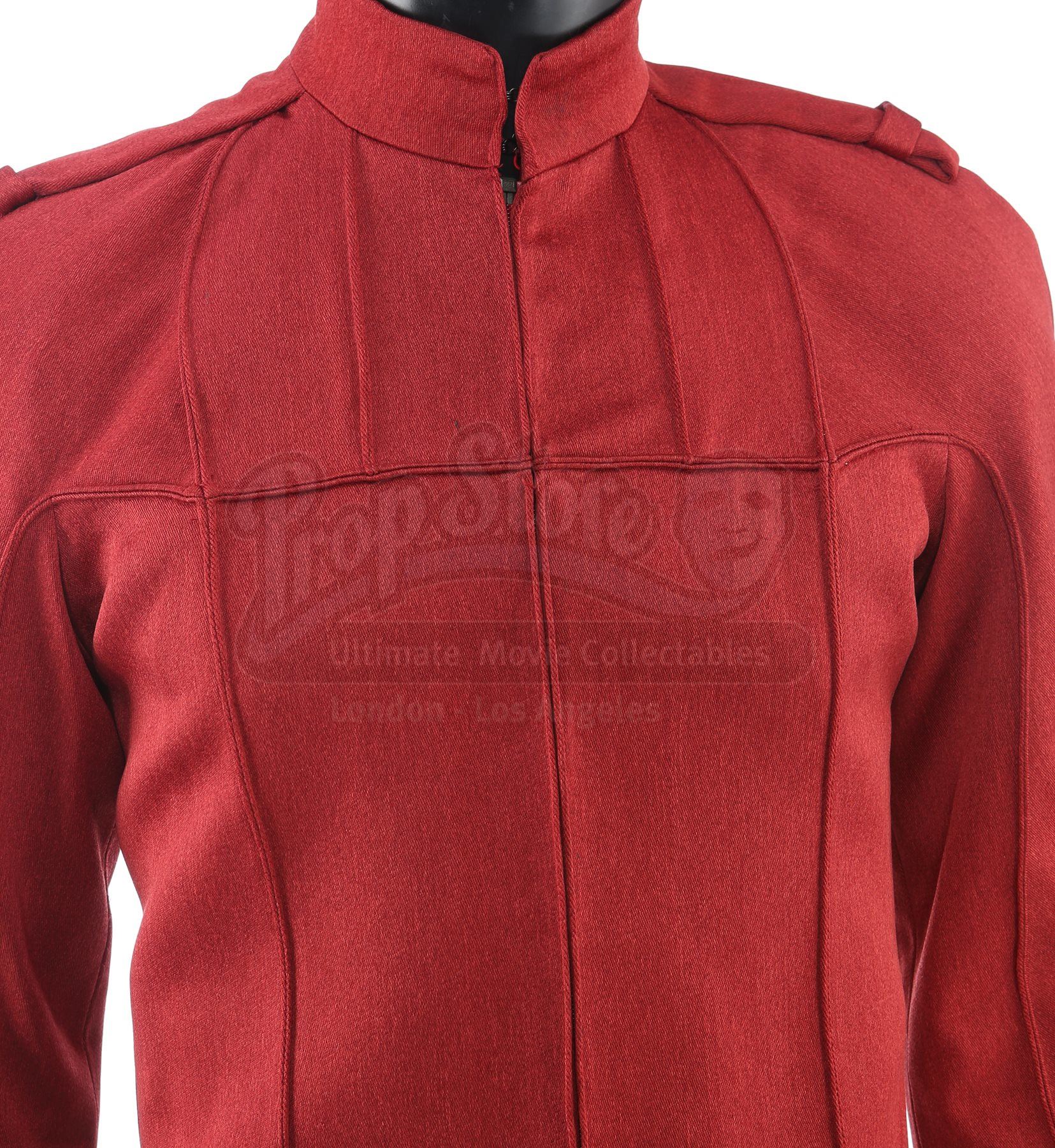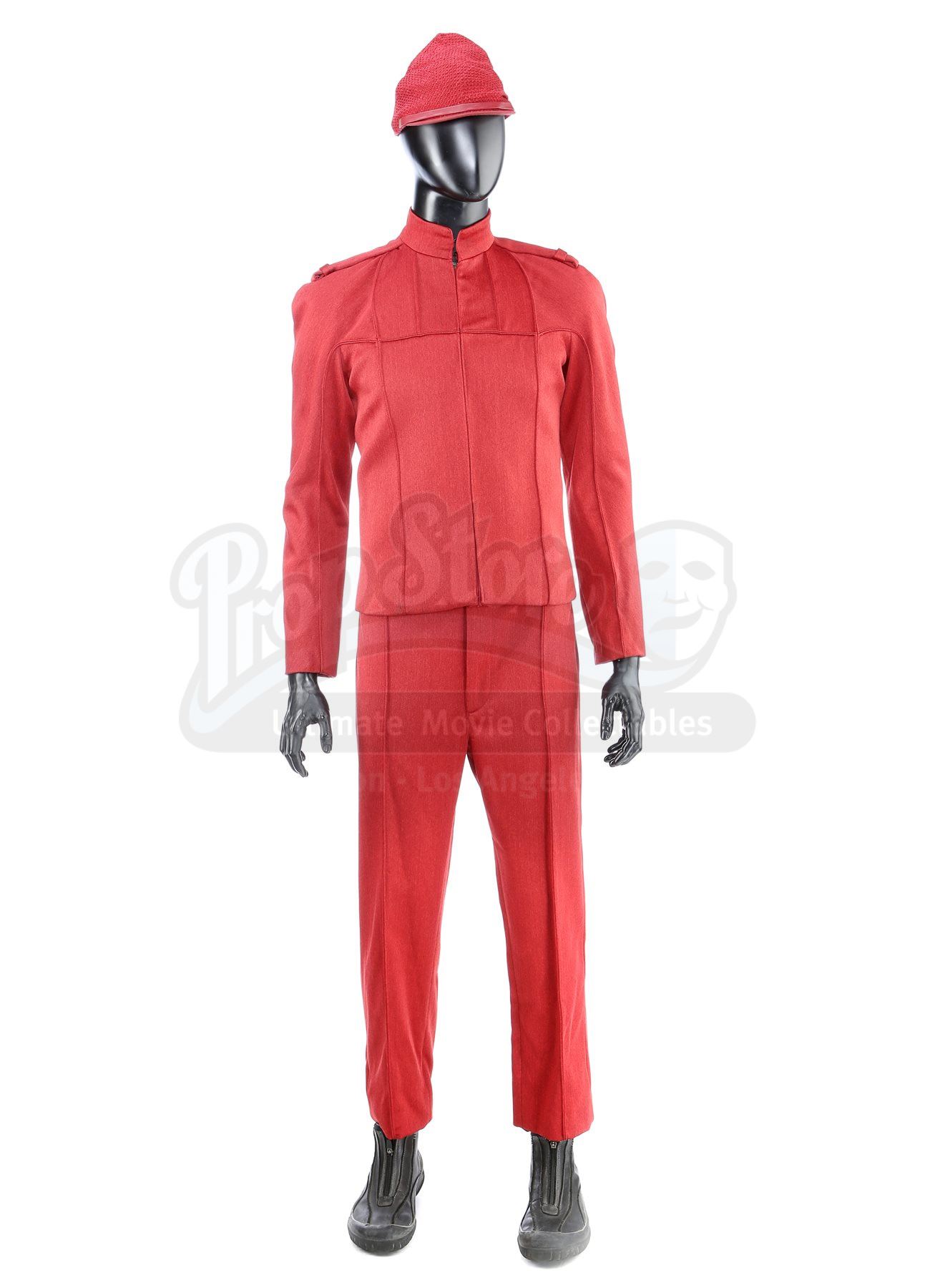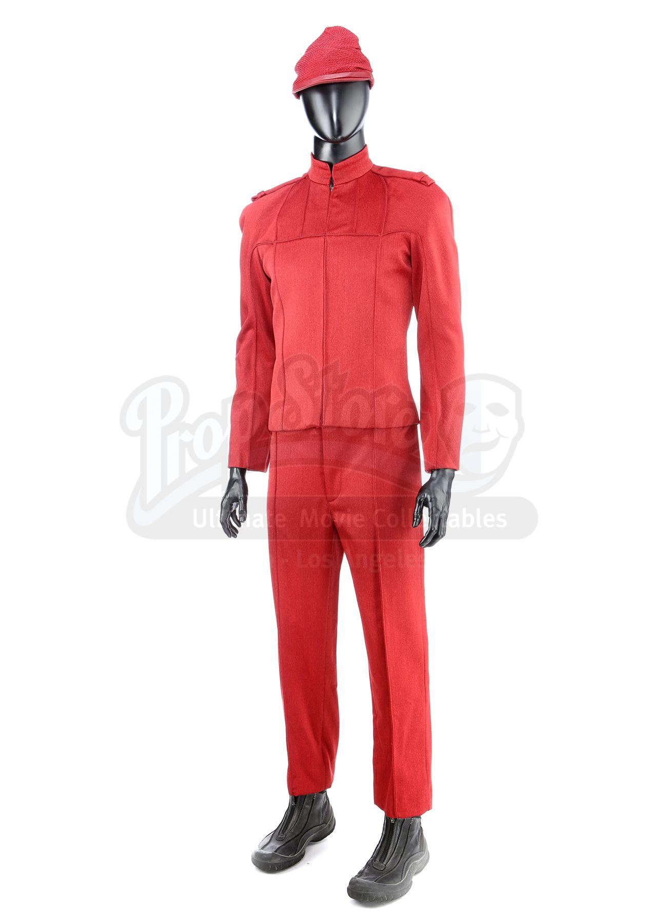 A men's Starfleet cadet uniform from Star Trek. Cadets wore their red uniforms at Starfleet Academy in San Francisco. The uniform includes a cap, Starfleet Academy jacket (medium), a knit turtleneck sweater (medium), pants (large), and a pair of shoes (9M). The cap features a knit outer with a black polyester lining. Both the jacket and the pants are made of a synthetic material with a metallic sheen and have ribbed seams. The zip-up jacket includes padded shoulders and a mid-length collar. The shoes are made of leather with a front zipper closure. Estimate: $600 - 800*Estimated sale price; sold without reserve.