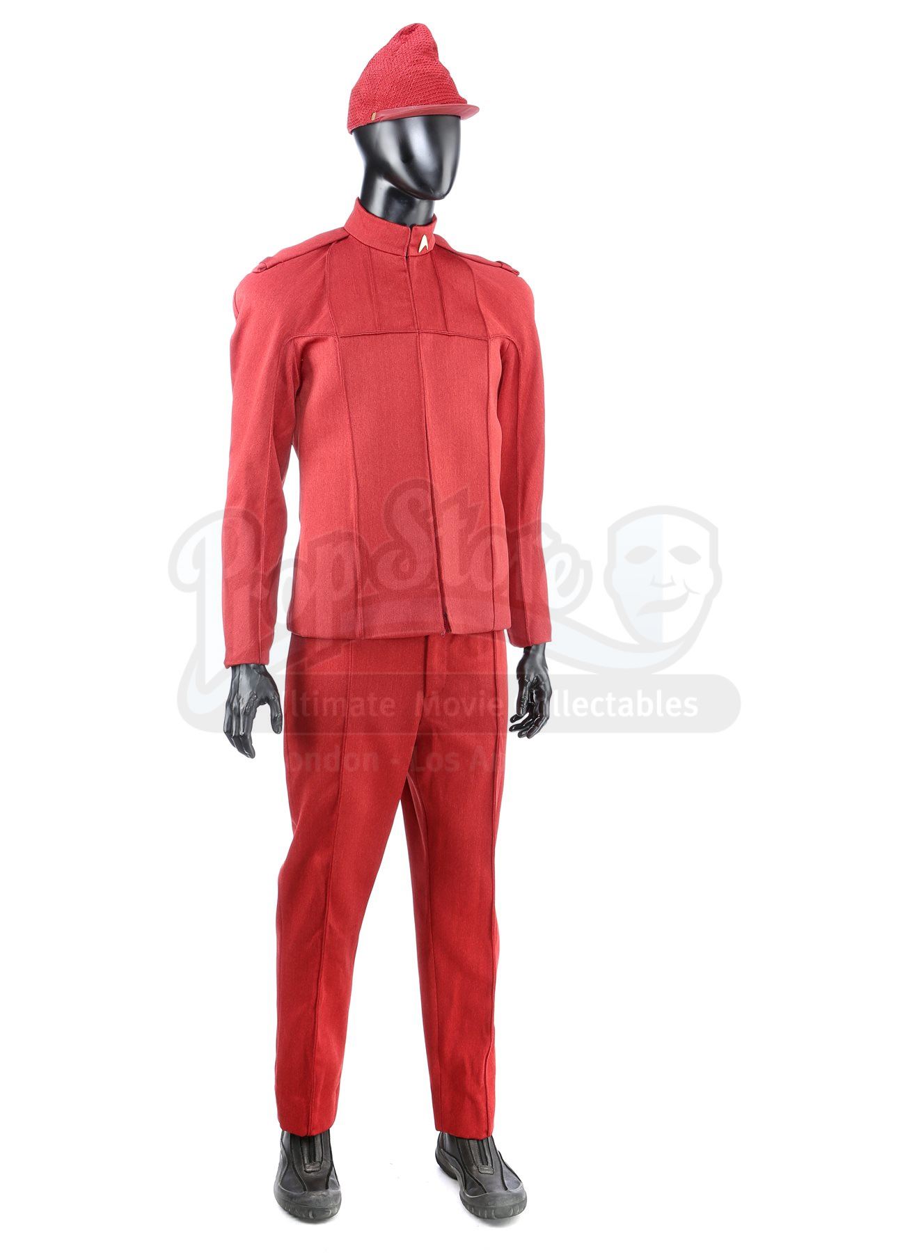 A men's Starfleet cadet uniform from Star Trek. Cadets wore their red uniforms at Starfleet Academy in San Francisco. The uniform includes a cap, Starfleet Academy jacket (large), a knit turtleneck sweater (large), pants (no size marked), and one pair of leather shoes (8M).