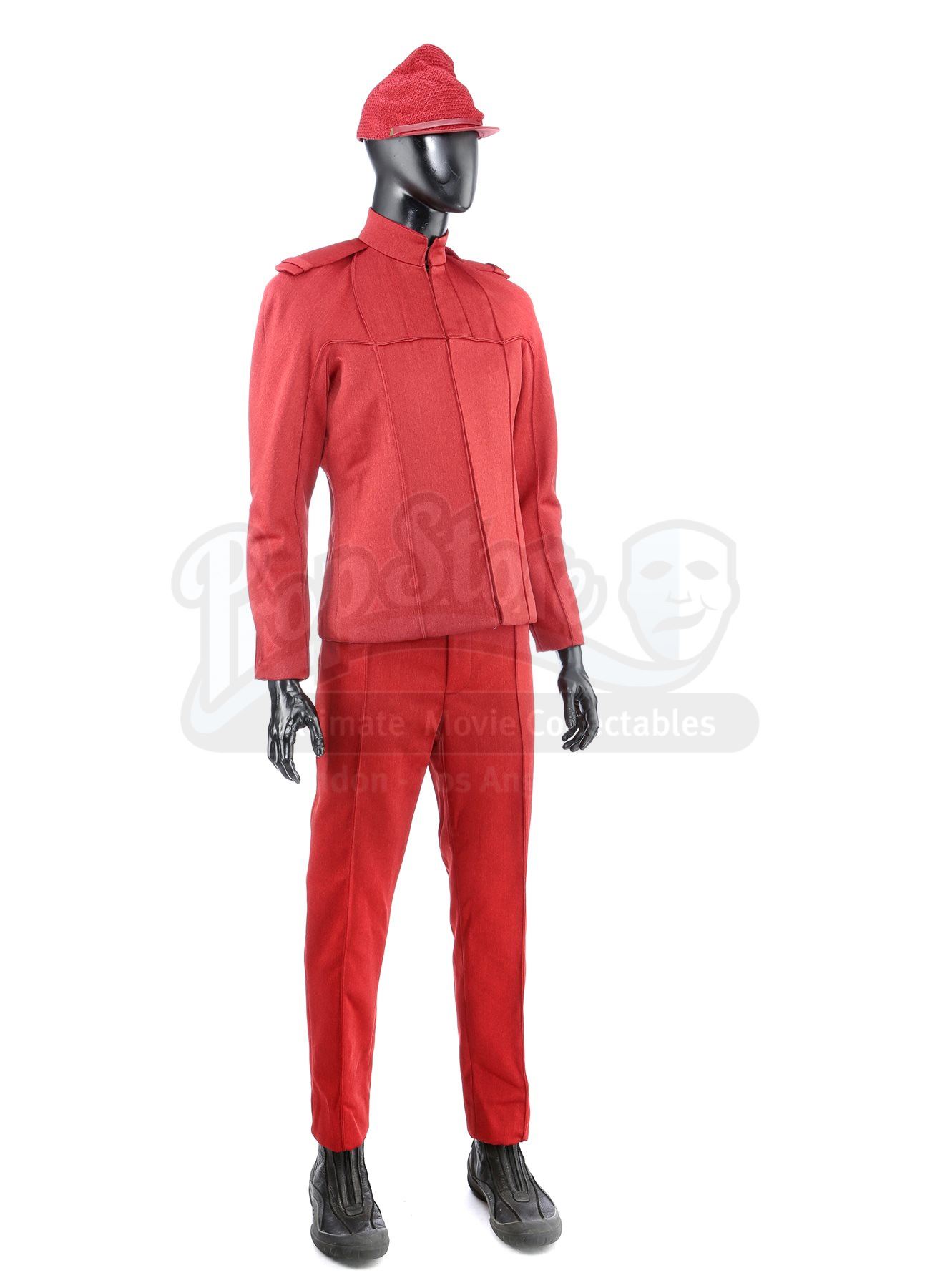 A men's Starfleet cadet uniform from Star Trek. Cadets wore their red uniforms at Starfleet Academy in San Francisco. The uniform includes a cap, Starfleet Academy jacket (medium), a knit turtleneck sweater (large), pants (no size marked), and one pair of leather shoes (11M).