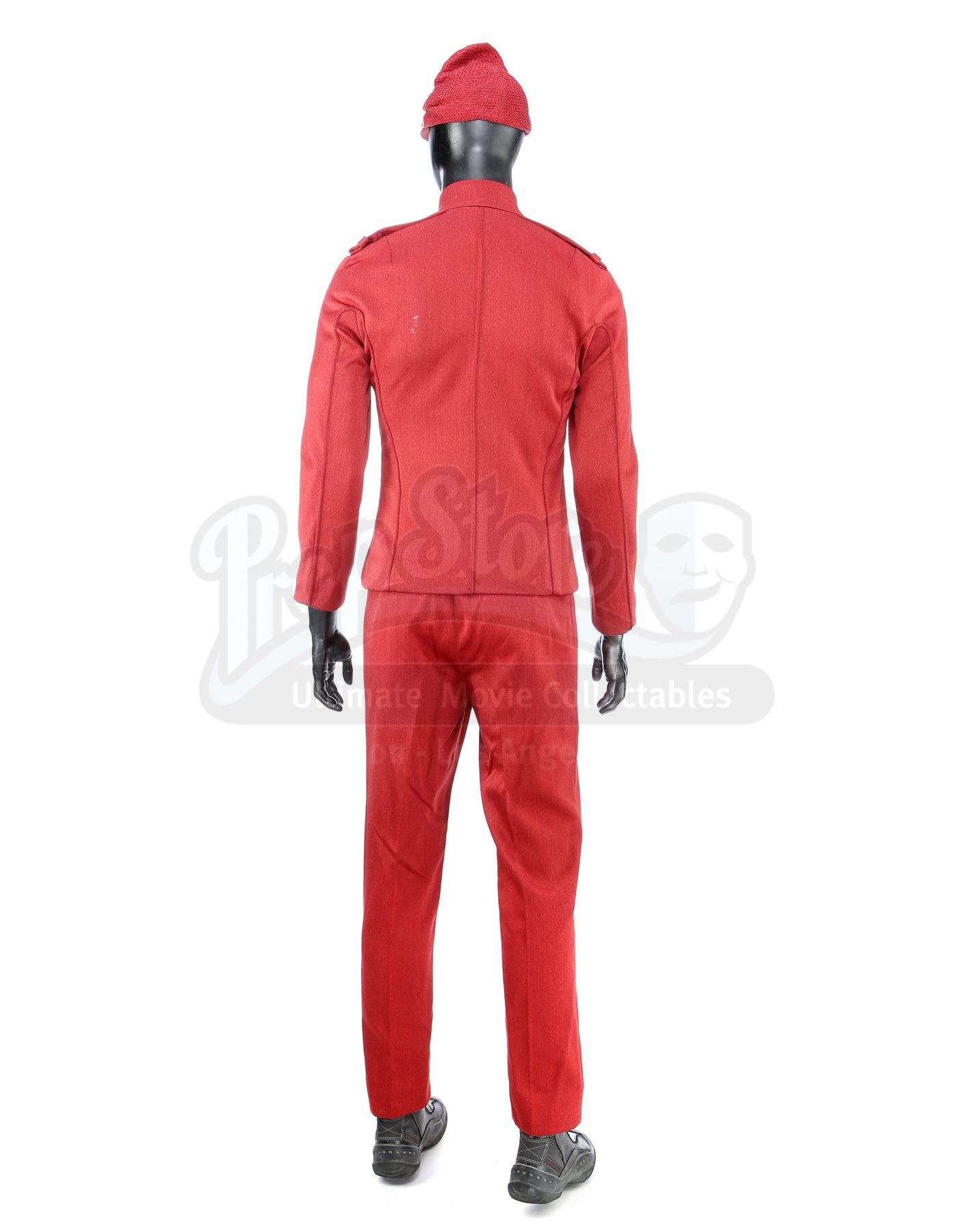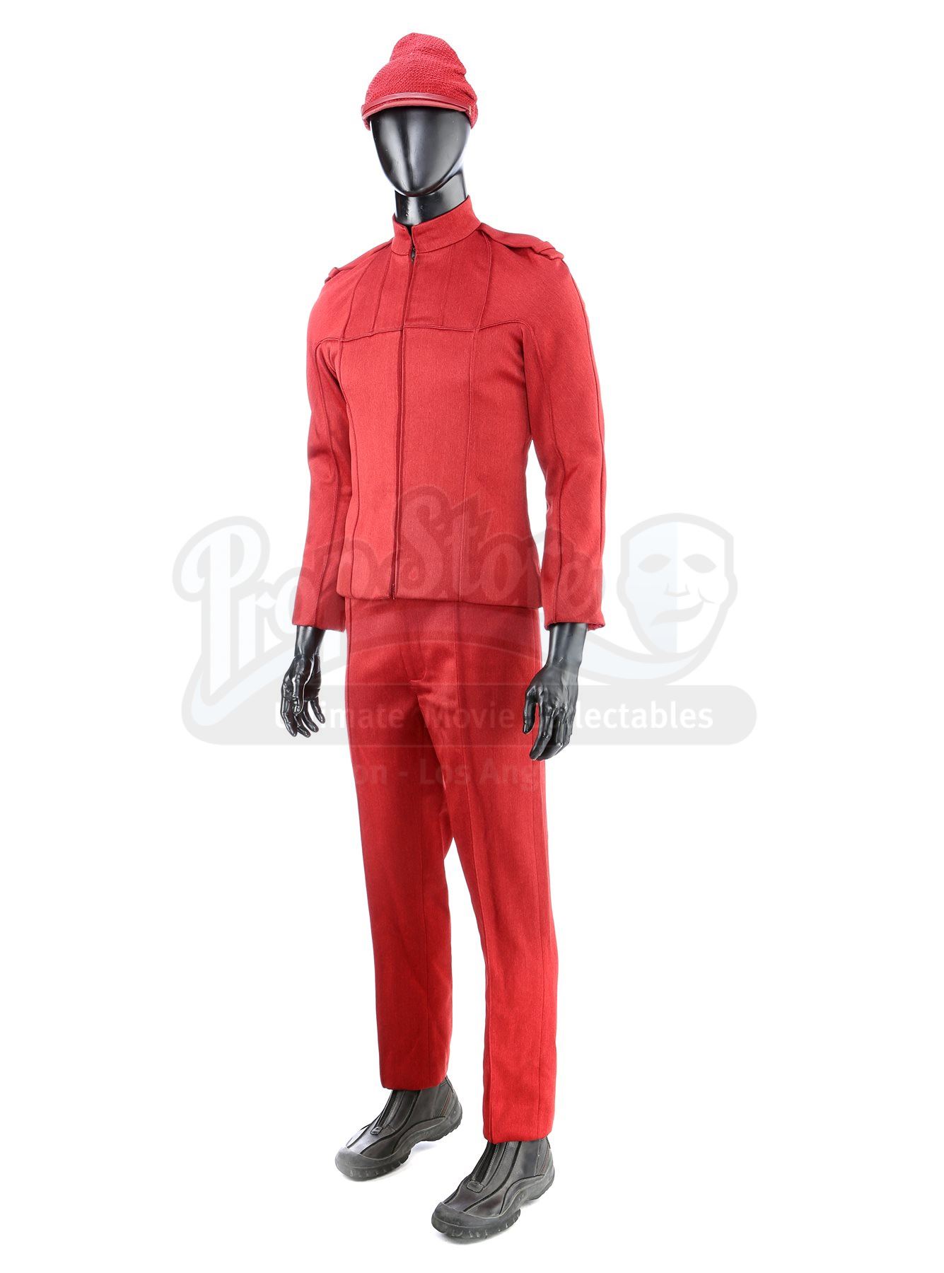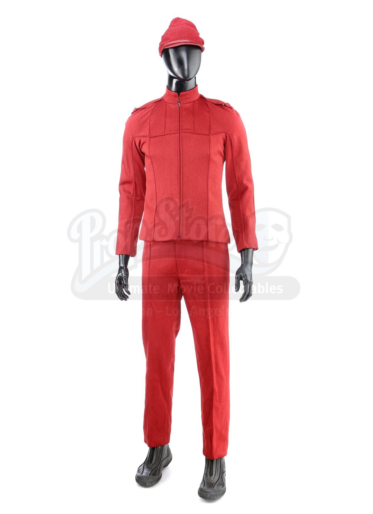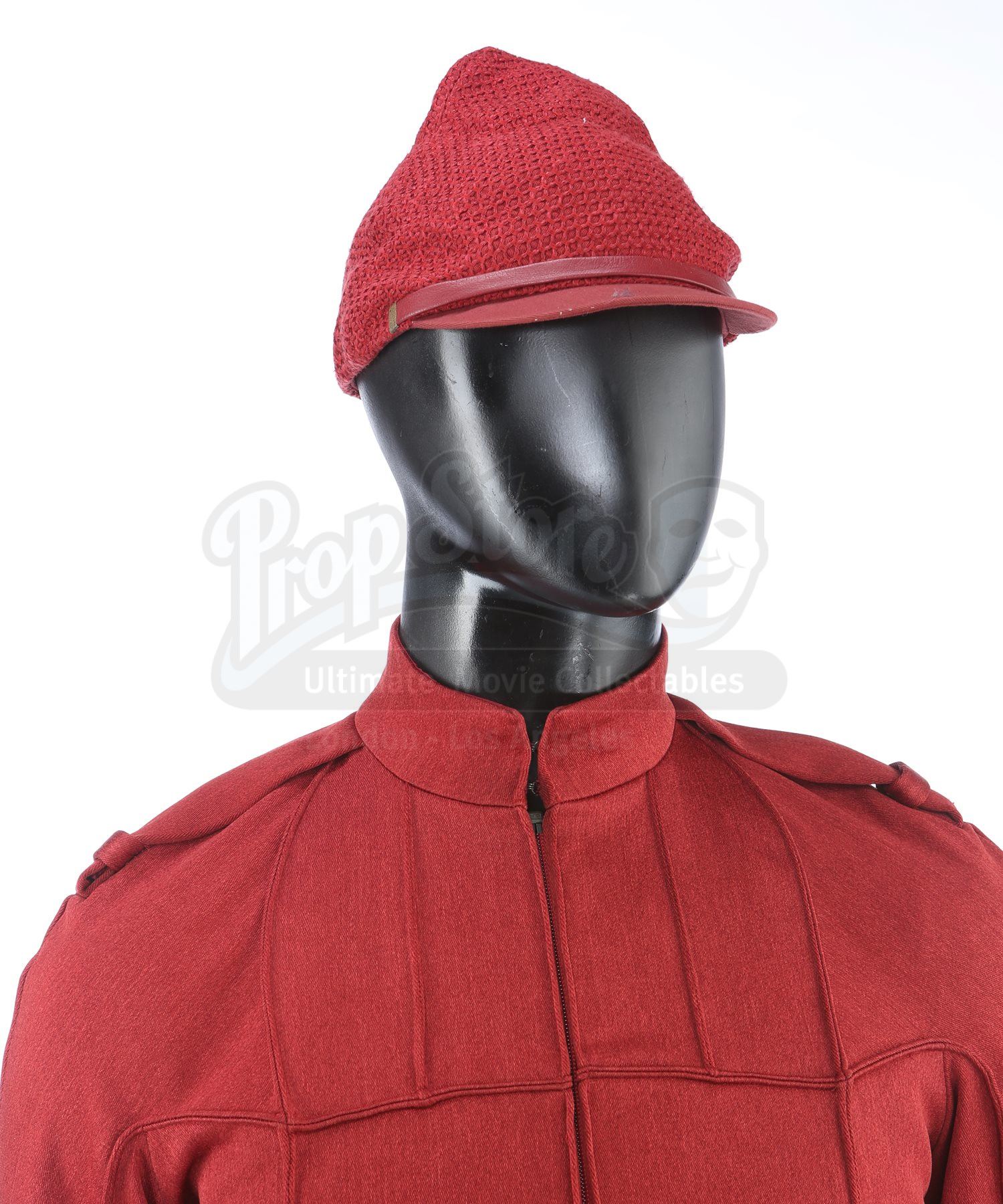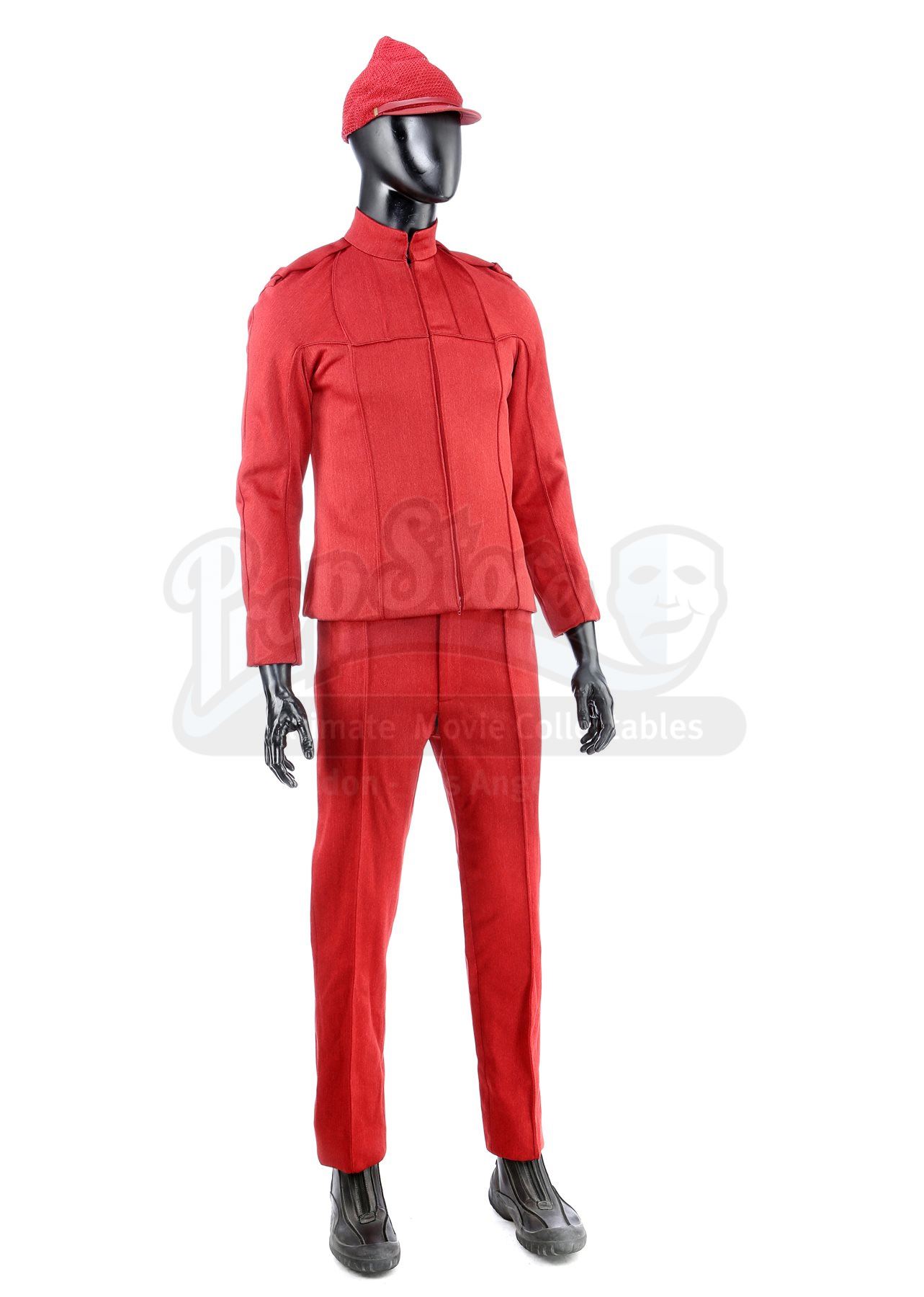 A men's Starfleet cadet's uniform from Star Trek. Cadets wore their red uniforms at Starfleet Academy in San Francisco. The uniform includes a cap, Starfleet Academy jacket (medium), a knit turtleneck sweater (medium), pants (no size marked), and one pair of leather shoes (8M). The cap features a knit outer with a black polyester lining. Both the jacket and the pants are made of a synthetic material with a metallic sheen and have ribbed seams. The zip-up jacket includes padded shoulders and a mid-length collar. The shoes are made of leather with a front zipper closure. Estimate: $600 - 800*Estimated sale price; sold without reserve.