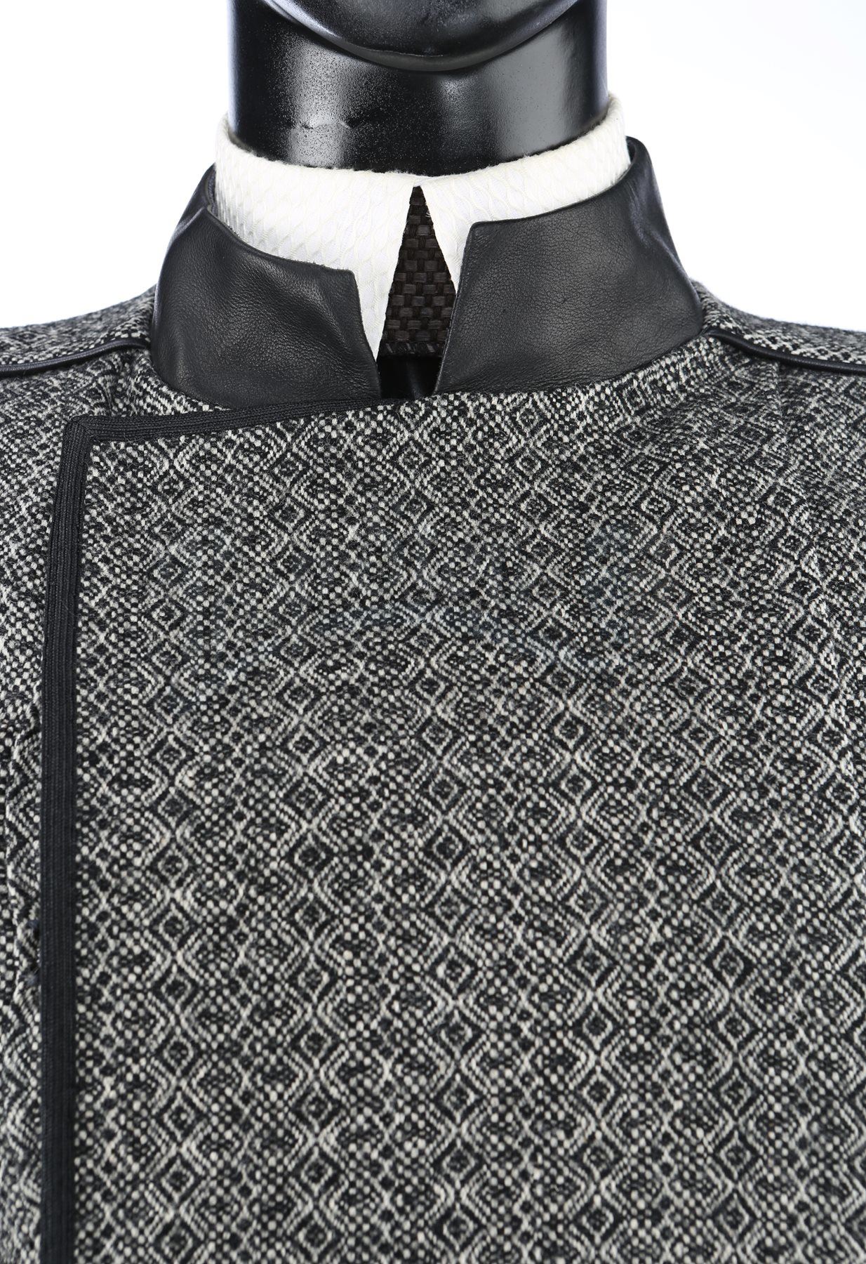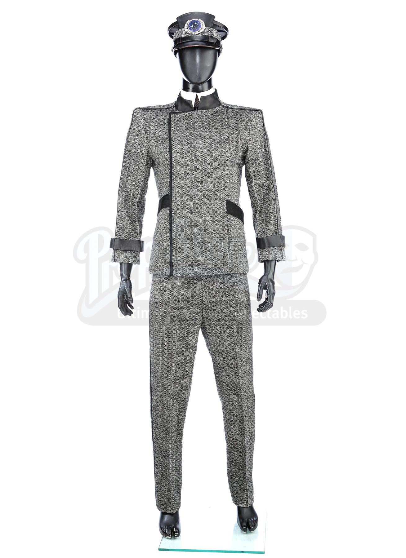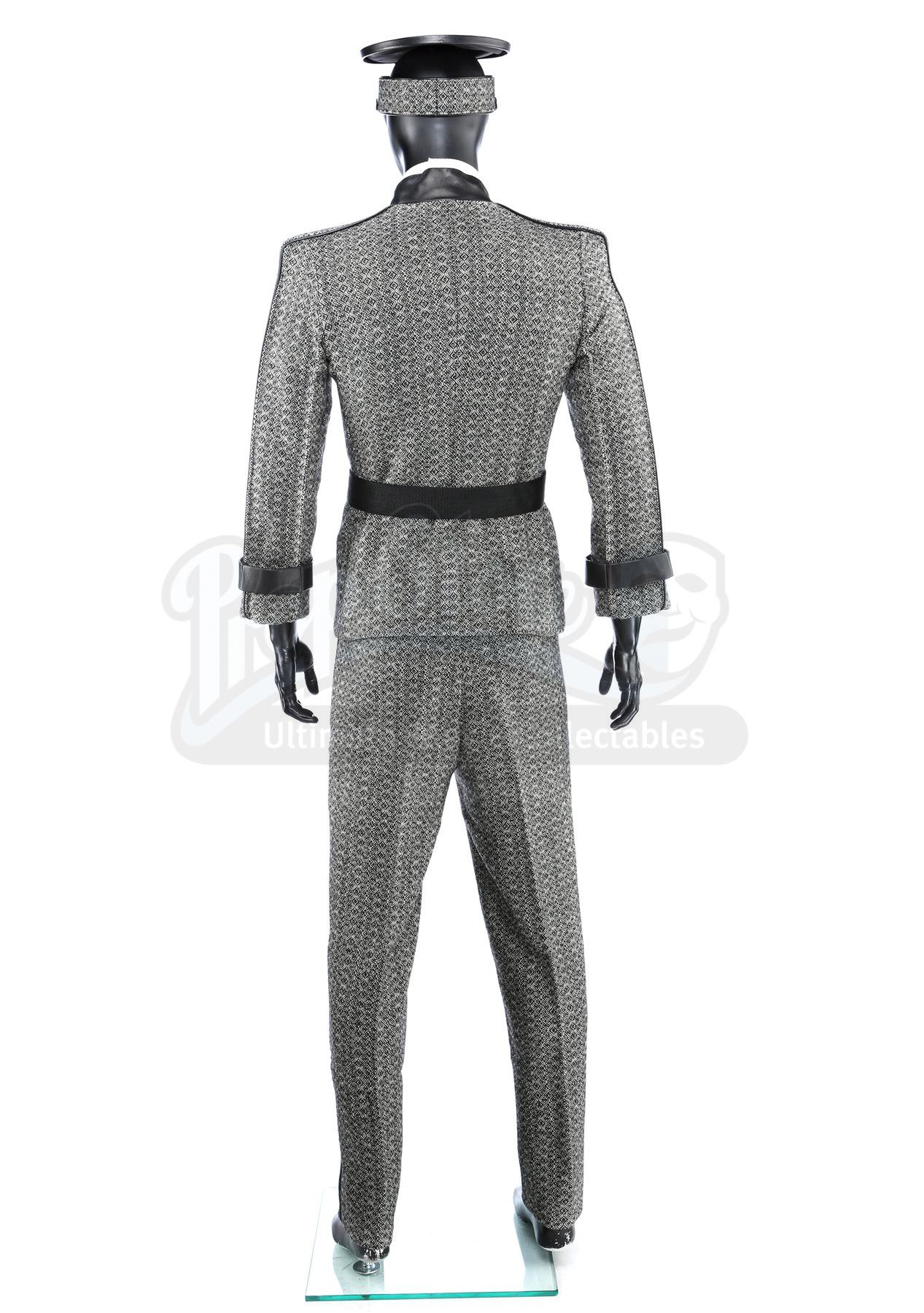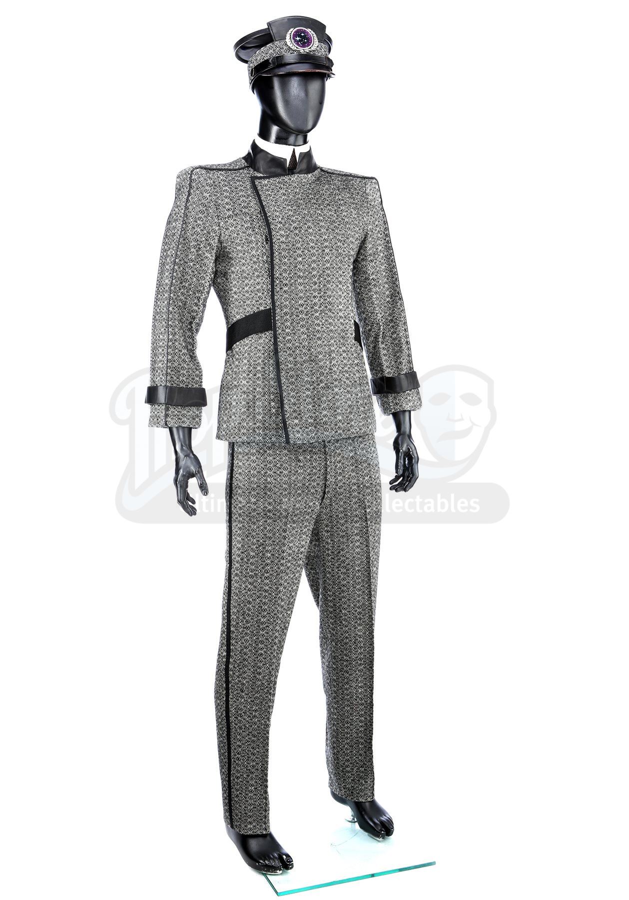 The custom-made uniform is largely made of furniture upholstery fabric with faux leather components. The cap features a unique leather top that is only attached at the front, with the sides completely open. The front of the cap includes a lenticular Federation pin. The double-breasted jacket features a leather collar and cuffs and sturdy piping at the seams. The pants are made of the same material with a zipper fly and hook-and-bar closure.