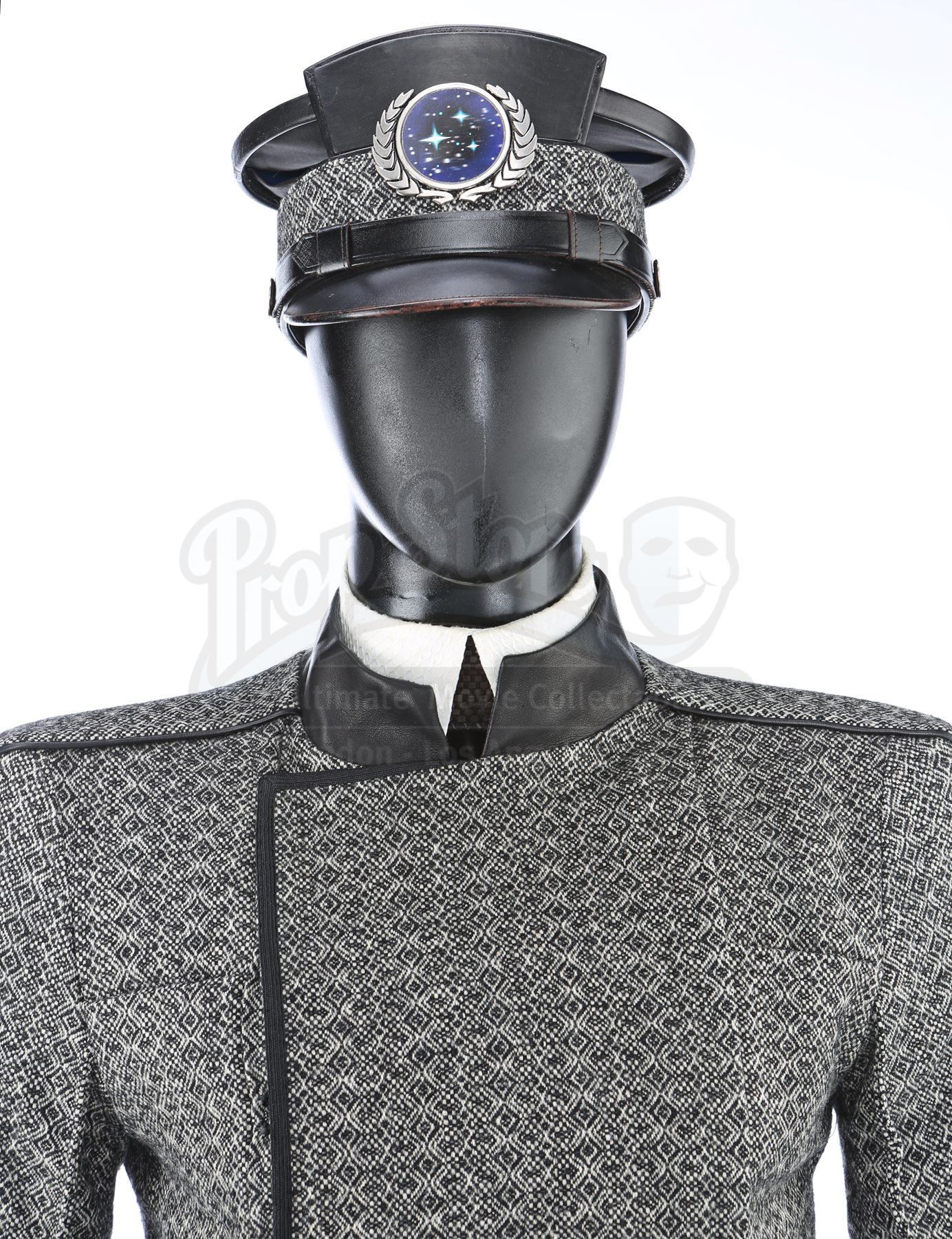 A men's Starfleet council member uniform from Star Trek. Starfleet admirals wore their uniforms when Captain Kirk attended a disciplinary hearing for his actions in the Kobayashi Maru simulation. The uniform includes a cap, jacket (marked size 38), hook-and-loop collar, belt, and pants (marked size 34).