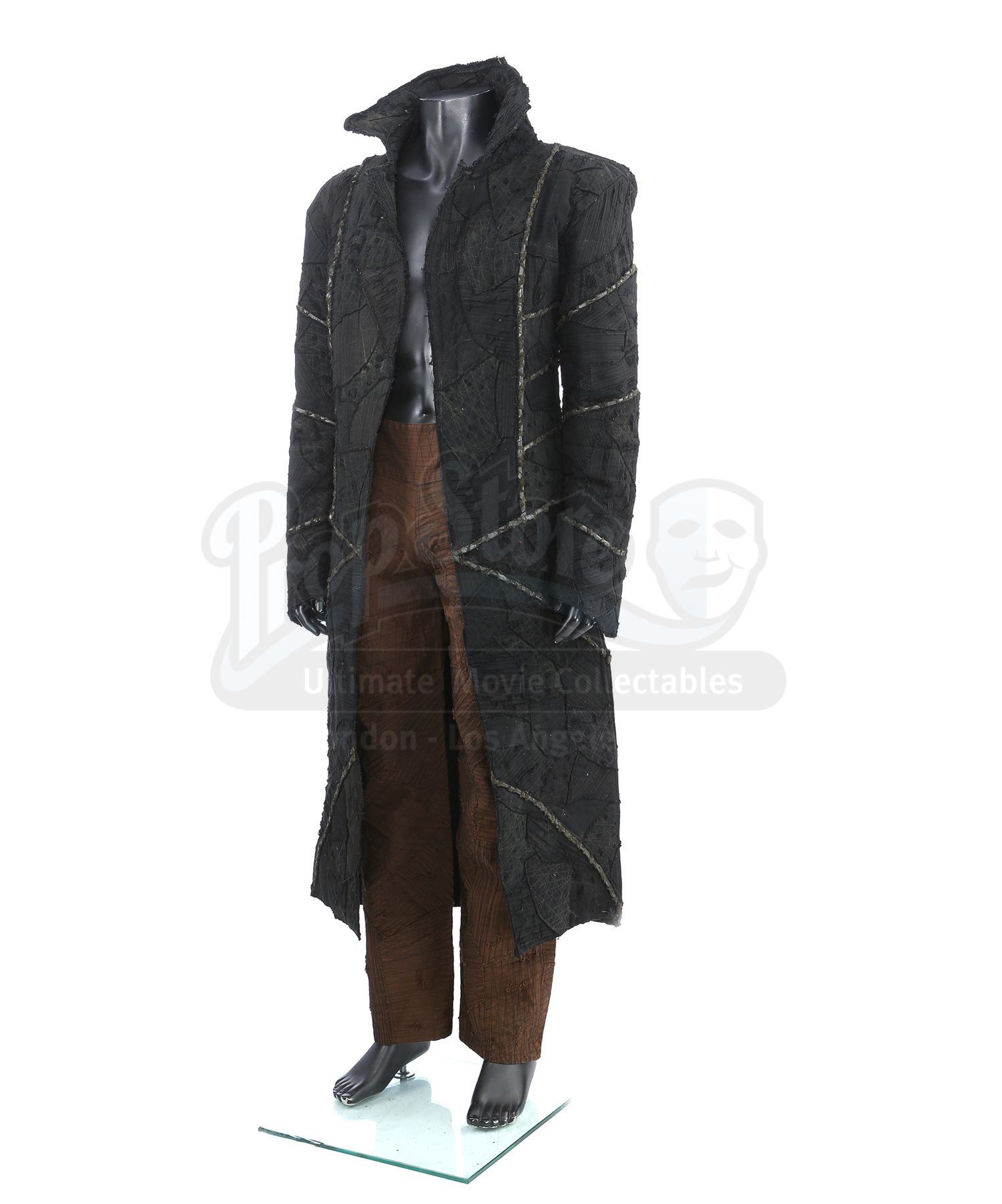 The costume was developed using a ragged top-stitched synthetic fabric with frayed edges to reflect the Romulans' work on a mining planet. The black floor-length coat features a wide collar and decorative stitching to create a patchwork of fabric. The interior is lined with cotton and shows the Romulan insignia painted just below the back of the neck. Stitched inside the coat is a wardrobe label for the actor.