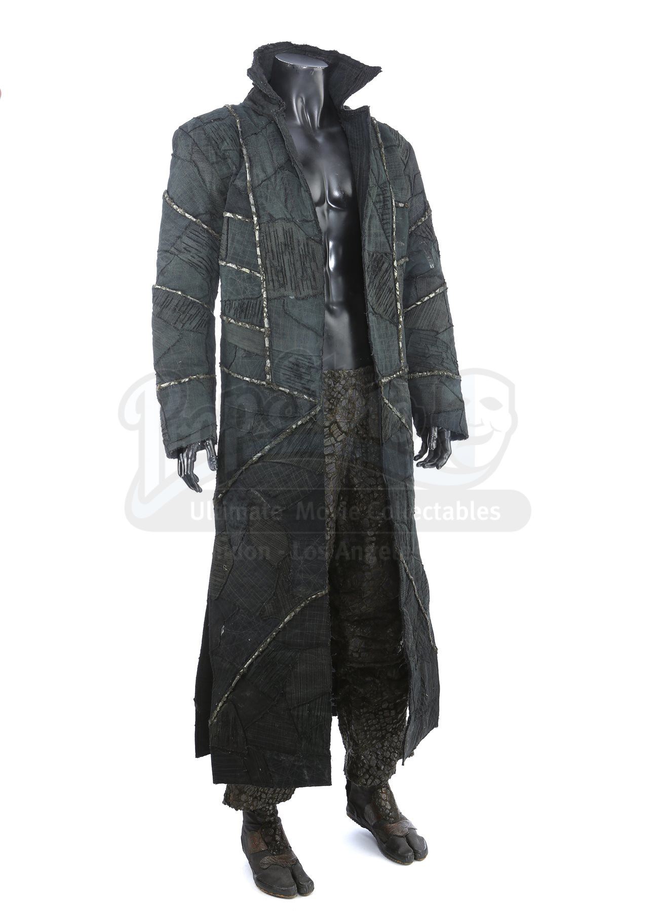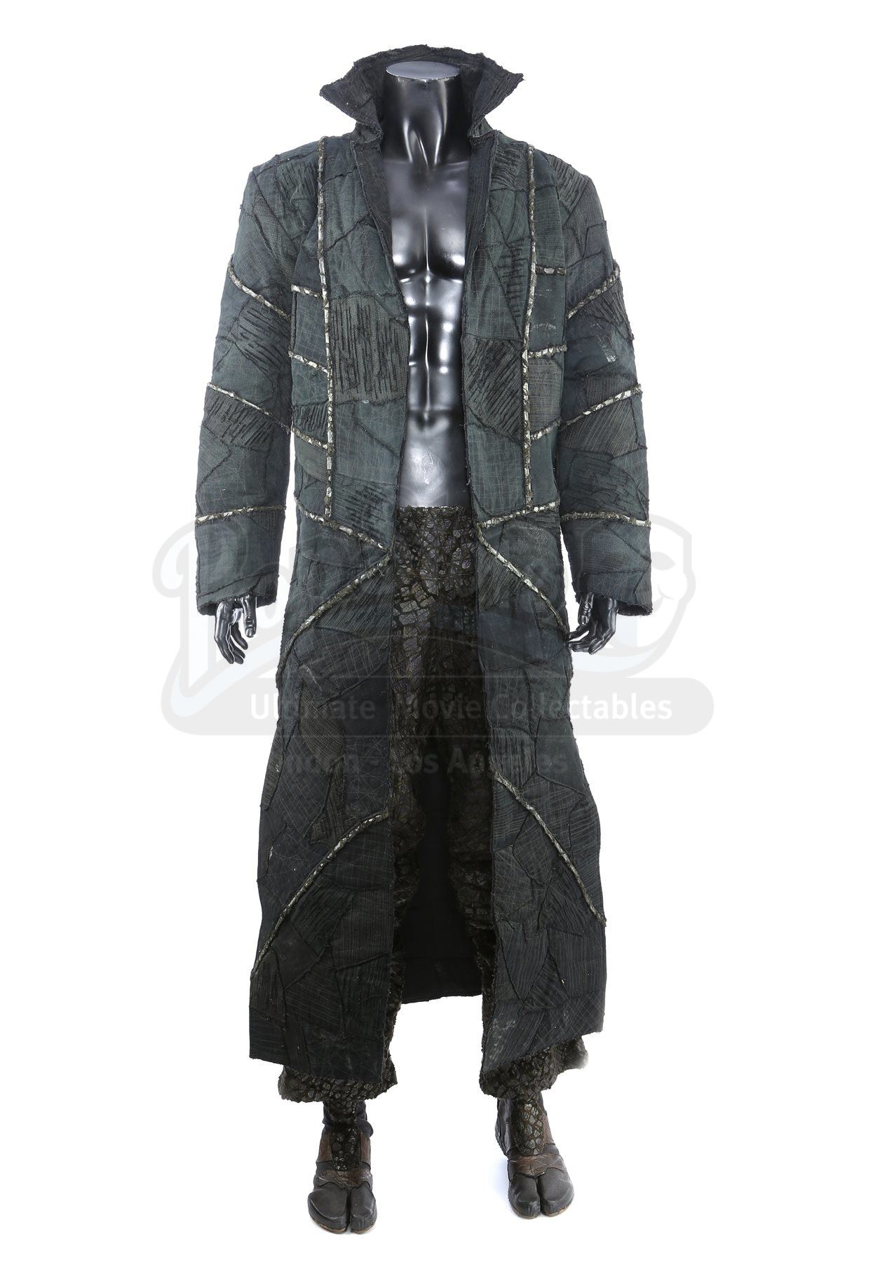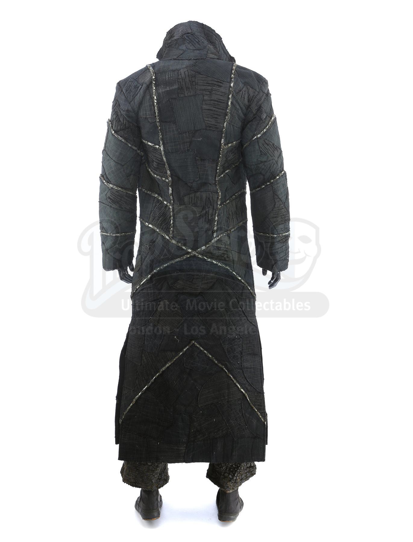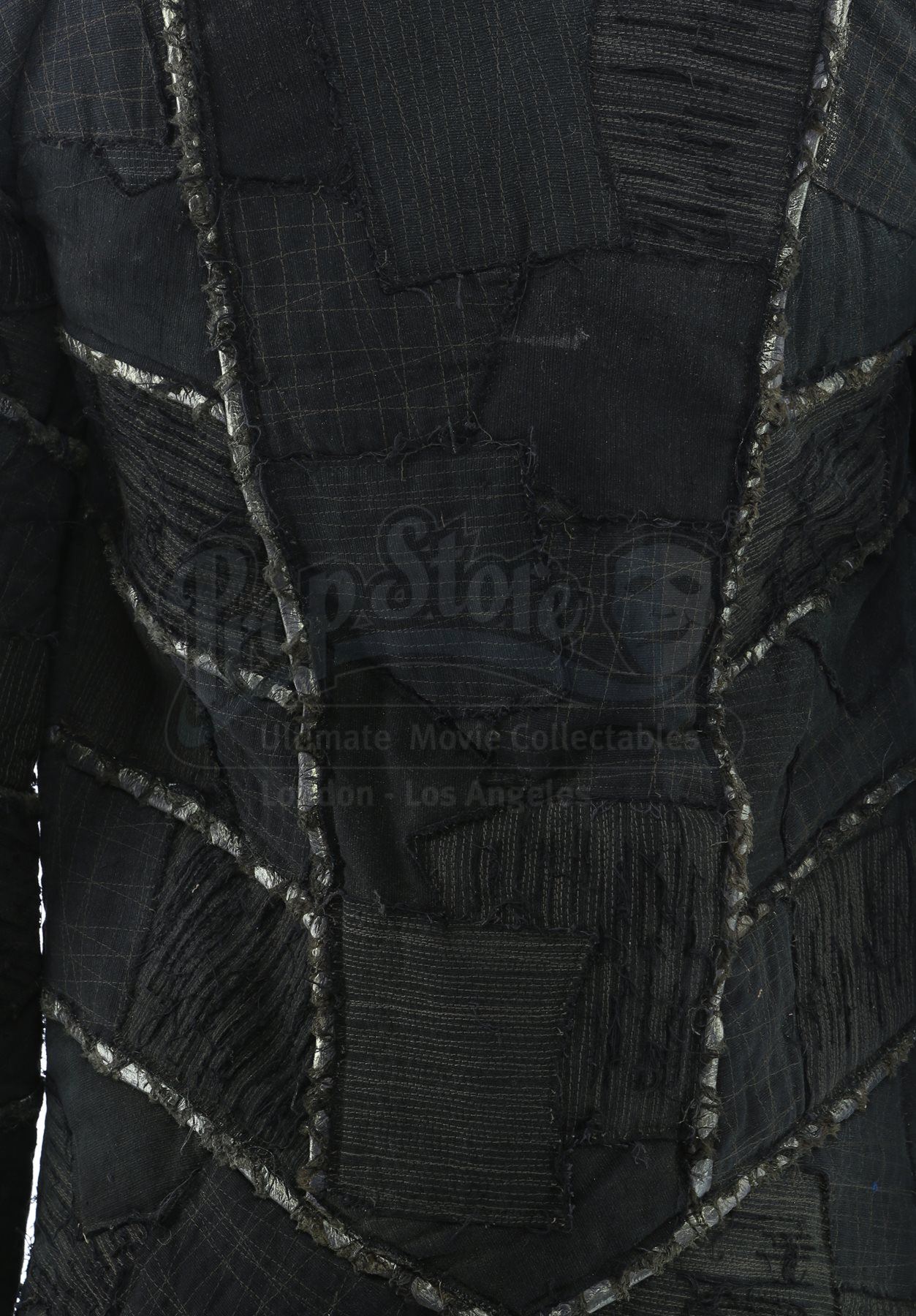 The costume was developed using a ragged top-stitched synthetic fabric with frayed edges to reflect the Romulan's work on a mining planet. The black floor-length coat features a wide collar and decorative stitching to create a patchwork of fabric. The interior is lined with cotton and shows the Romulan insignia painted just below the back of the neck. Inside the coat is a strip of tape with a hand-written annotation that reads "Stunt #15 AKA Nero Outfit #2".