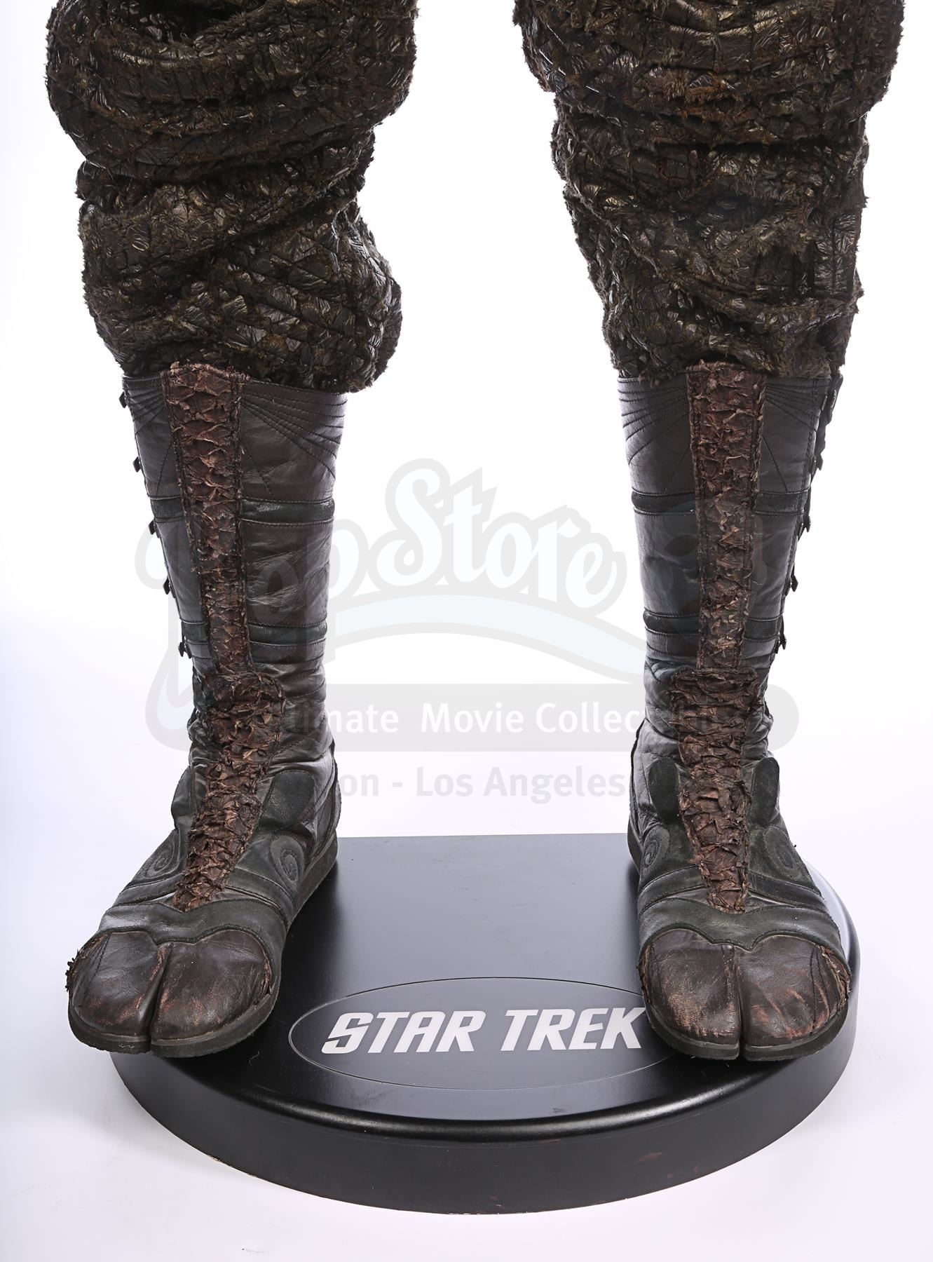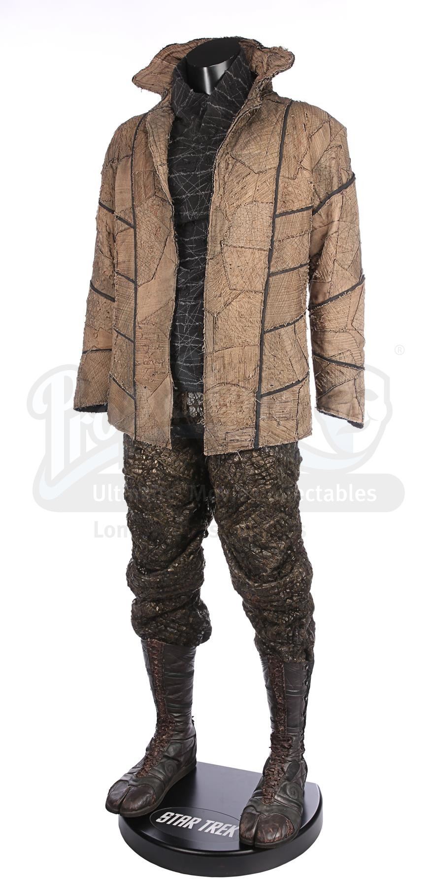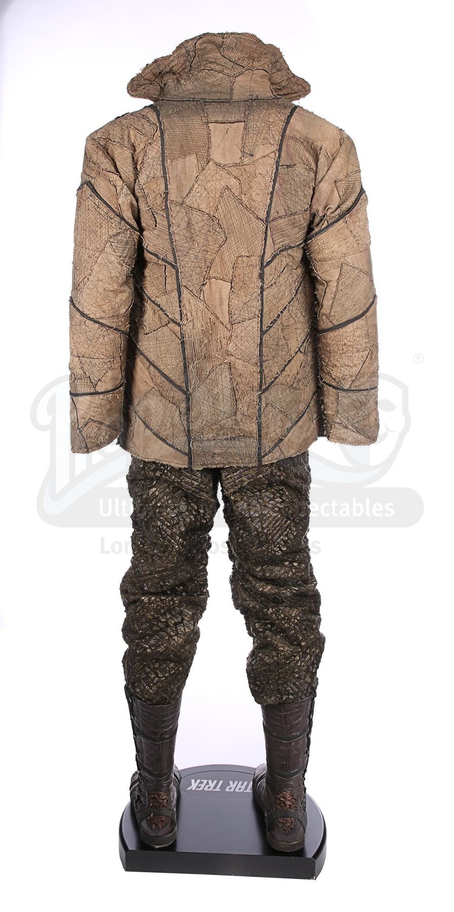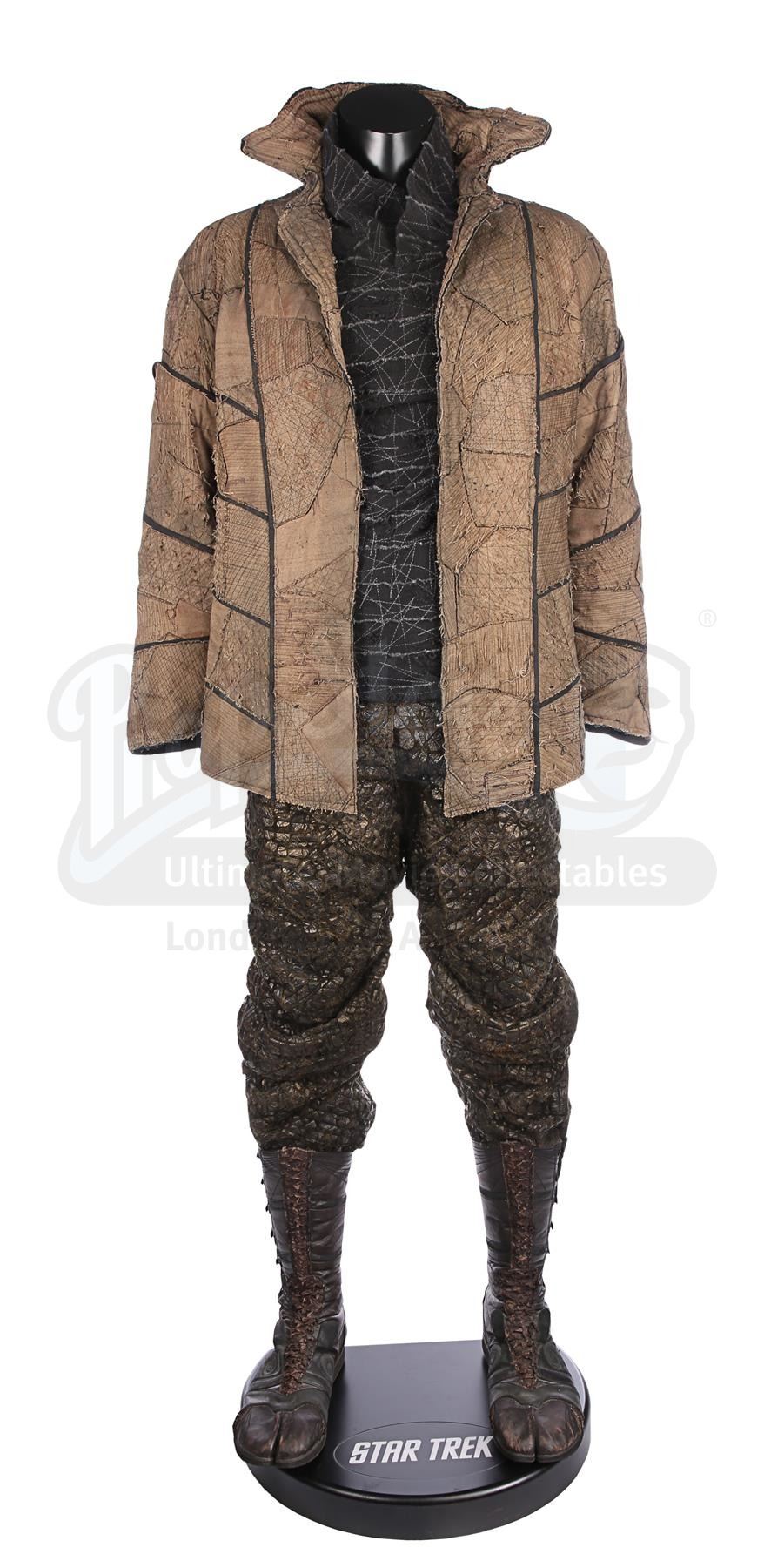 The jacket, top and trousers all feature Michael Kaplan designer labels, with handwritten notes marked "Richard Arnold"; Arnold is a well-known Star Trek consultant who had an uncredited role in the film. The costume has been intentionally distressed and is presented on a custom-made mannequin display, which stands on a base bearing the film's title. Dimensions (displayed): 38 cm x 66 cm x 186 cm (15" x 26" x 73 1/4")