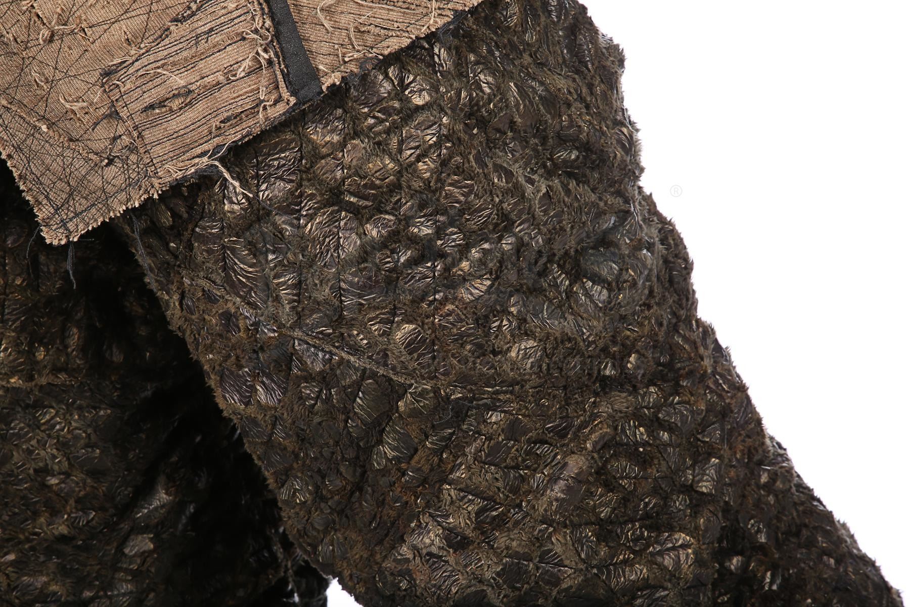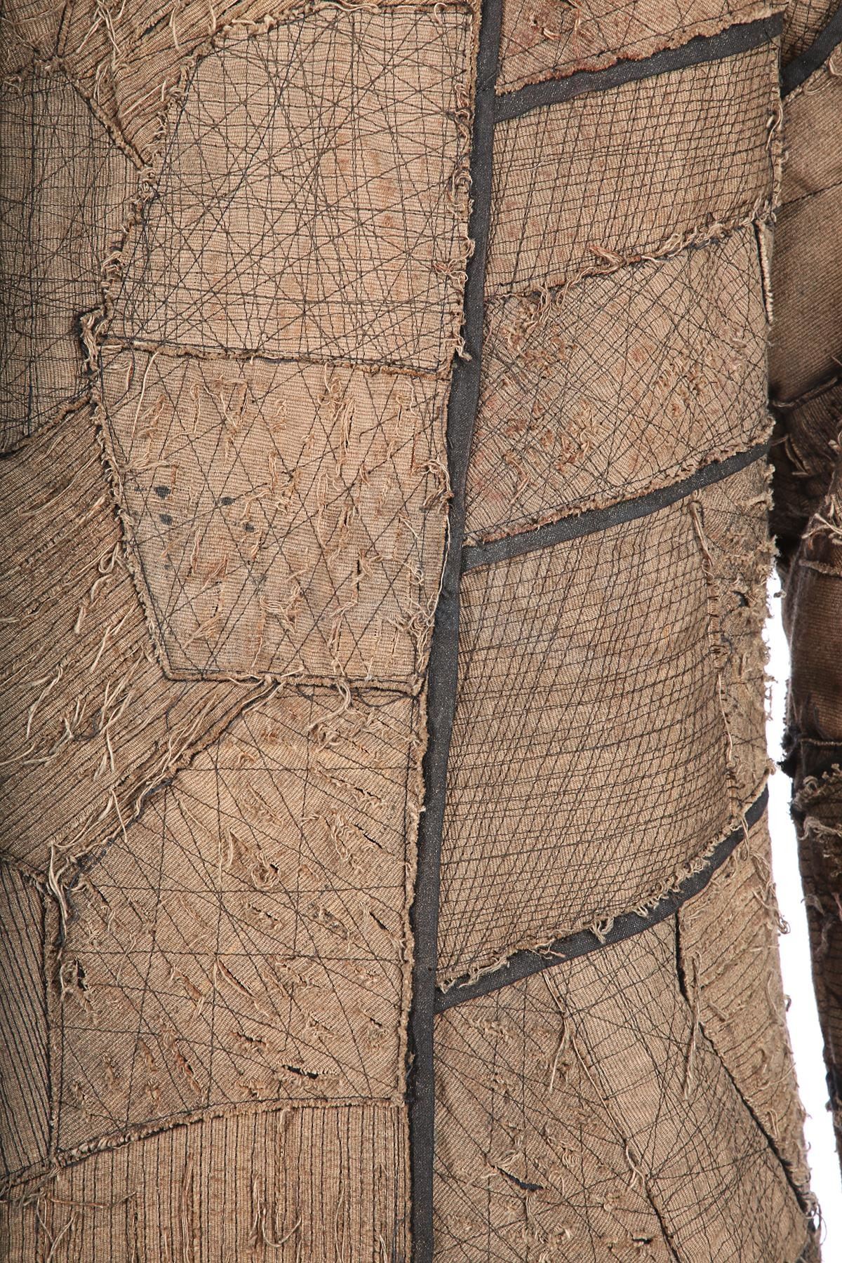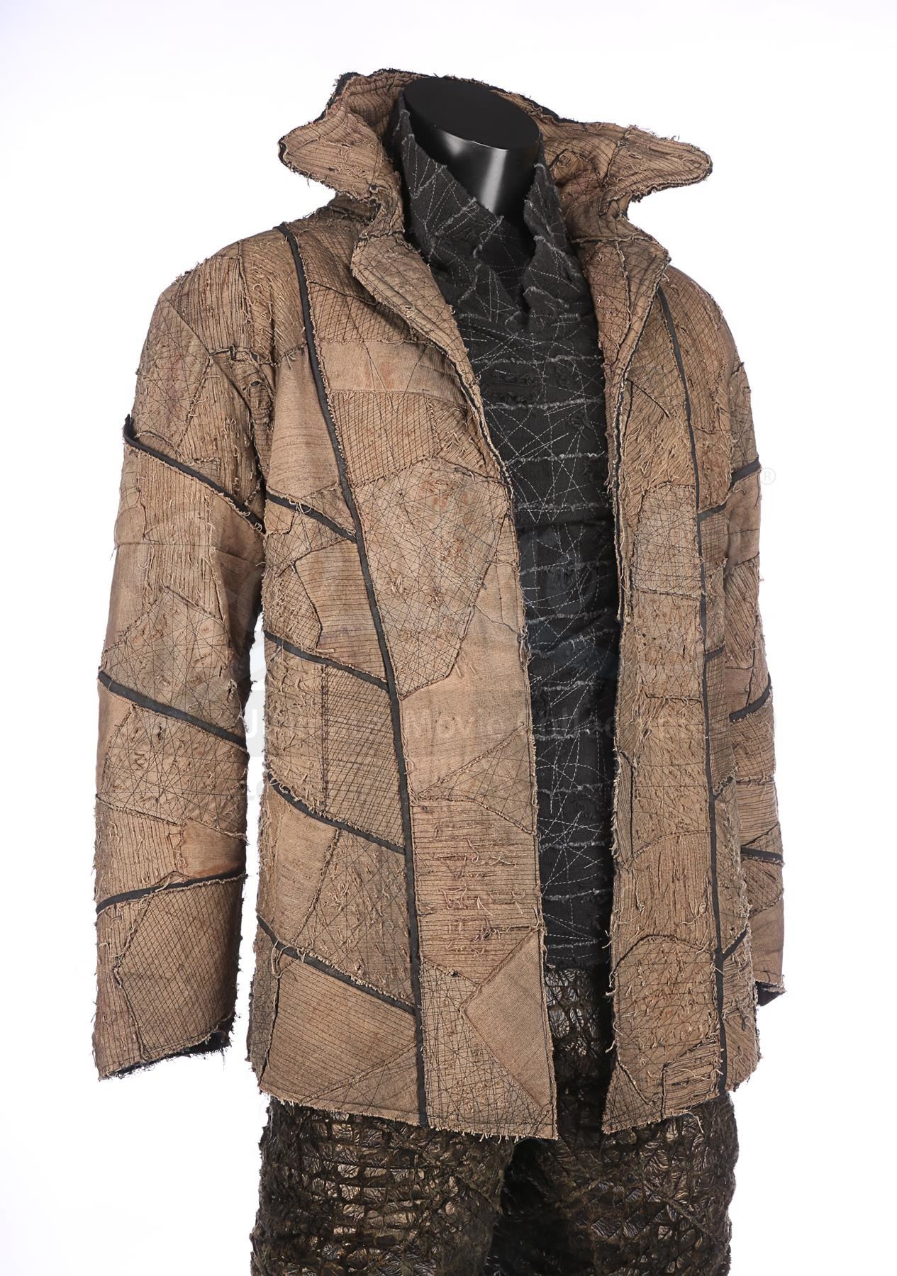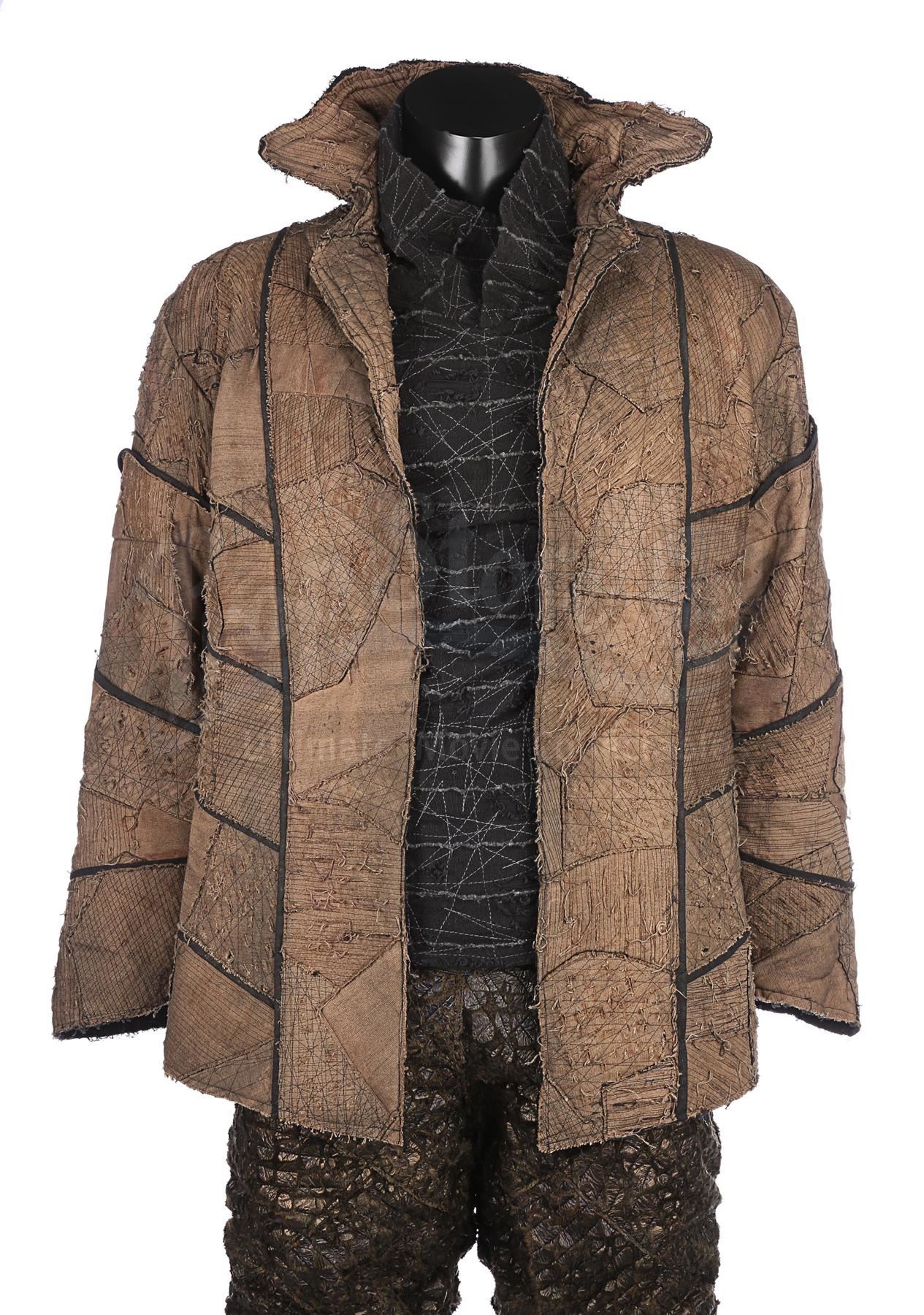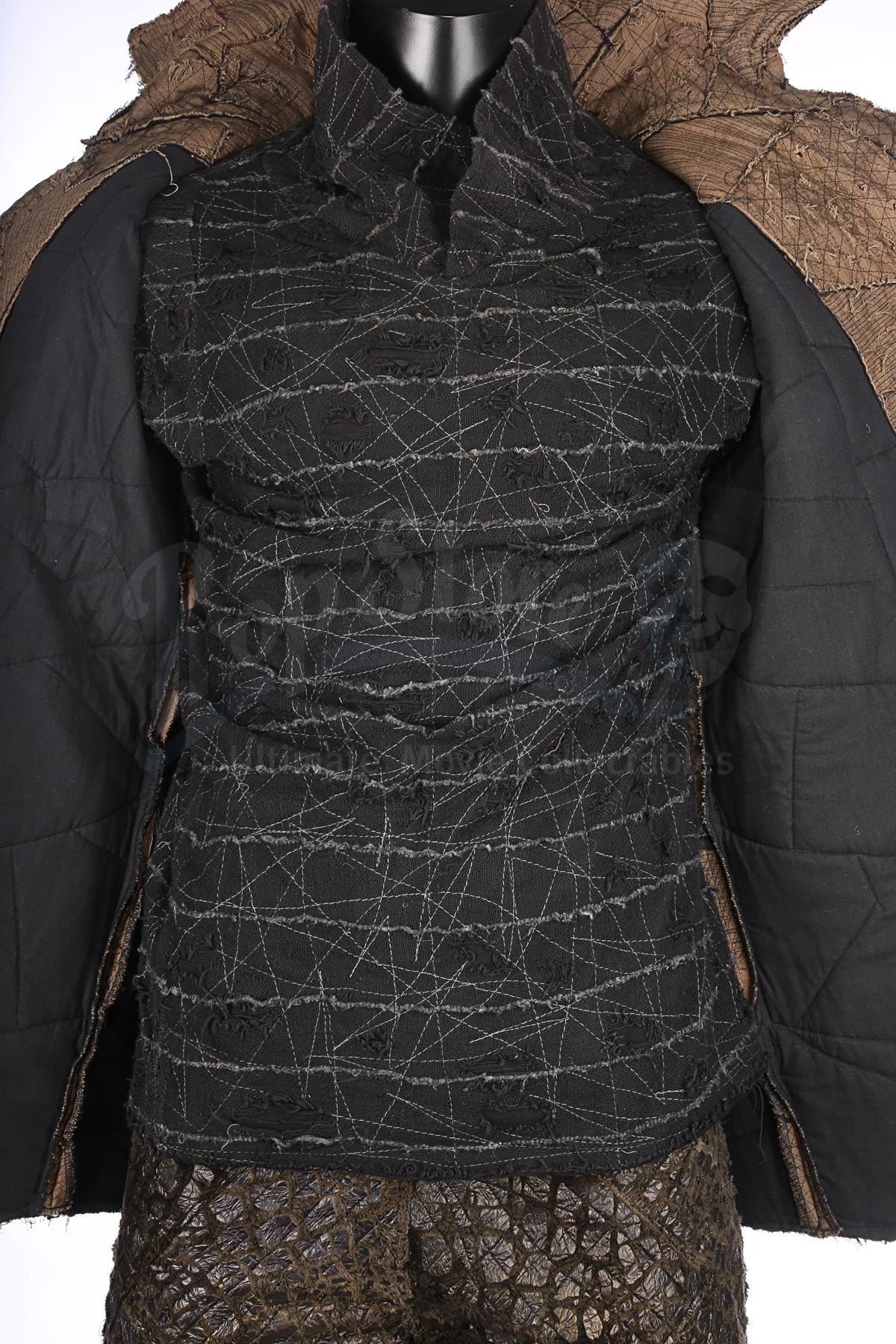 This costume features a jacket, top, pair of trousers and a pair of lace-up boots. The jacket features a quilted patchwork design with decorative stitching, and the collar features a wire armature to maintain its shape. The black top also features decorative stitching, while the trousers have a scaled effect achieved using a thin plastic material. The brown stitched-pattern faux-leather boots are split-toed and lace up at the side.