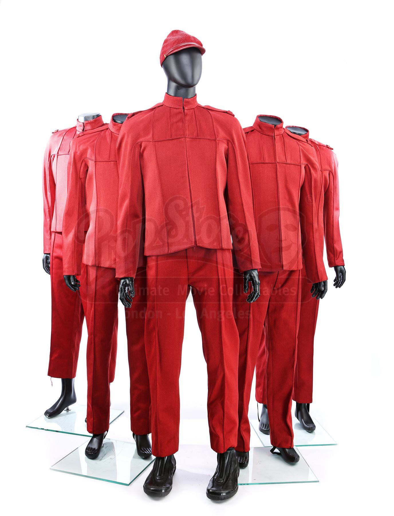 A set of five men's Starfleet cadet uniforms from Star Trek. Cadets wore their red uniforms while attending Starfleet Academy in San Francisco. The set includes five Starfleet Academy jackets (two medium, three large), five turtleneck sweaters (all large), five pairs of pants (two medium, three large), one cap, and one pair of shoes (marked U.S. size 12M).