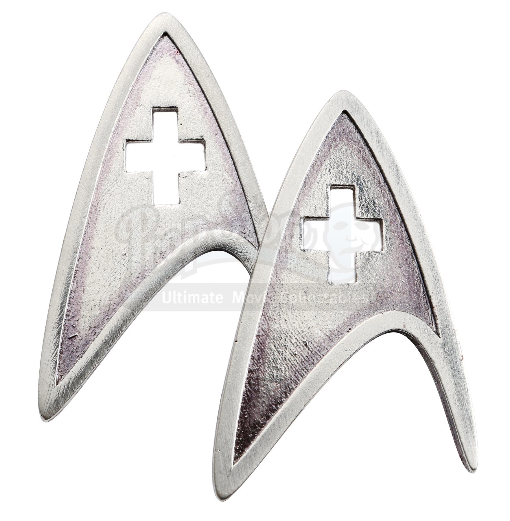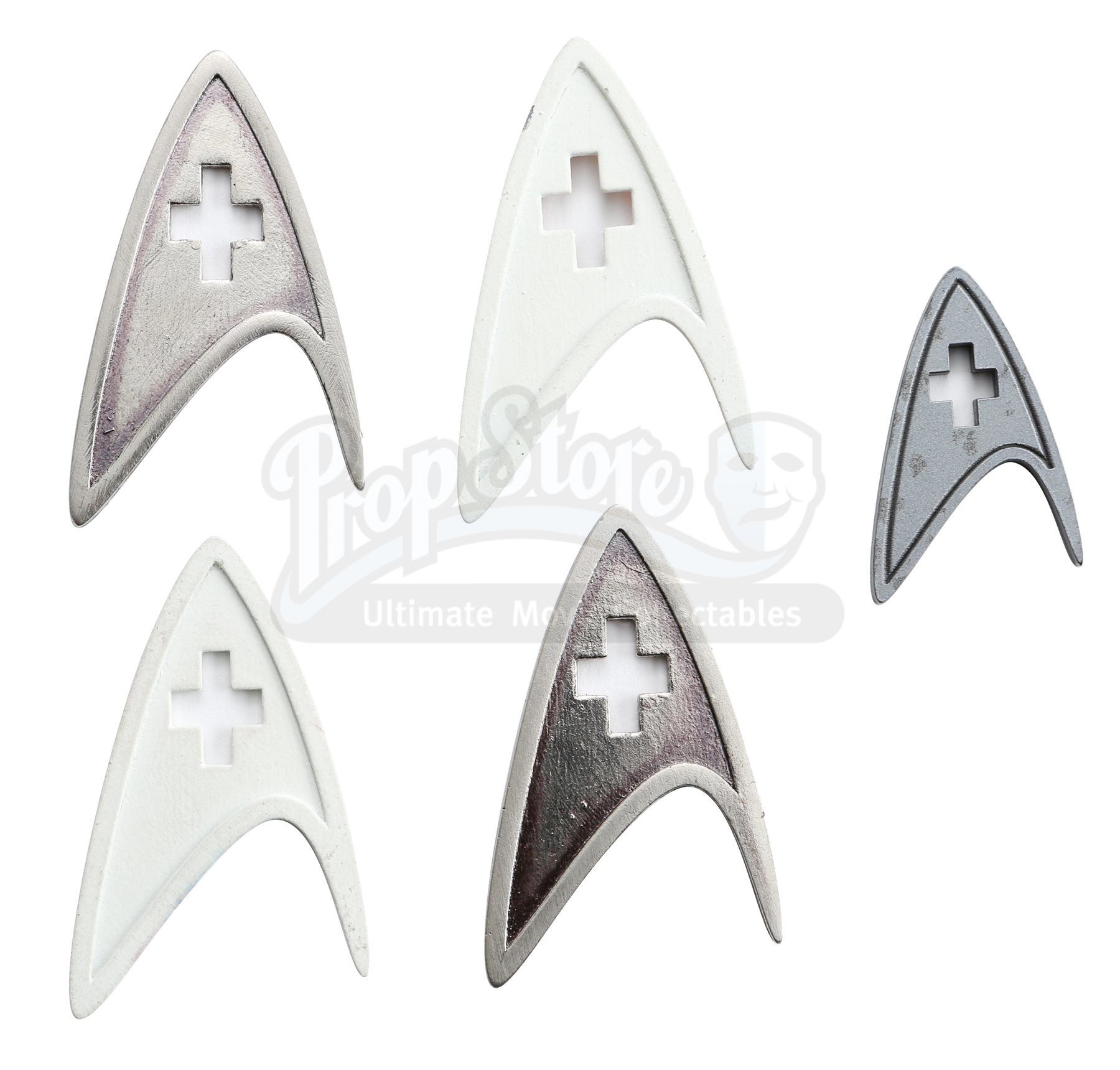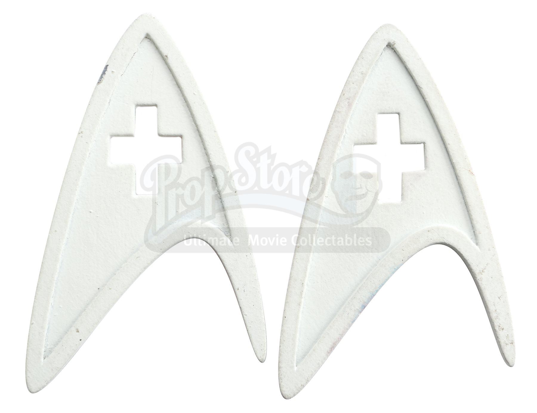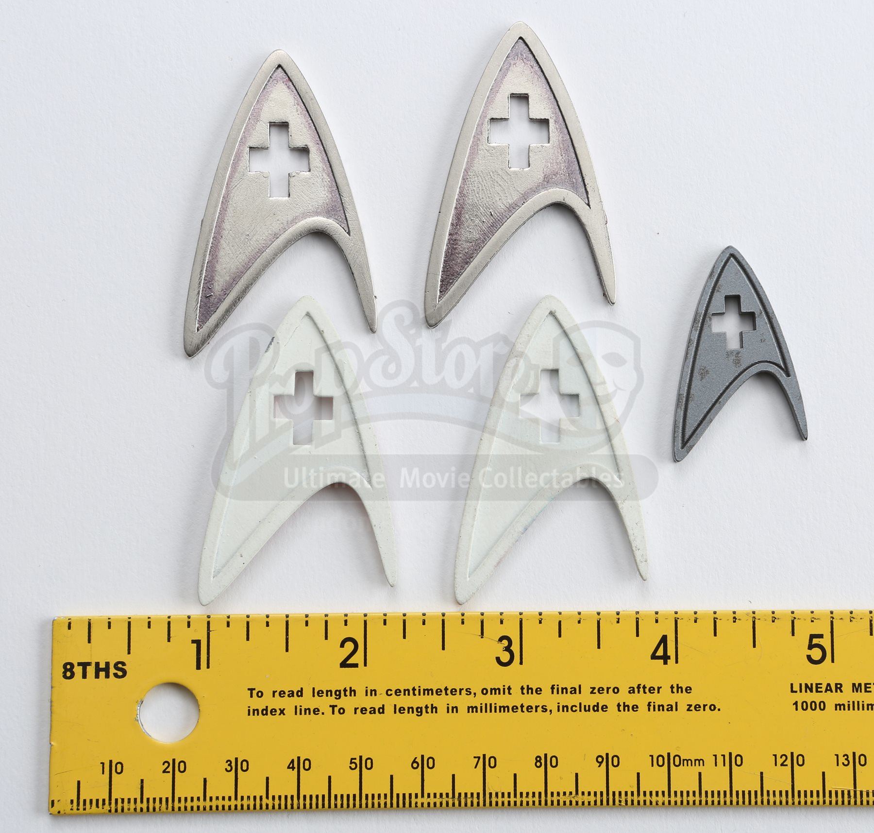 A set of prototype Starfleet medical division insignias from Star. Medical pins were attached to medical staff uniforms within the Starfleet sciences division. This lot includes five prototype insignias, each made of resin, with a cross cut out in the center. Two are painted white, two are painted metallic silver and the fifth is unpainted and smaller in scale to the others. Dimensions: 1 ½" x 2" x ¾" (4 cm x 5 cm x 2 cm)Estimate: $1000 - 1500*Estimated sale price; sold without reserve.