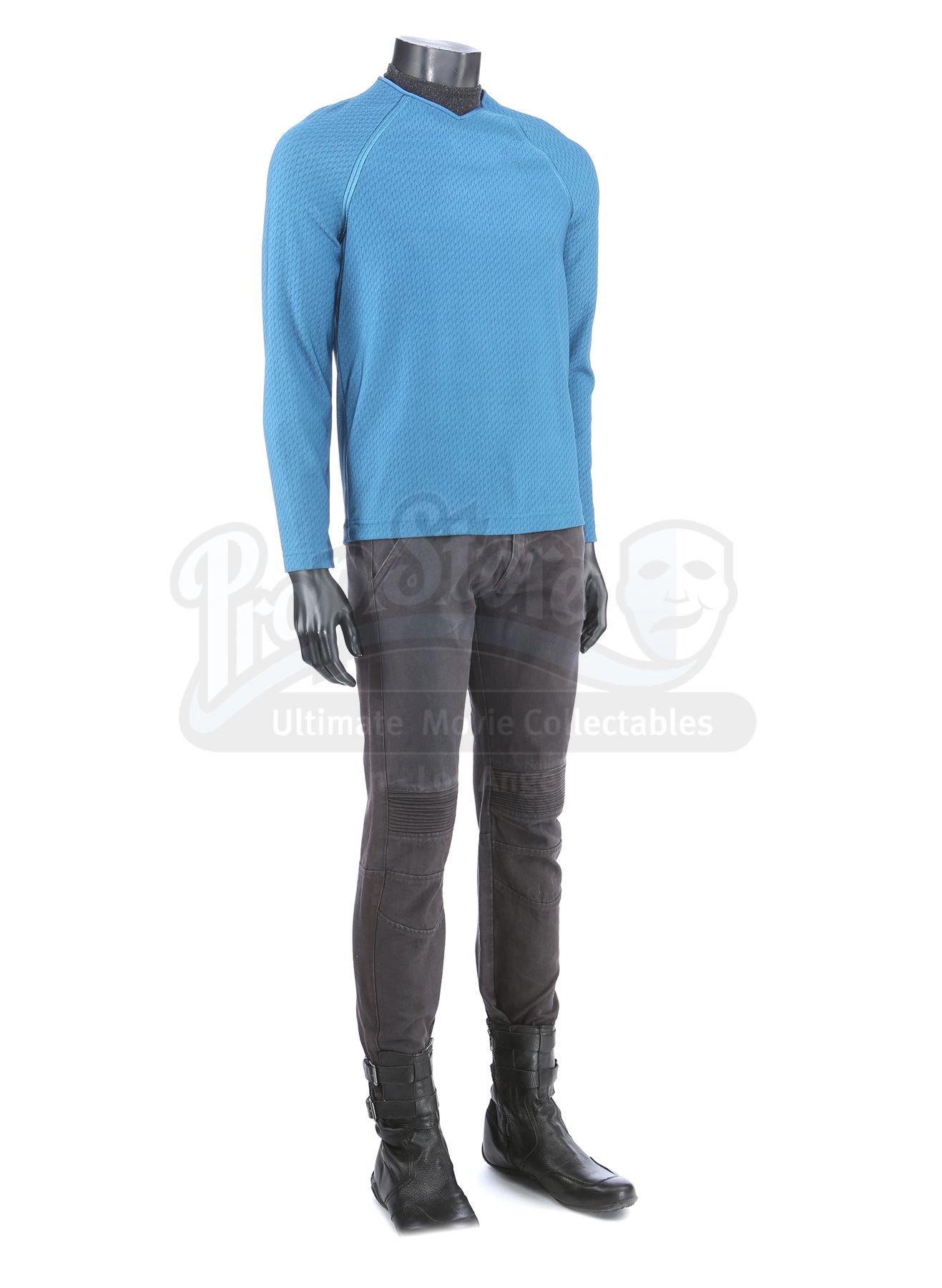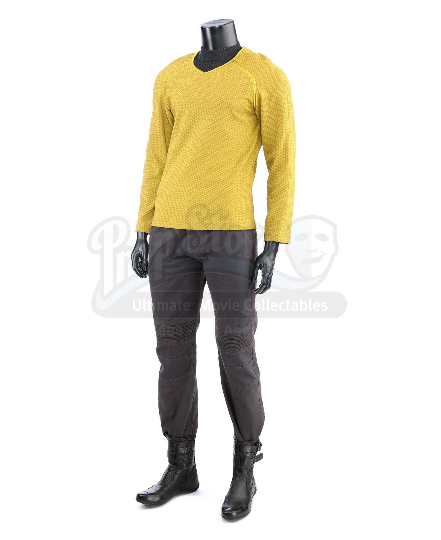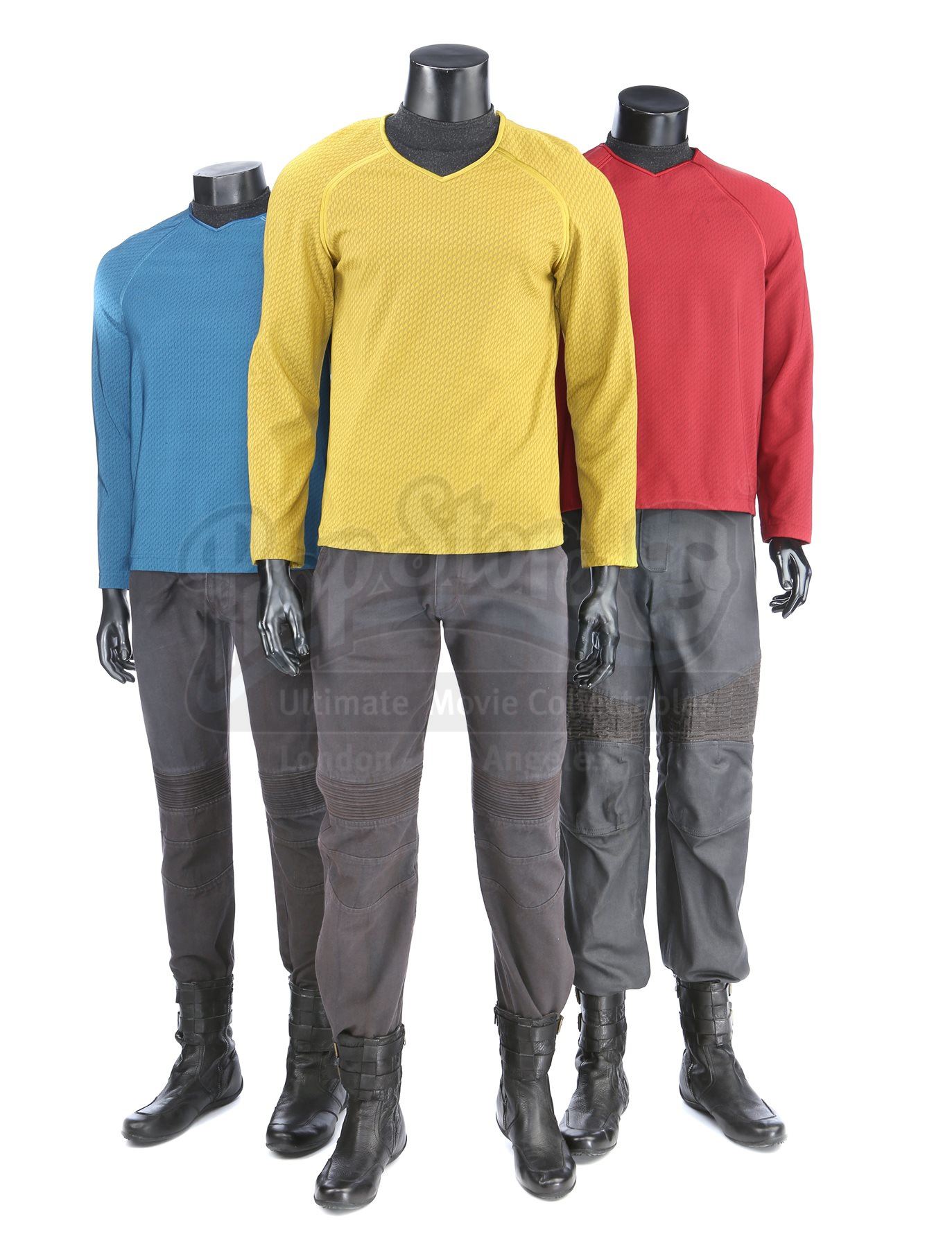 A set of three Starfleet uniforms from Star Trek and reused in Star Trek Into Darkness. Enterprise staff in the wore their uniforms while aboard the Enterprise throughout the first two films. The set includes three tunics (one marked 42, one approximate size medium, one approximate size large), three semi-mock turtleneck undershirts (all extra large), three pairs of pants (one pair approximate size 32, two pairs marked size 38), and three pairs of boots (marked U.S. sizes 10.5, 11.5 and 12). Made for the first film and reused in the sequel, the lot includes operations, science, and command long-sleeved officer tunics made of Spandex, each of which have piping around the collar and feature a printed optical repeat Starfleet insignia pattern. Made specifically for the sequel, the gold tunic also features a hidden zipper at the left shoulder. The undershirts consist of grey polyester collars that are stitched to the top of a modified Spandex sport shirts. The dark grey twill pants have ribbed fabric above the knees with one pair made specifically for the sequel. Also included are three pairs of black leather boots with rubber soles. One tunic and one pair of pants also feature hand-written wardrobe labels marked with the actors' names. Estimate: $2500 - 3500*Estimated sale price; sold without reserve.