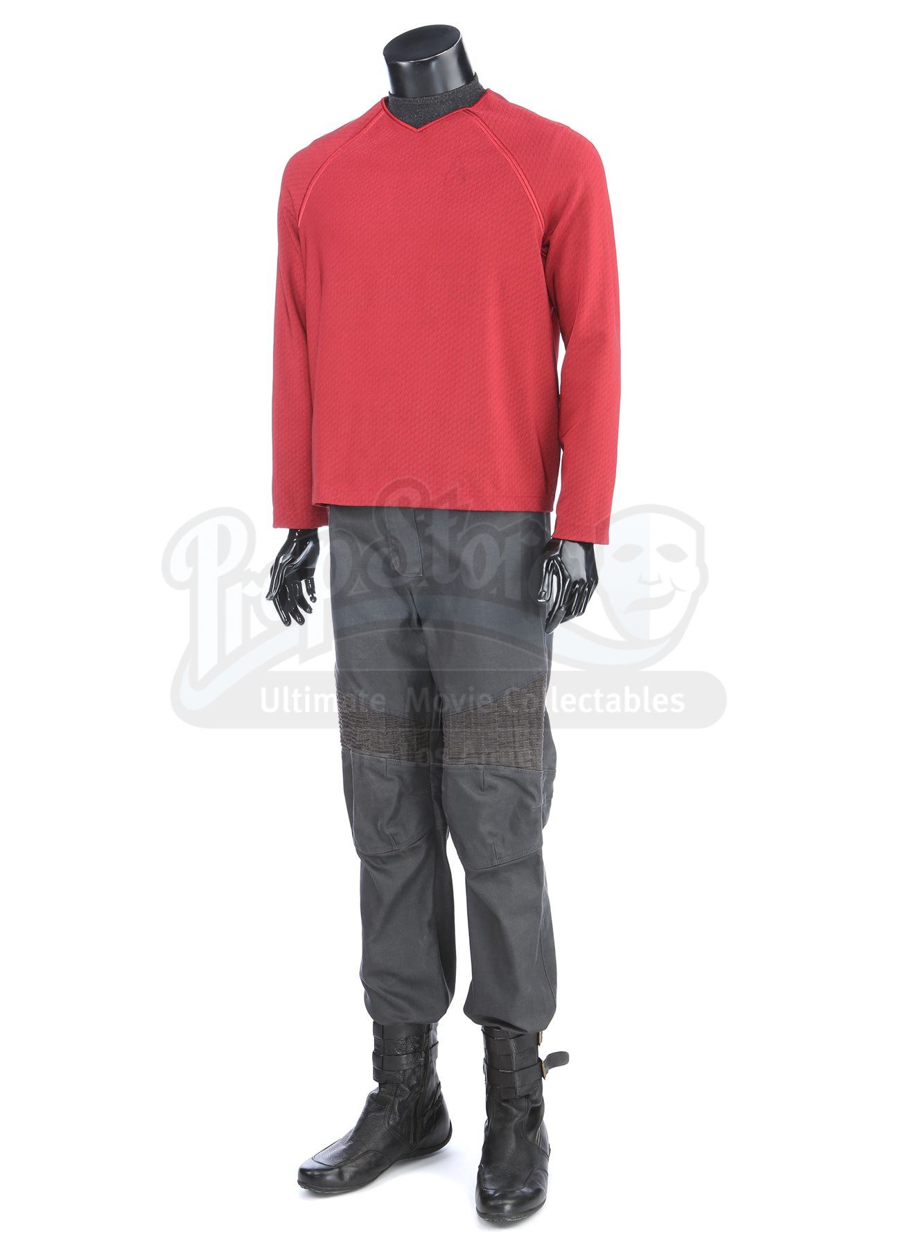Made for the first film and reused in the sequel, the lot includes operations, science, and command long-sleeved officer tunics made of Spandex, each of which have piping around the collar and feature a printed optical repeat Starfleet insignia pattern. Made specifically for the sequel, the gold tunic also features a hidden zipper at the left shoulder. The undershirts consist of grey polyester collars that are stitched to the top of a modified Spandex sport shirts. The dark grey twill pants have ribbed fabric above the knees with one pair made specifically for the sequel. Also included are three pairs of black leather boots with rubber soles.