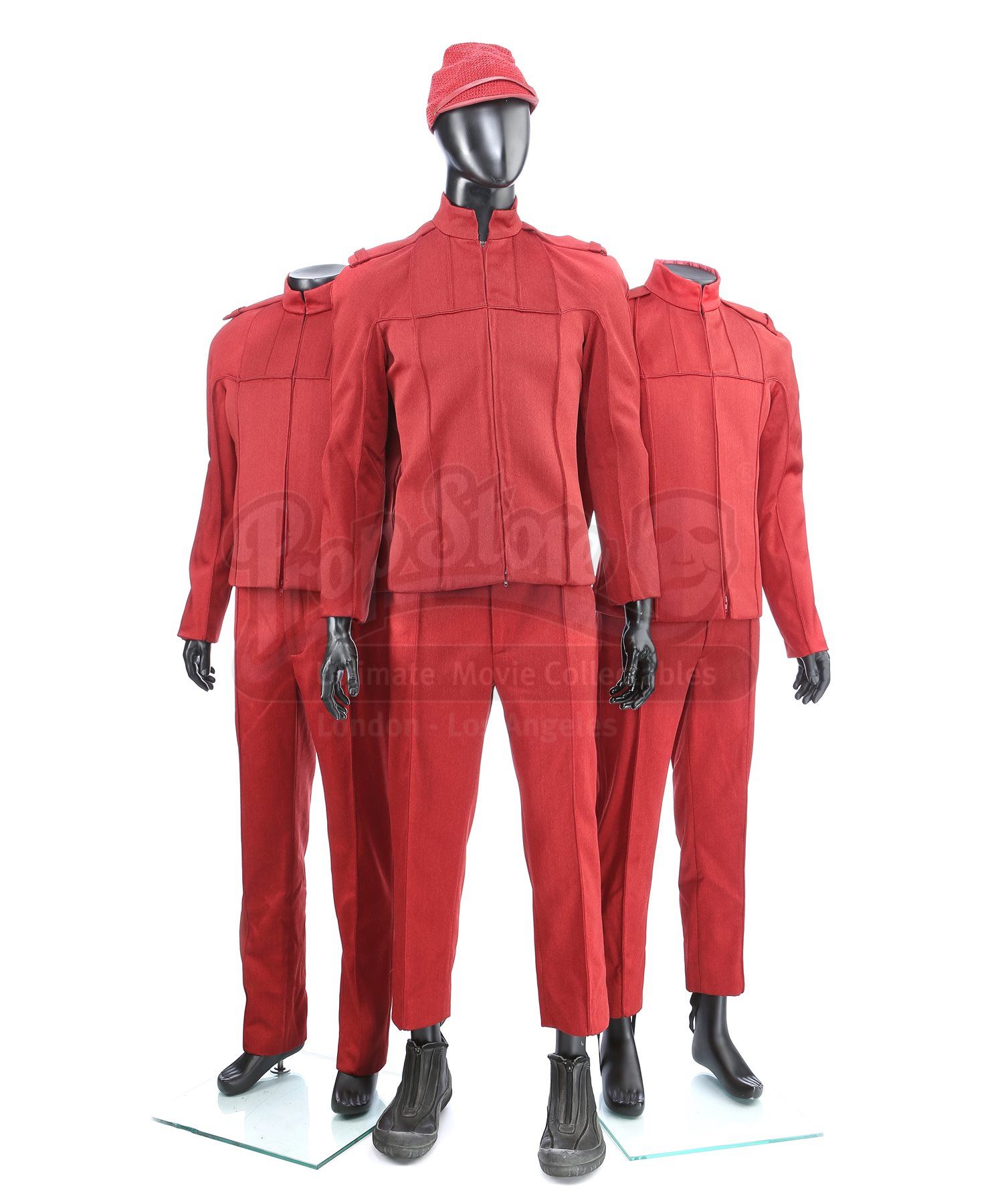A set of three men's Starfleet cadet uniforms from Star Trek. Cadets wore their red uniforms at Starfleet Academy in San Francisco. The lot includes three Starfleet Academy jackets (two medium, one marked size 40), three knit turtleneck sweaters (two large, one medium), three pairs of pants (one large, one medium and one small), one cap, and one pair of shoes (10M).