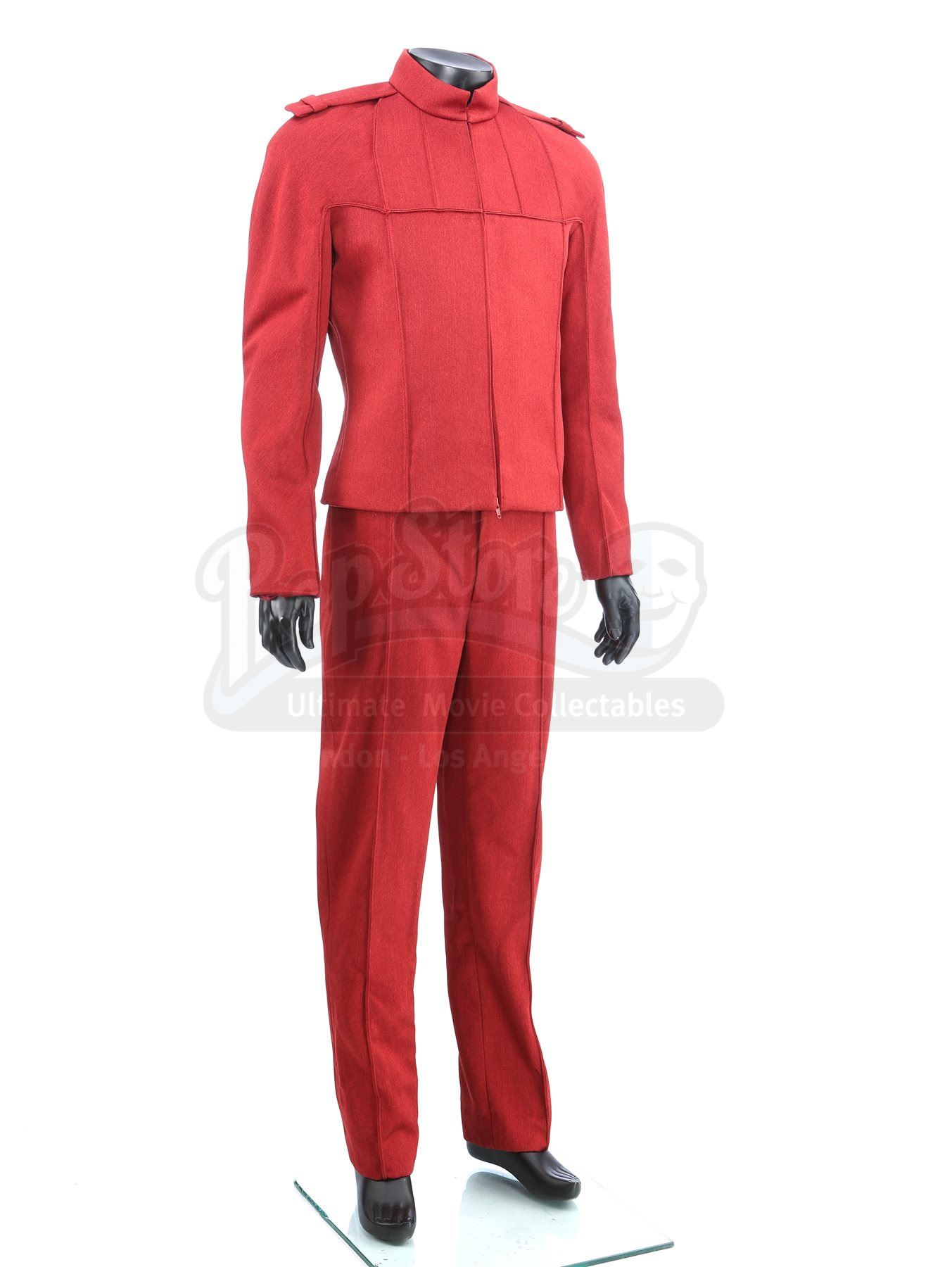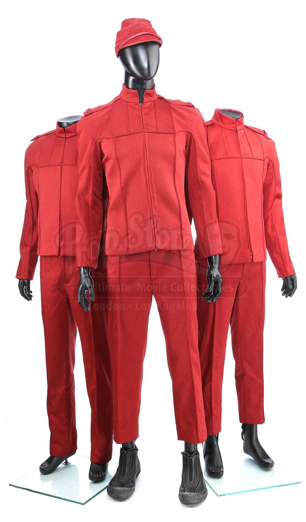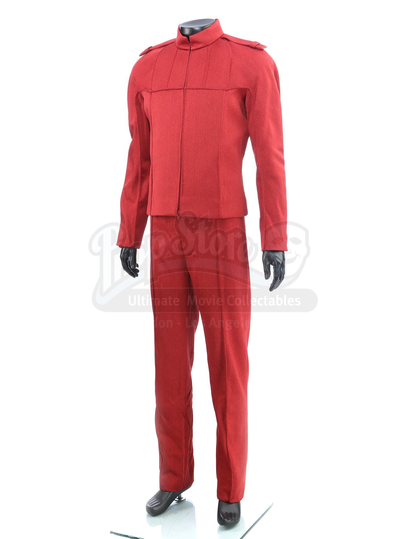 A set of three men's Starfleet cadet uniforms from Star Trek. Cadets wore their red uniforms at Starfleet Academy in San Francisco. The lot includes three Starfleet Academy jackets (two medium, one marked size 40), three knit turtleneck sweaters (two large, one medium), three pairs of pants (one large, one medium and one small), one cap, and one pair of shoes (10M). The cap features a knit outer with a black polyester lining. The jackets and the pants are made of a synthetic material with a metallic sheen and have ribbed seams. The zip-up jackets include padded shoulders and a mid-length collar. The shoes are made of leather with a front zipper closure. Estimate: $1500 - 2500*Estimated sale price; sold without reserve.