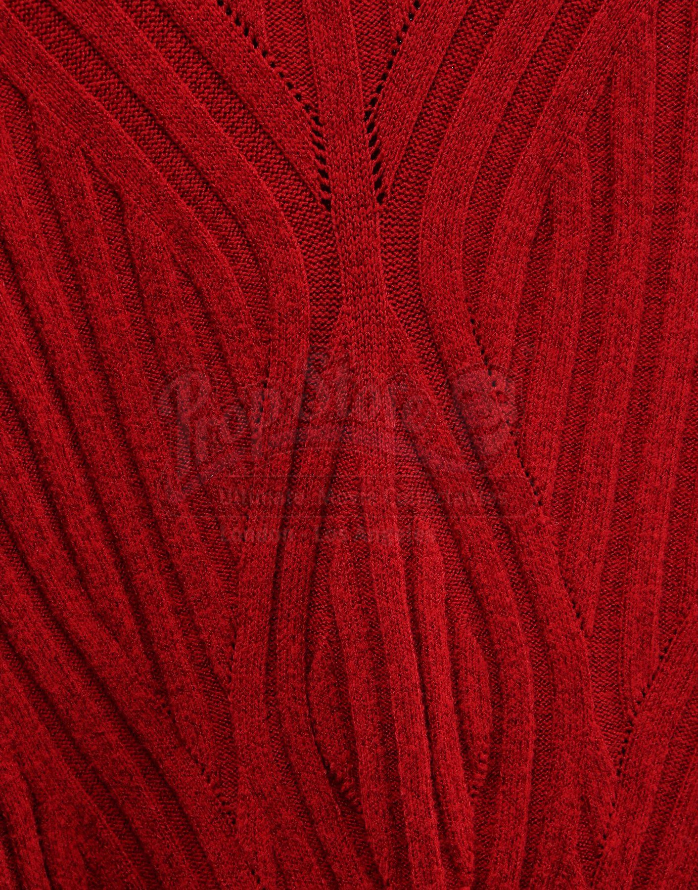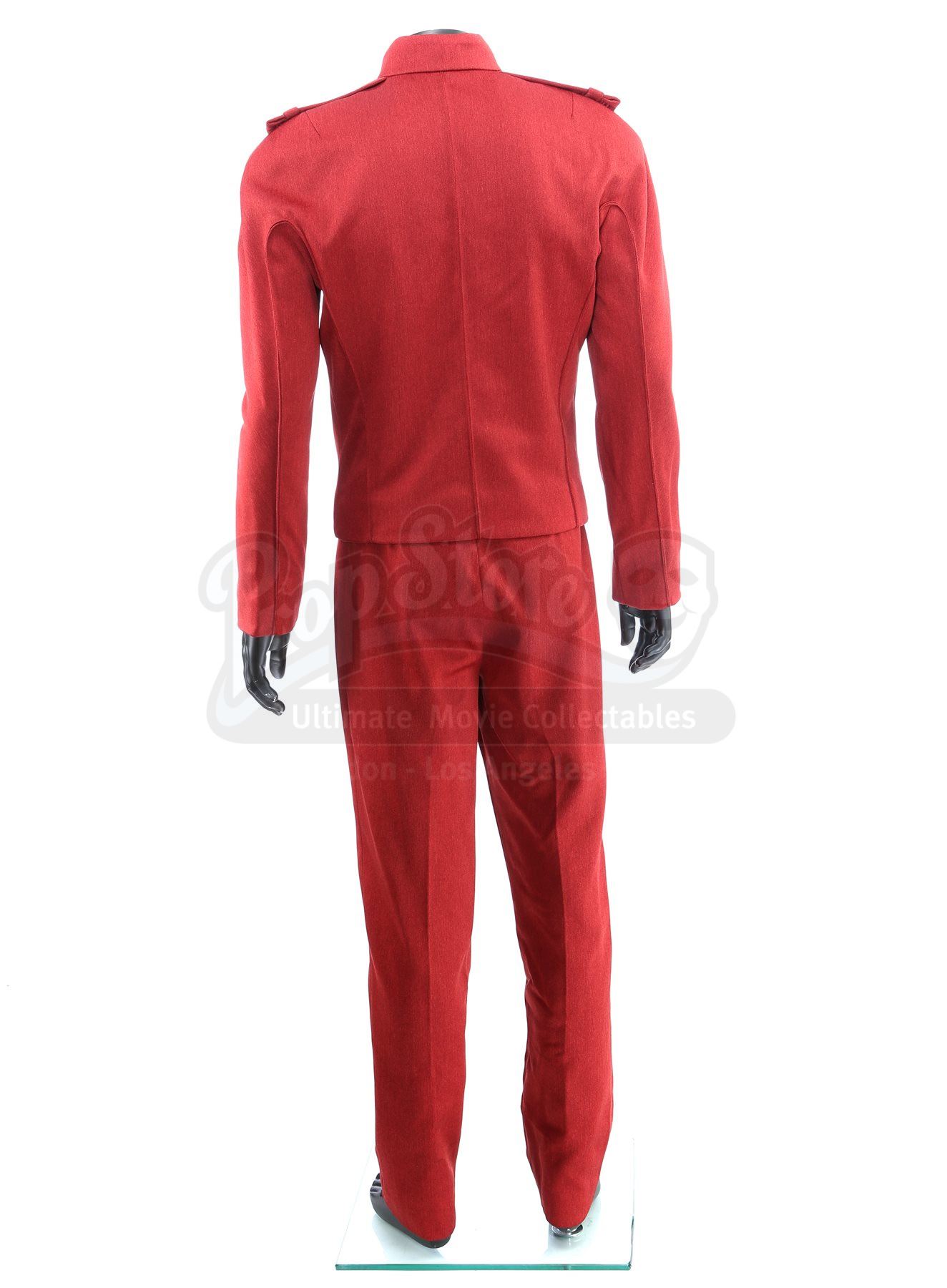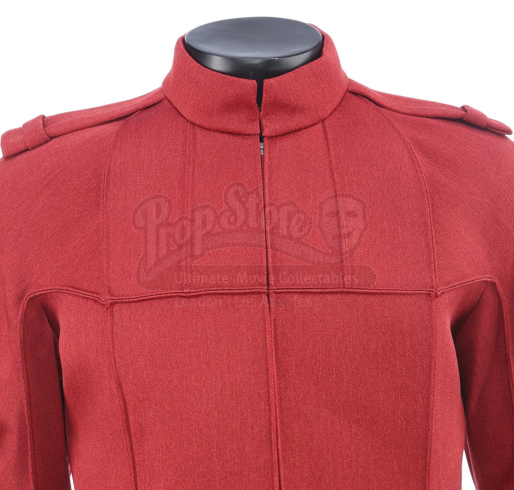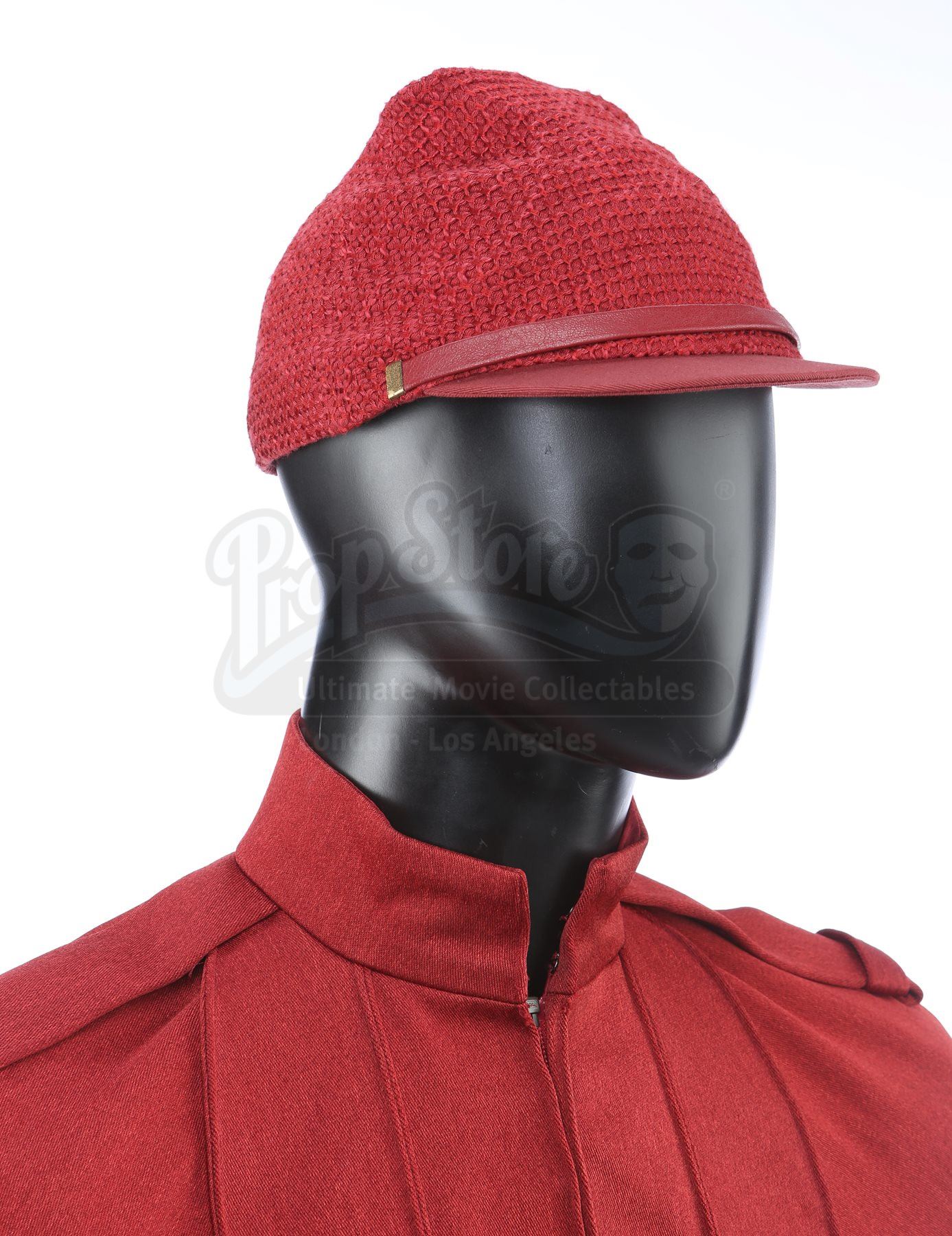 A set of three men's Starfleet cadet uniforms from Star Trek. Cadets wore their red uniforms at Starfleet Academy in San Francisco. The lot includes three Starfleet Academy jackets (two medium, one marked size 40), three knit turtleneck sweaters (two large, one medium), three pairs of pants (one large, one medium and one small), one cap, and one pair of shoes (10M). The cap features a knit outer with a black polyester lining. The jackets and the pants are made of a synthetic material with a metallic sheen and have ribbed seams. The zip-up jackets include padded shoulders and a mid-length collar. The shoes are made of leather with a front zipper closure. Estimate: $1500 - 2500*Estimated sale price; sold without reserve.
