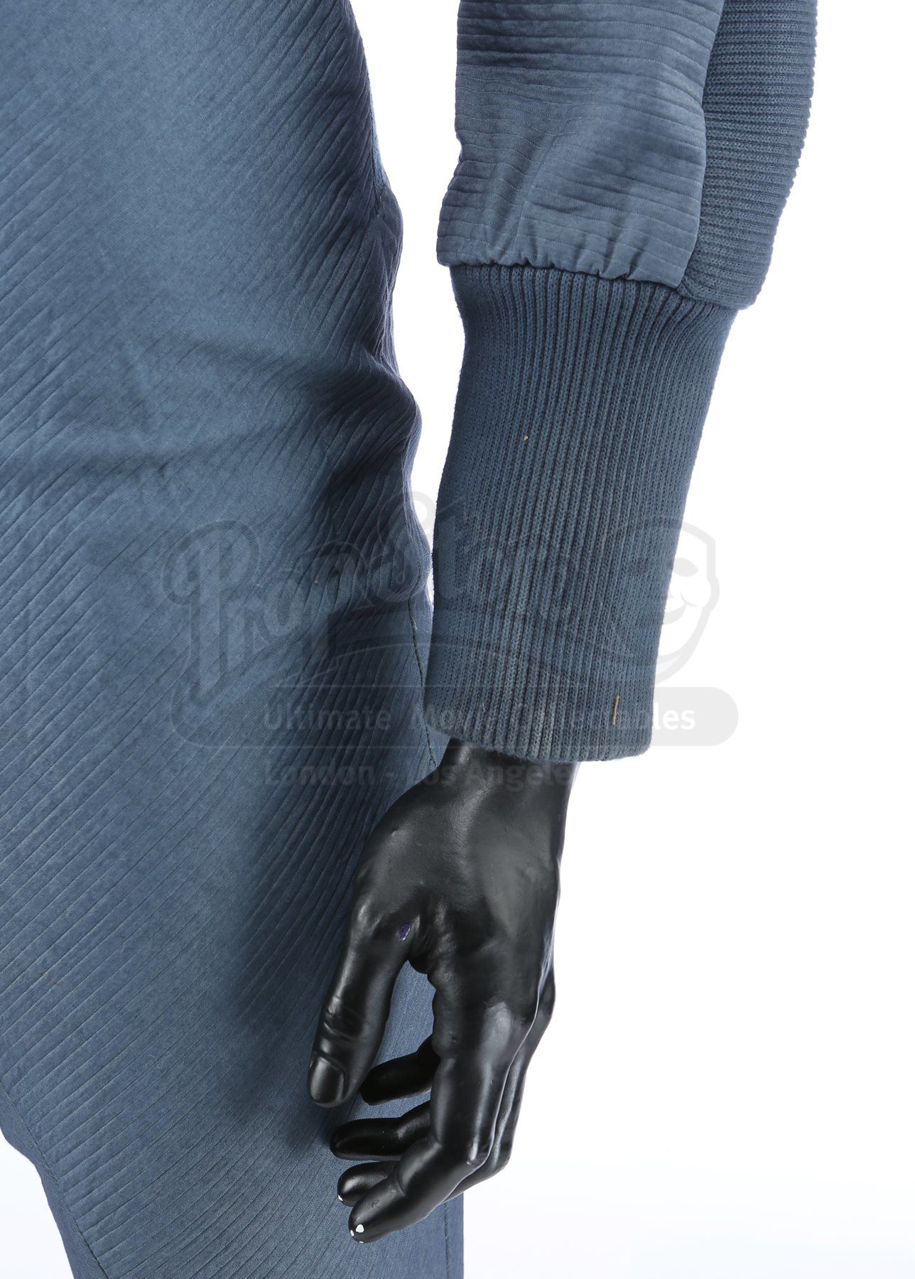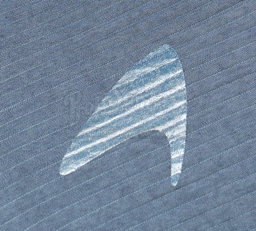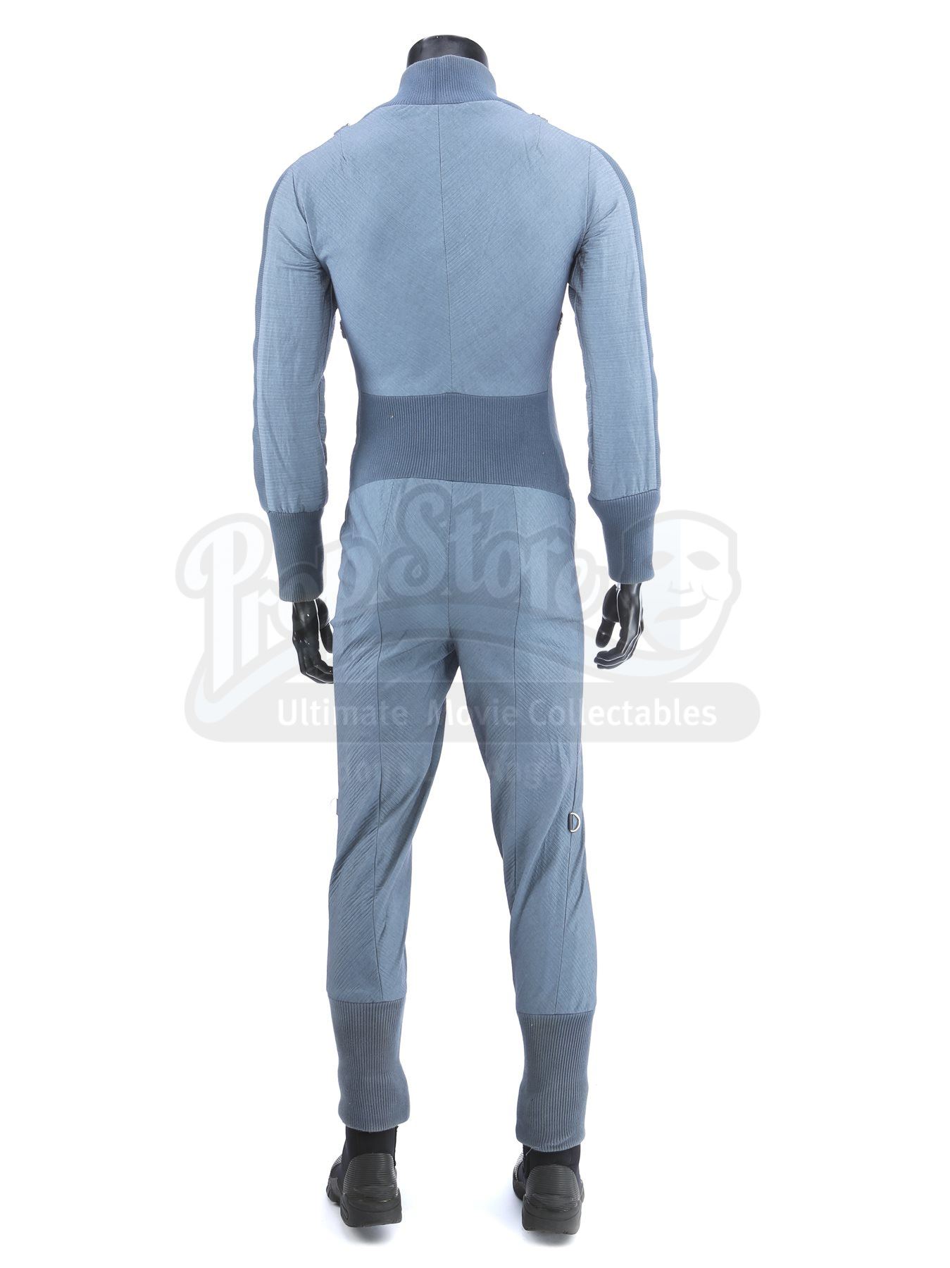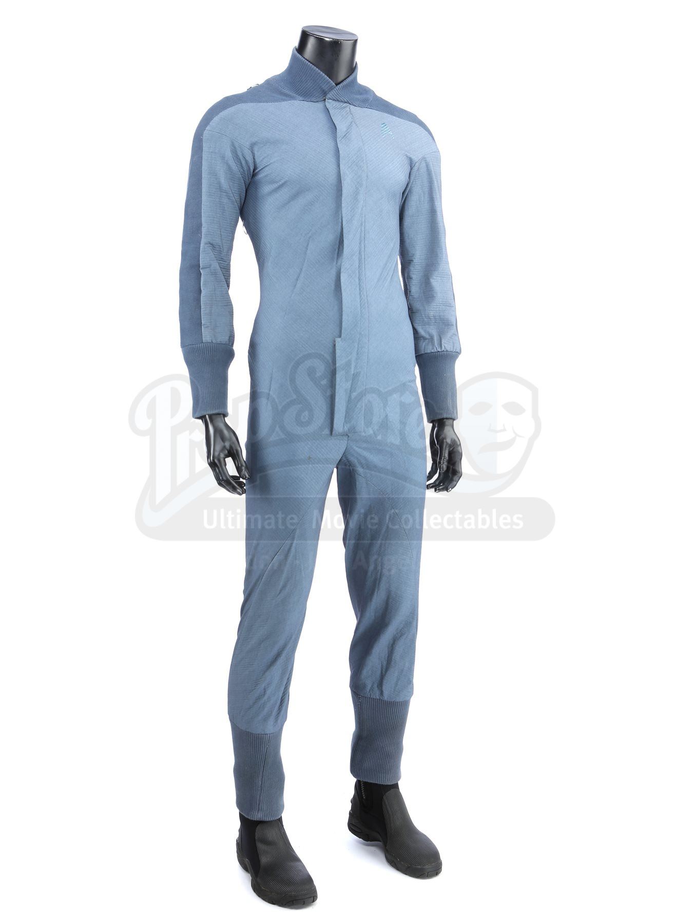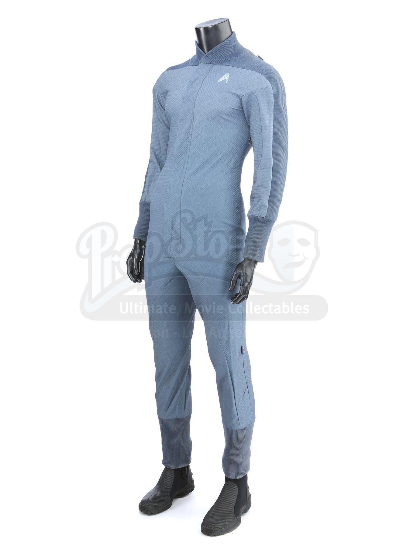 A set of three Starfleet Academy cadet training jumpsuits from Star Trek. Starfleet cadets wore training jumpsuits when they participated in the Kobayashi Maru scenario using Starfleet's bridge simulator. The lot includes three jumpsuits (three approximate size large), two pairs of leather shoes (one size 10, one size 8.5) and a pair of neoprene diving boots (extra large). The jumpsuits are made of a blue-gray synthetic blended fabric and cotton, with long wrist and ankle cuffs. The Starfleet insignia is printed on each jumpsuit over the left breast. Metal rings are anchored at several points, including the shoulders, waist and knees. The costume features sewn-in wardrobe labels with the actor's names.Estimate: $1000 - 1500*Estimated sale price; sold without reserve.