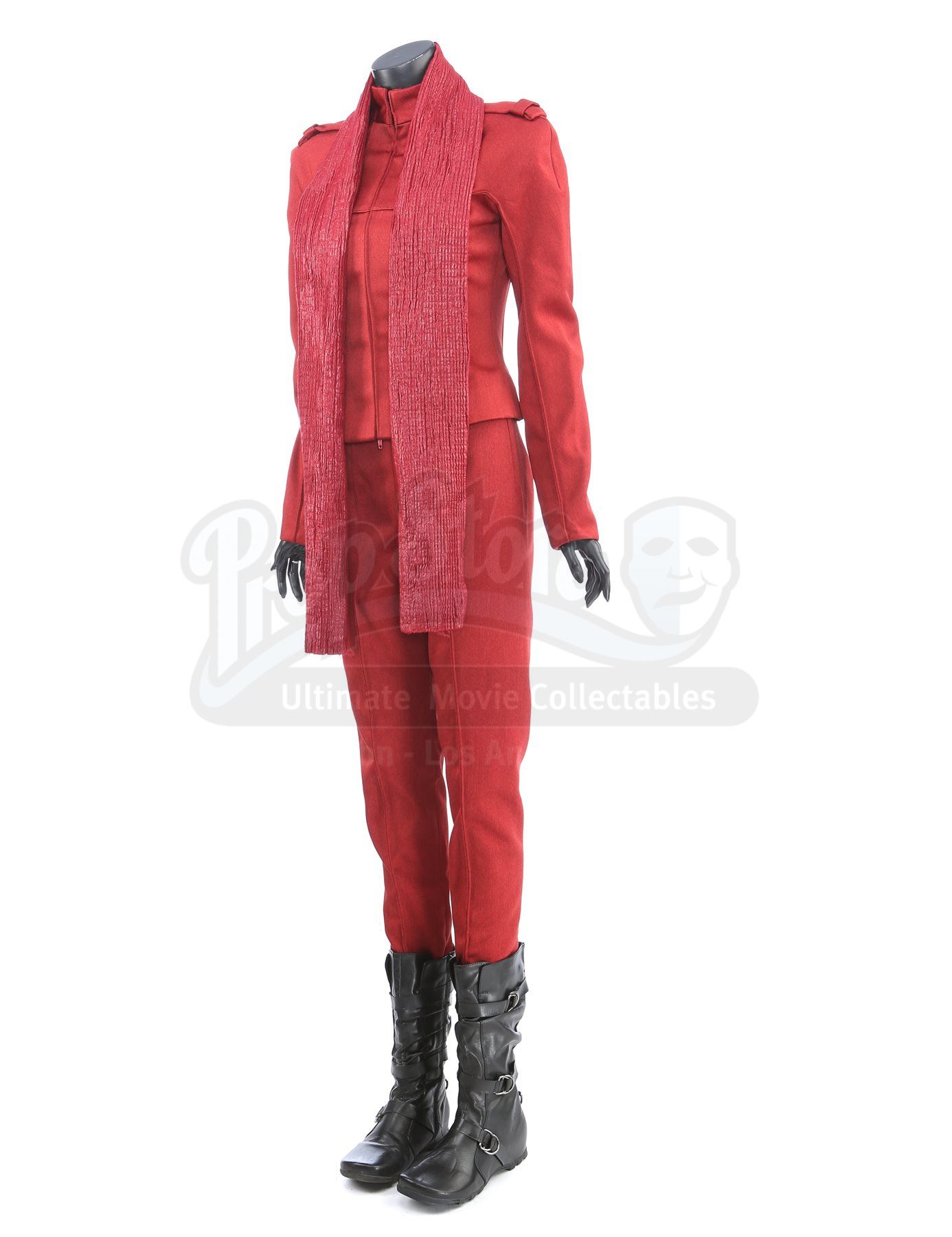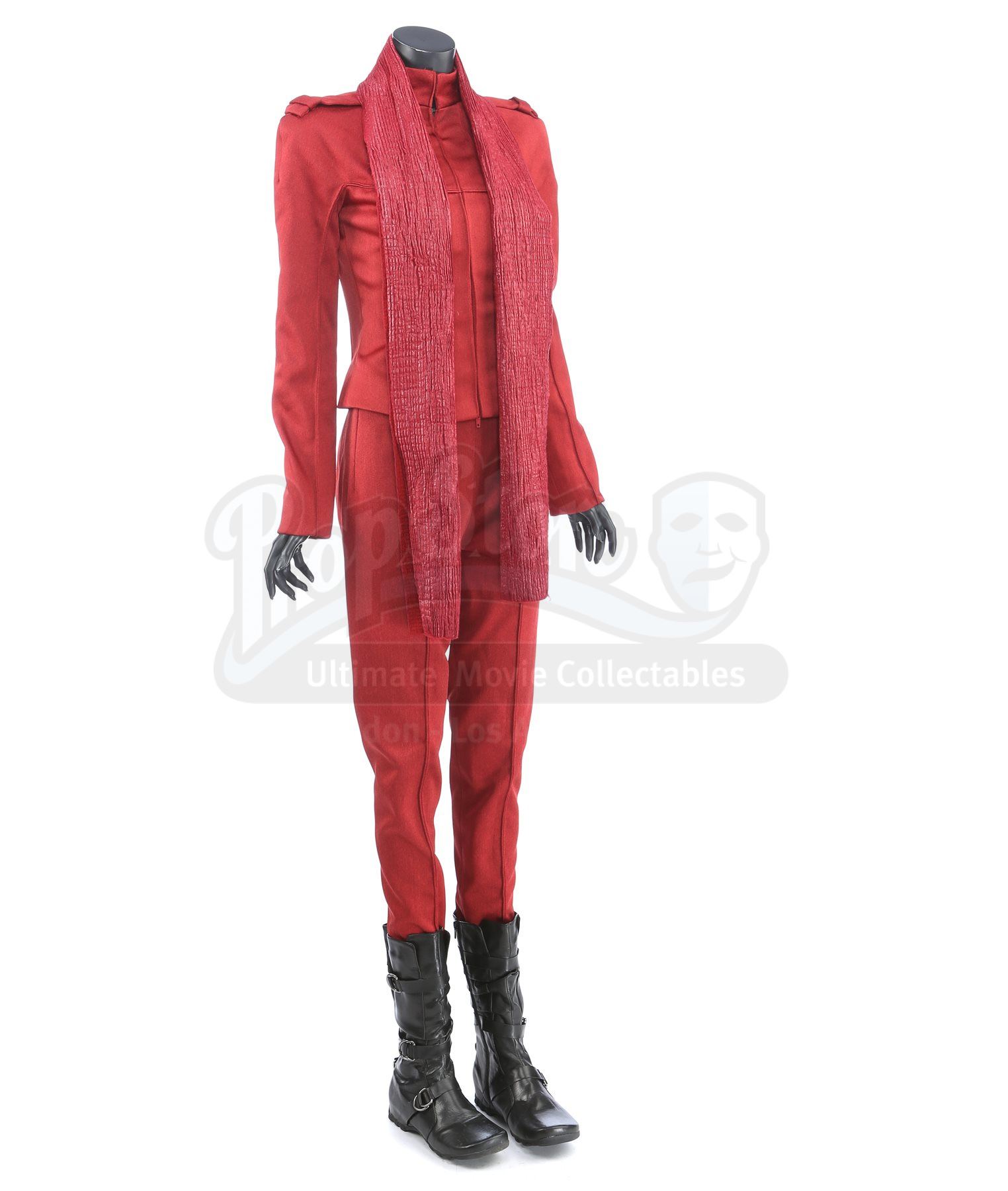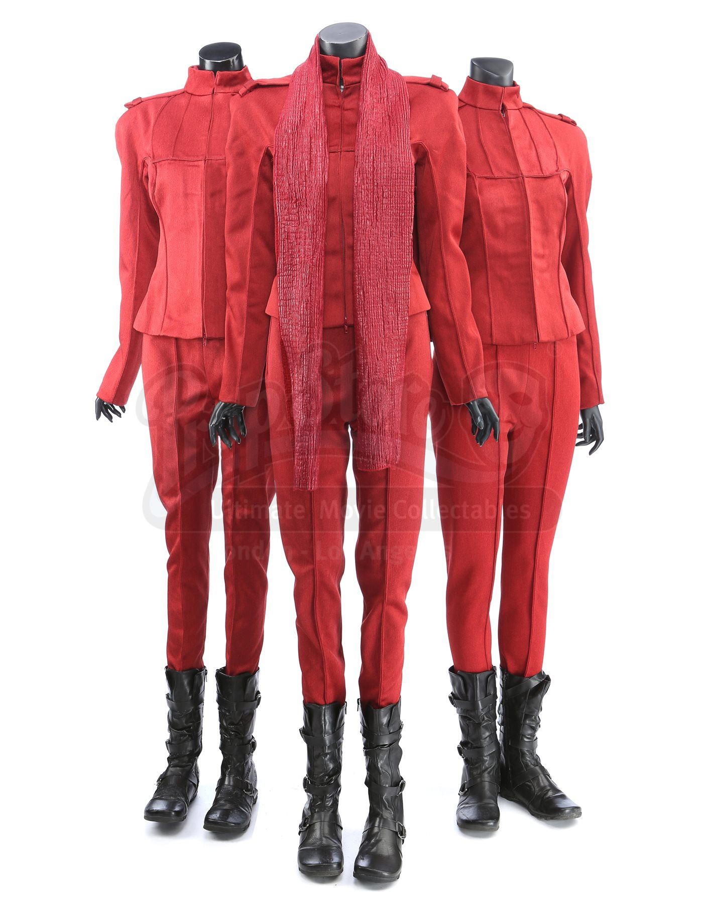 A set of three women's Starfleet cadet uniforms from Star Trek. Cadets wore their red uniforms at Starfleet Academy in San Francisco. Included in the set are three Starfleet Academy jackets (one medium, two small), three knit turtleneck sweaters (large), one scarf, three pairs of pants (one medium, two small), and three pairs of boots (one size 9, two size 8). The jackets and the pants are made of a synthetic material with a metallic sheen and have ribbed seams. The zip-up jackets include padded shoulders and a mid-length collar. The knit turtlenecks feature ribbing throughout and are made of a synthetic material. The calf-length boots are made of faux leather with decorative straps along the vamp and shaft. The lot shows some wear due to production use with one pair of boots showing numerous breaks in the faux leather exterior.Estimate: $1500 - 2500*Estimated sale price; sold without reserve.
