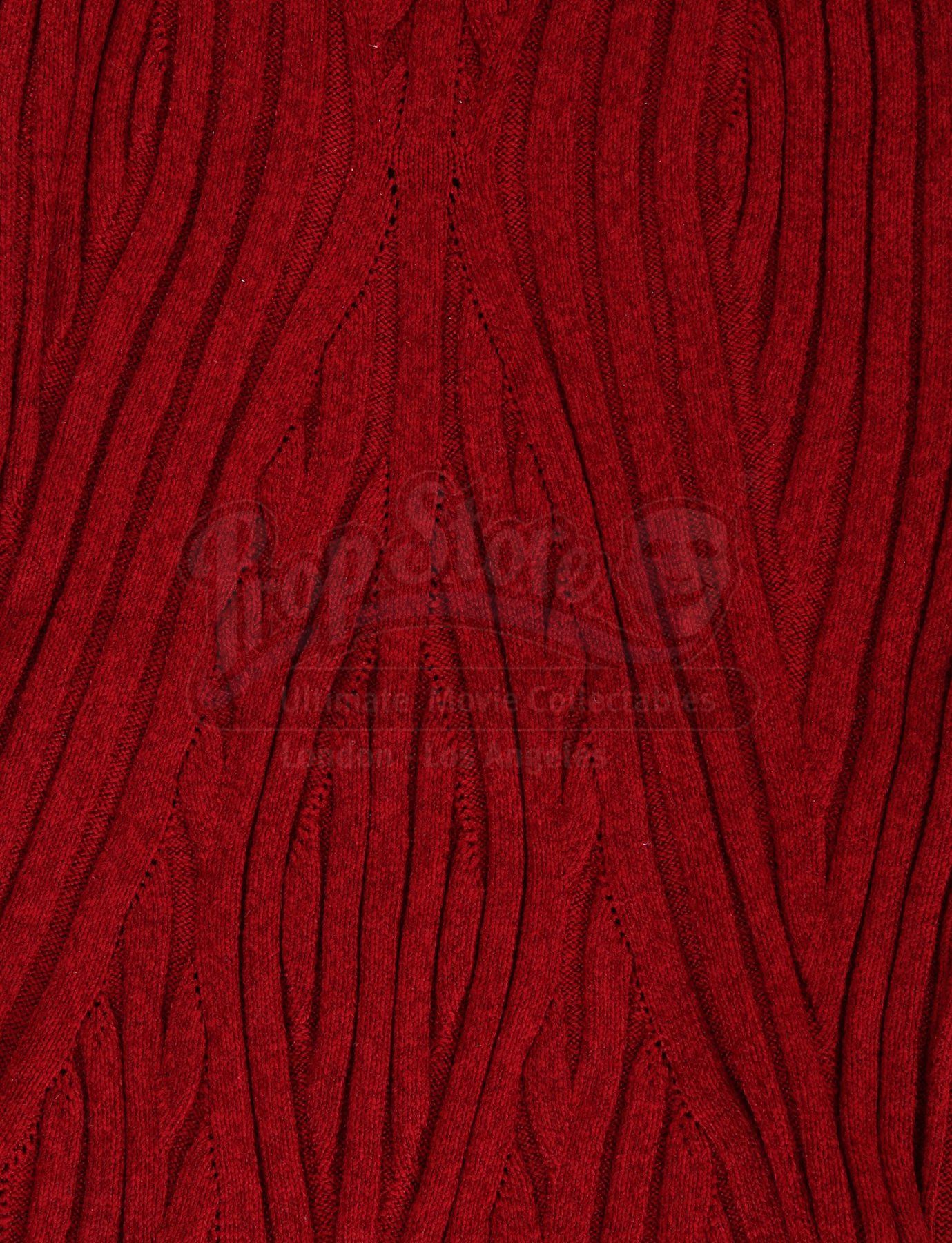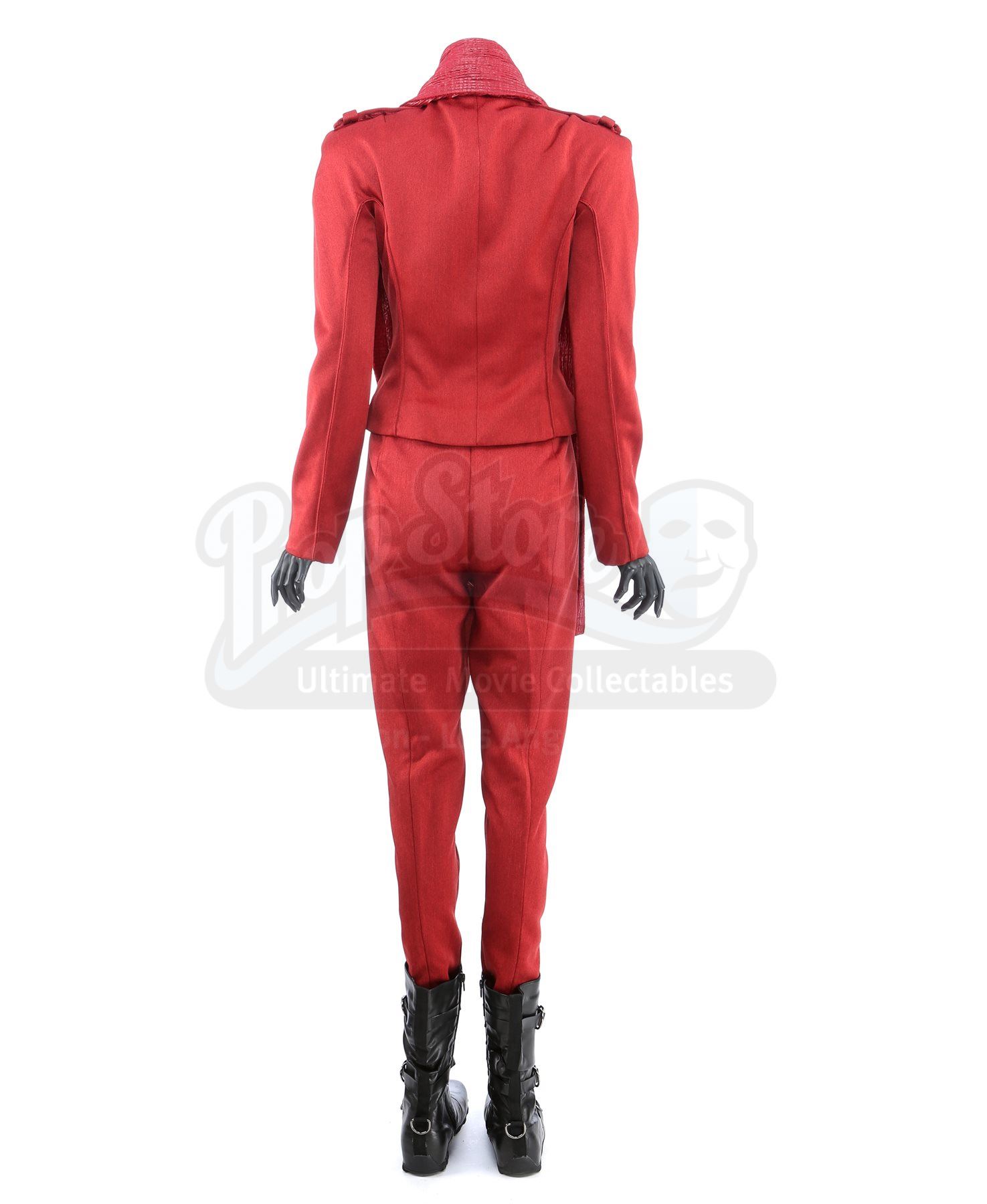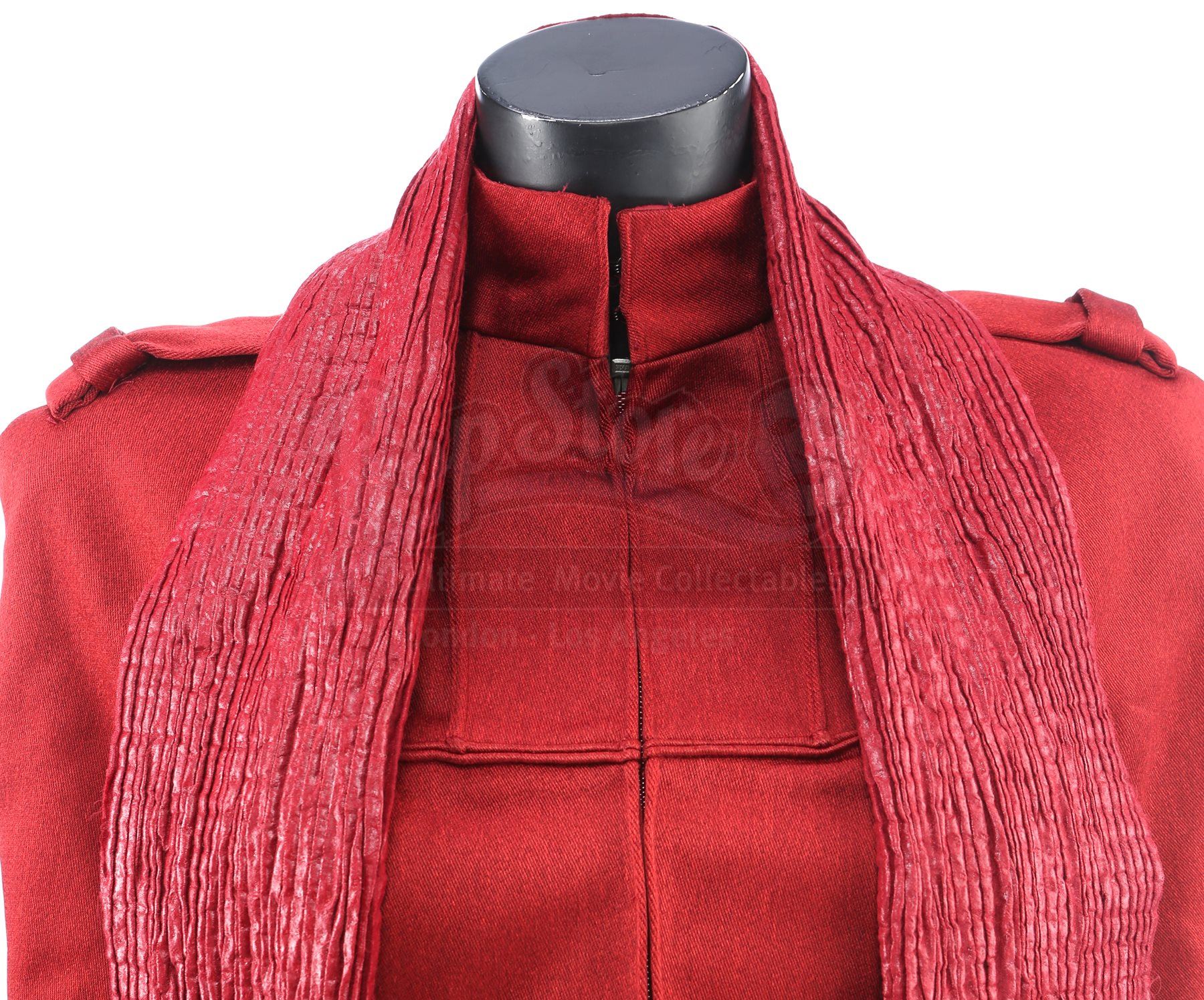 A set of three women's Starfleet cadet uniforms from Star Trek. Cadets wore their red uniforms at Starfleet Academy in San Francisco. Included in the set are three Starfleet Academy jackets (one medium, two small), three knit turtleneck sweaters (large), one scarf, three pairs of pants (one medium, two small), and three pairs of boots (one size 9, two size 8). The jackets and the pants are made of a synthetic material with a metallic sheen and have ribbed seams. The zip-up jackets include padded shoulders and a mid-length collar. The knit turtlenecks feature ribbing throughout and are made of a synthetic material. The calf-length boots are made of faux leather with decorative straps along the vamp and shaft. The lot shows some wear due to production use with one pair of boots showing numerous breaks in the faux leather exterior.Estimate: $1500 - 2500*Estimated sale price; sold without reserve.