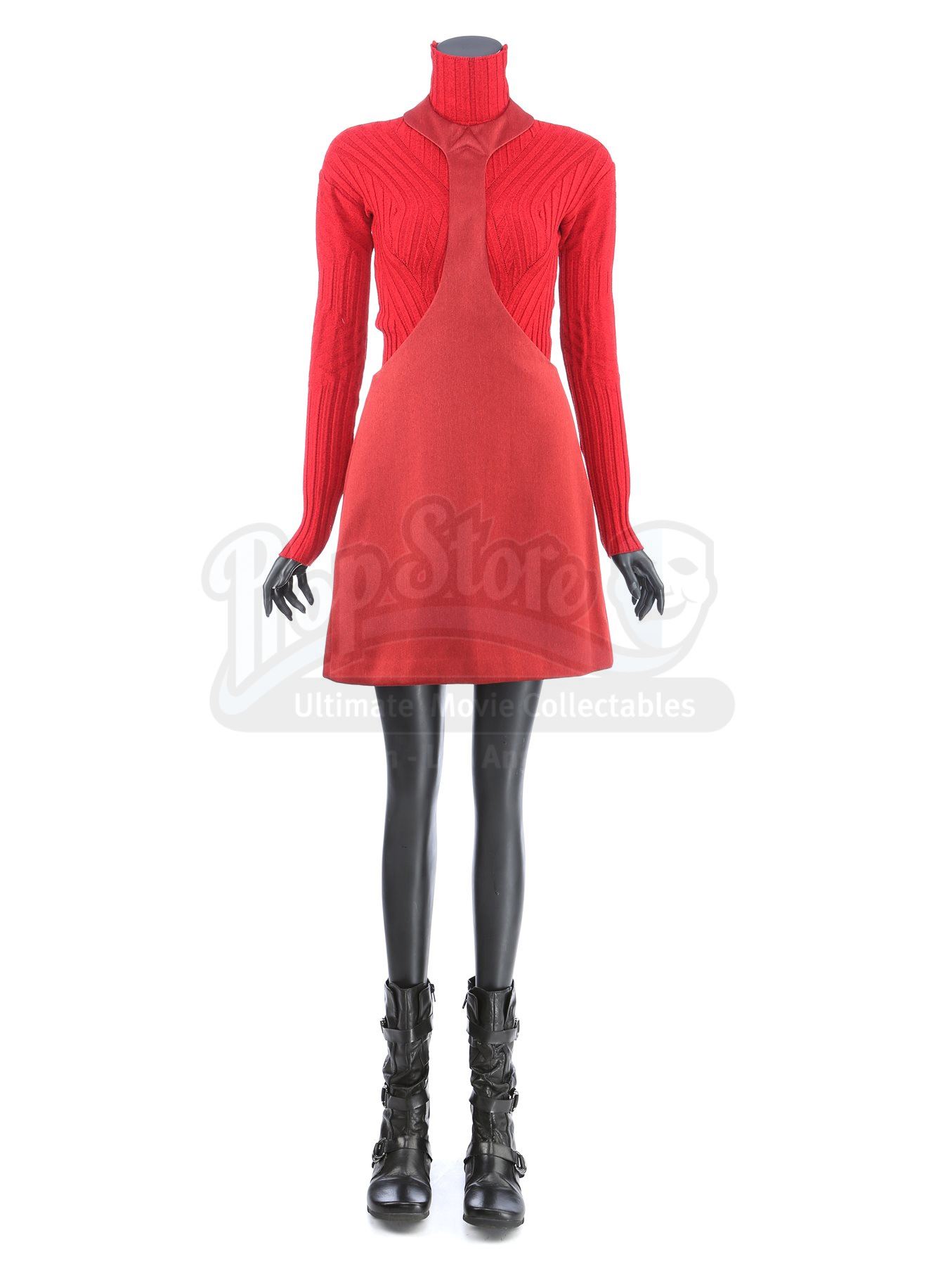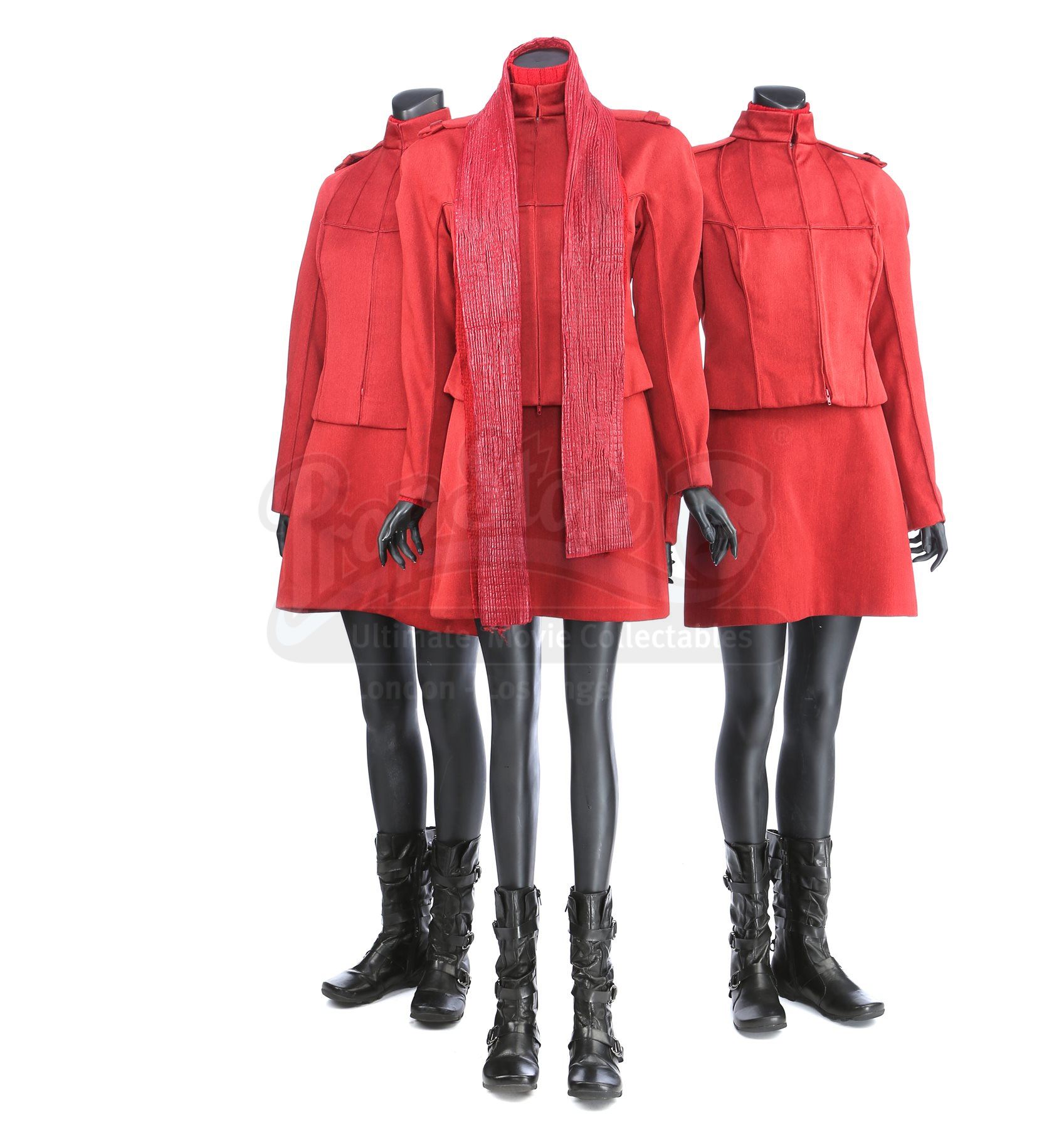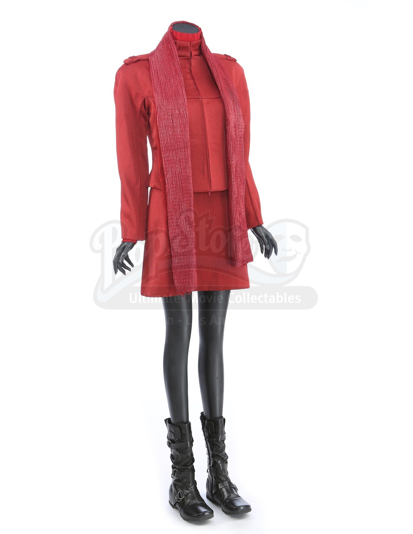 A set of three women's Starfleet cadet uniforms from Star Trek. Cadets wore their red uniforms at Starfleet Academy in San Francisco. Included in the set are three Starfleet Academy jackets (two medium, one small), three knit turtleneck sweaters (large), one scarf, three cutout jumpers (two medium, one small), and three pairs of boots (one size 8.5, two size 7). The jackets and the cutout jumpers are made of a synthetic material with a metallic sheen and have ribbed seams. The zip-up jackets include padded shoulders and a mid-length collar. The knit turtlenecks feature ribbing throughout and are made of a synthetic material. The calf-length boots are made of faux leather with decorative straps along the vamp and shaft. The lot shows some wear due to production use with one pair of boots showing numerous breaks in the faux leather exterior.Estimate: $1500 - 2500*Estimated sale price; sold without reserve.