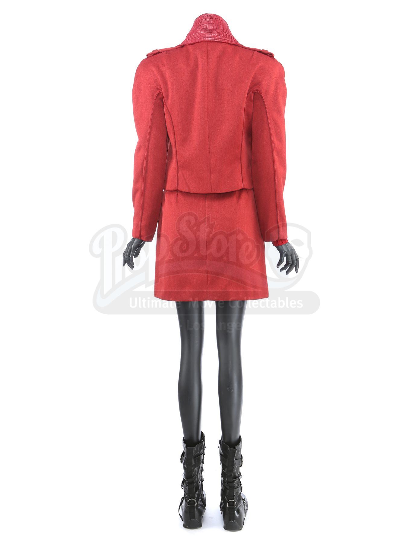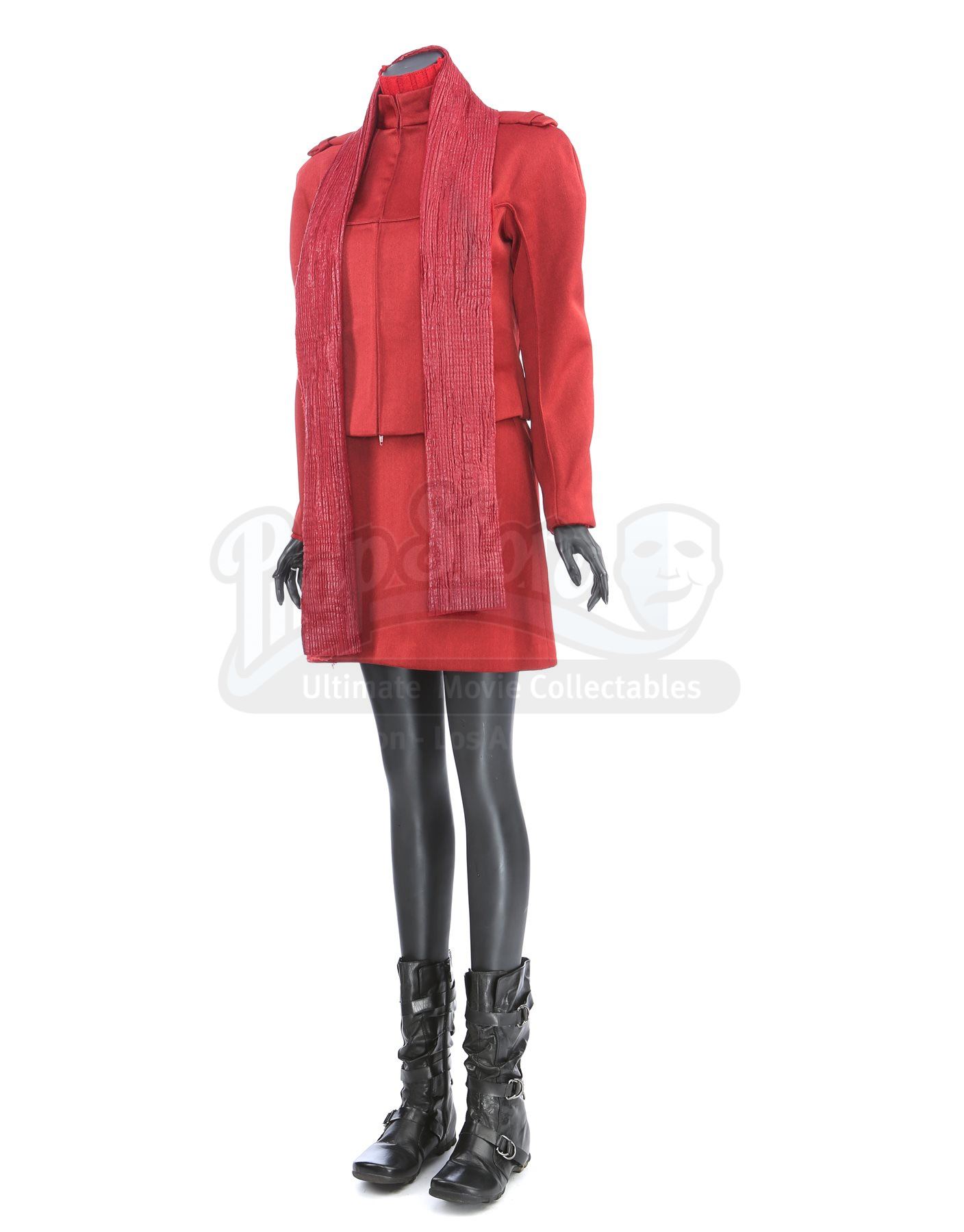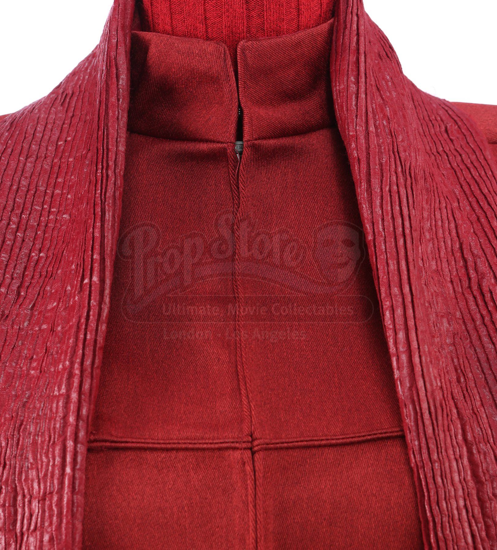 A set of three women's Starfleet cadet uniforms from Star Trek. Cadets wore their red uniforms at Starfleet Academy in San Francisco. Included in the set are three Starfleet Academy jackets (two medium, one small), three knit turtleneck sweaters (large), one scarf, three cutout jumpers (two medium, one small), and three pairs of boots (one size 8.5, two size 7). The jackets and the cutout jumpers are made of a synthetic material with a metallic sheen and have ribbed seams. The zip-up jackets include padded shoulders and a mid-length collar. The knit turtlenecks feature ribbing throughout and are made of a synthetic material. The calf-length boots are made of faux leather with decorative straps along the vamp and shaft. The lot shows some wear due to production use with one pair of boots showing numerous breaks in the faux leather exterior.Estimate: $1500 - 2500*Estimated sale price; sold without reserve.
