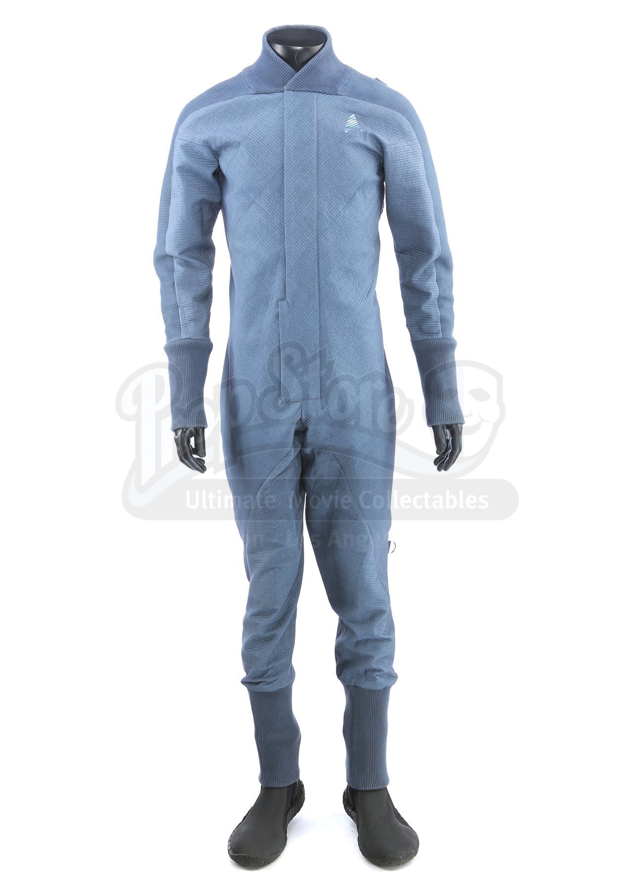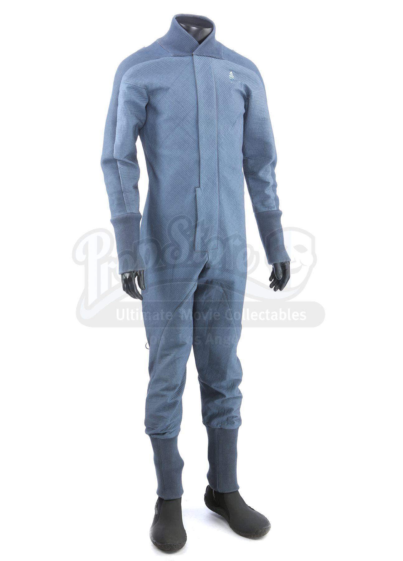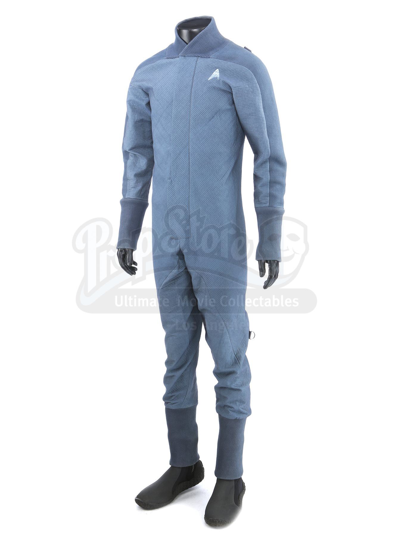 A Starfleet Academy cadet training jumpsuit from Star Trek. Starfleet cadets wore training jumpsuits when they participated in the Kobayashi Maru scenario using Starfleet's bridge simulator. The costume includes a jumpsuit (approximate size small) and a pair of boots (extra large). The jumpsuit is made of a blue-grey synthetic blended fabric and cotton, with long wrist and ankle cuffs. The Starfleet insignia is printed on each jumpsuit over the left breast. Metal rings are anchored at several points, including the shoulders, waist and knees. The black boots are made of neoprene and rubber. The boots are the incorrect type for the costume; they were used in the production by the crew of the USS Kelvin, but are included as they are similar in style. The costume also includes a hand-written wardrobe label in the jumpsuit marked with the actor's name.Estimate: $400 - 600*Estimated sale price; sold without reserve.