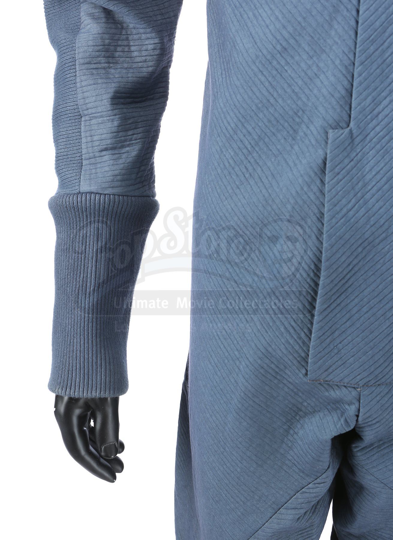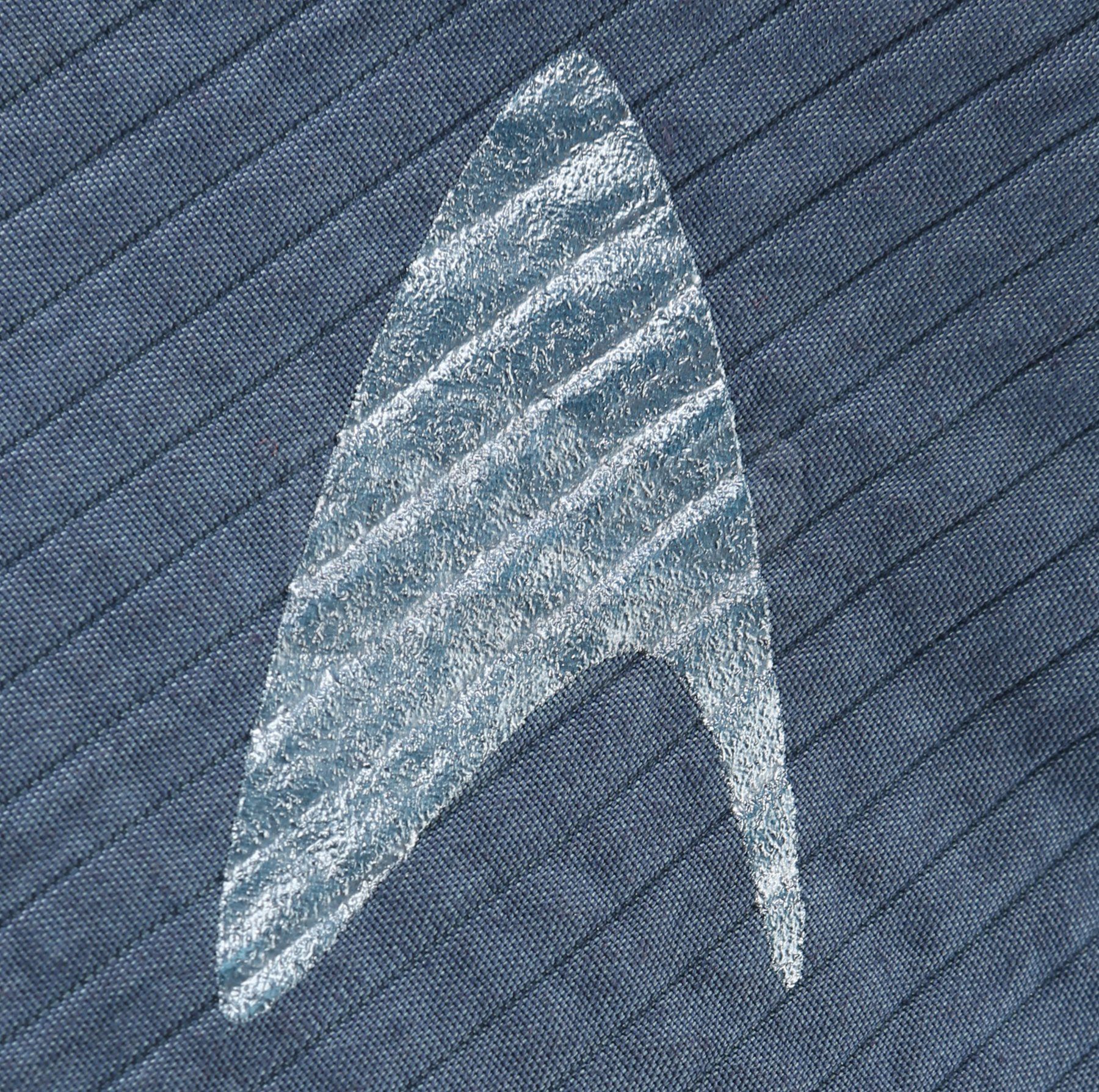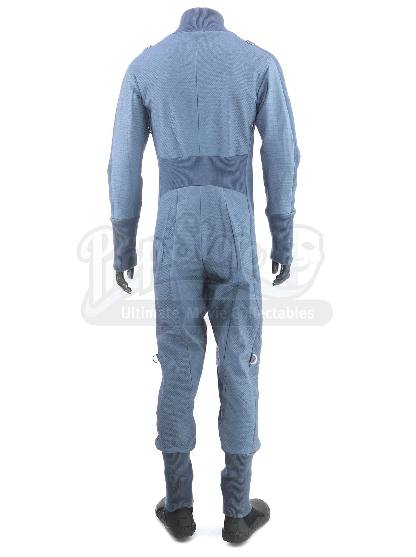 A Starfleet Academy cadet training jumpsuit from Star Trek. Starfleet cadets wore training jumpsuits when they participated in the Kobayashi Maru scenario using Starfleet's bridge simulator. The costume includes a jumpsuit (approximate size small) and a pair of boots (extra large). The jumpsuit is made of a blue-grey synthetic blended fabric and cotton, with long wrist and ankle cuffs. The Starfleet insignia is printed on each jumpsuit over the left breast. Metal rings are anchored at several points, including the shoulders, waist and knees. The black boots are made of neoprene and rubber. The boots are the incorrect type for the costume; they were used in the production by the crew of the USS Kelvin, but are included as they are similar in style. The costume also includes a hand-written wardrobe label in the jumpsuit marked with the actor's name.Estimate: $400 - 600*Estimated sale price; sold without reserve.