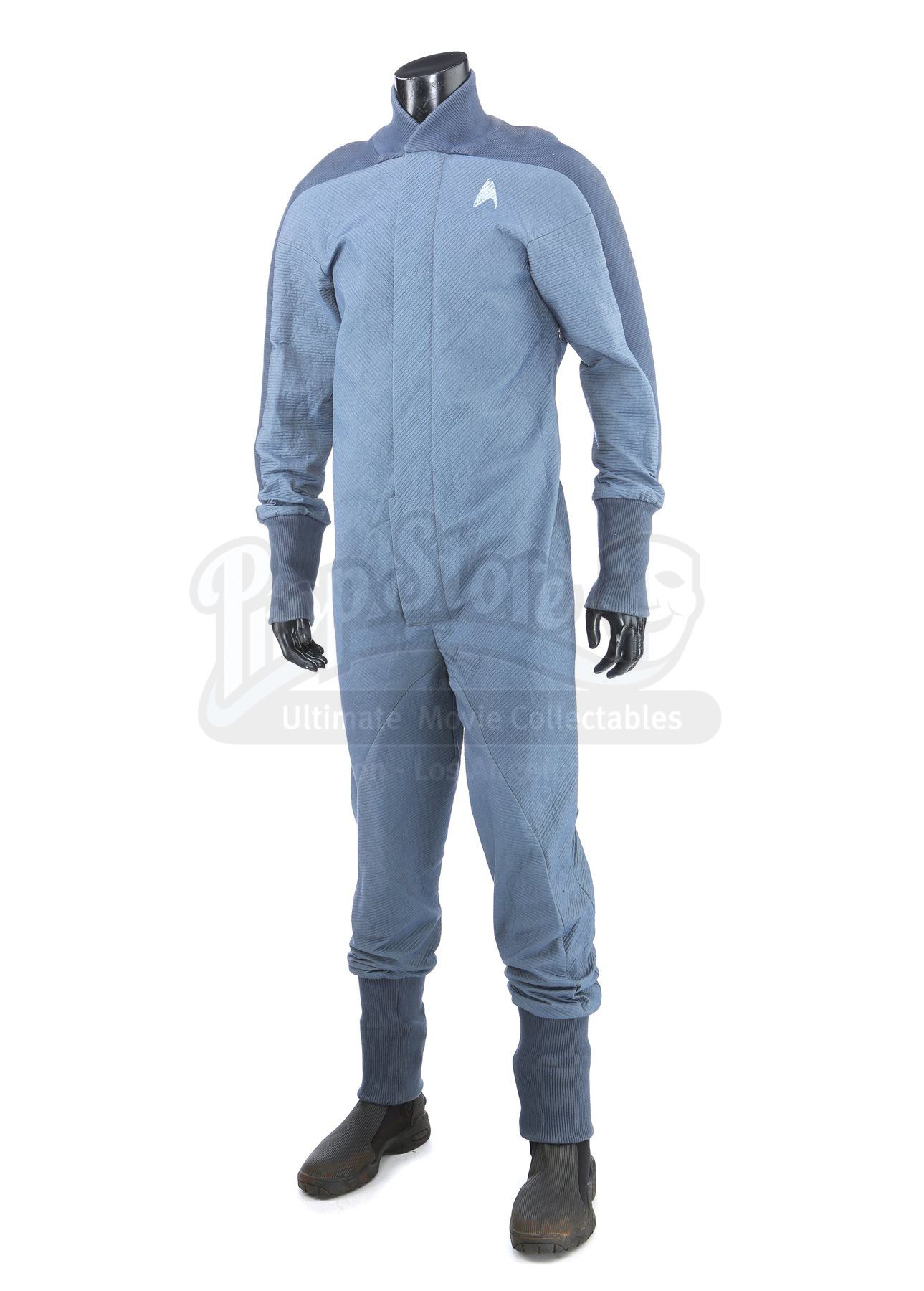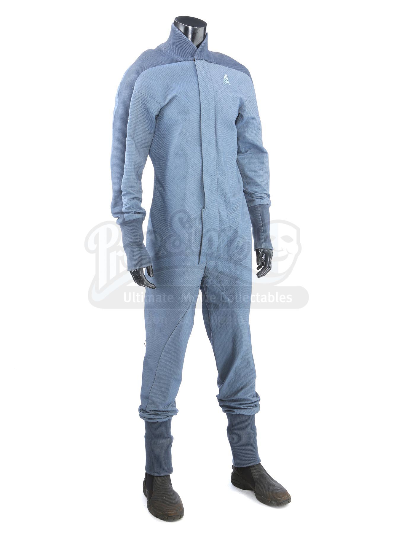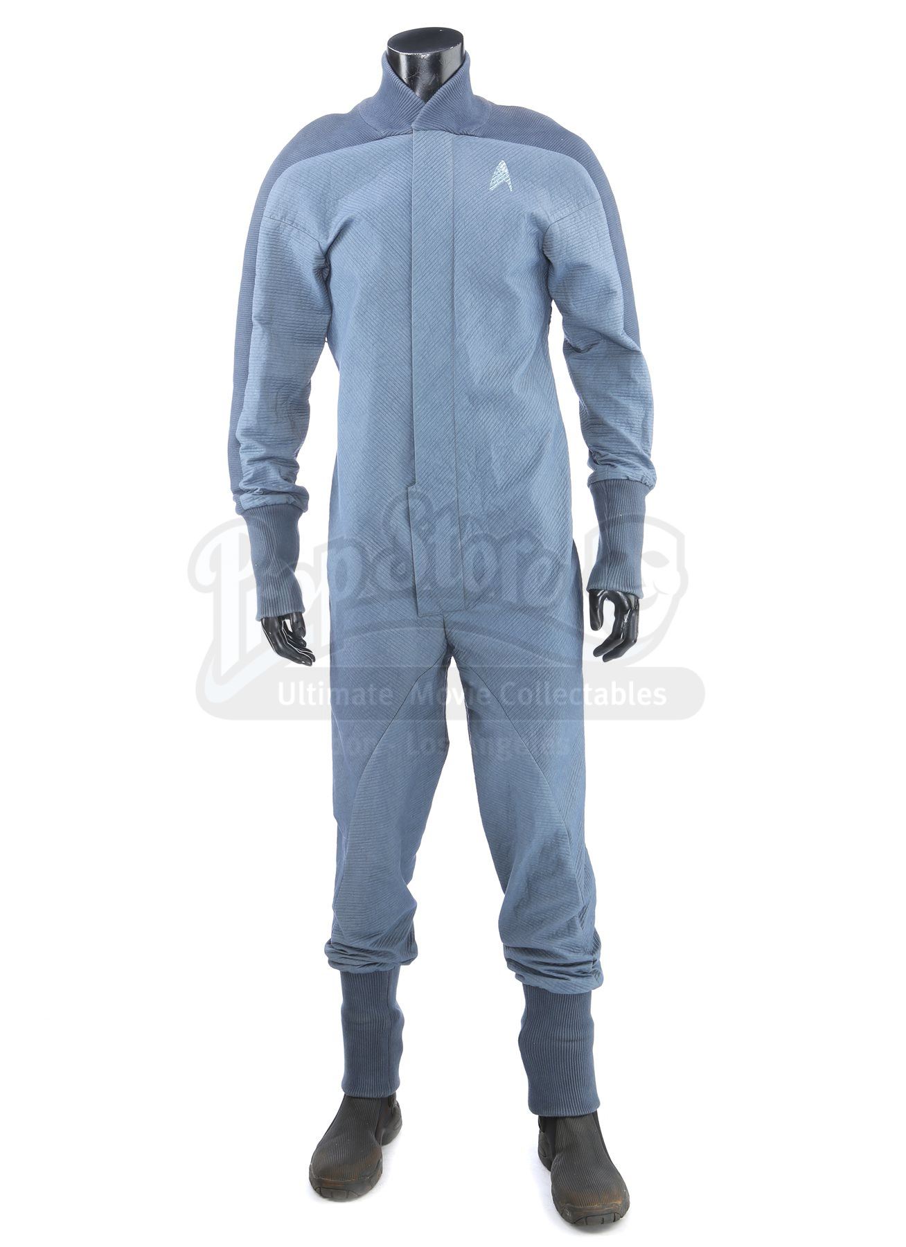 The jumpsuit is made of a blue-grey synthetic blended fabric and cotton, with long wrist and ankle cuffs. The Starfleet insignia is printed on each jumpsuit over the left breast. Metal rings are anchored at several points, including the shoulders, waist and knees. The black boots are made of neoprene.