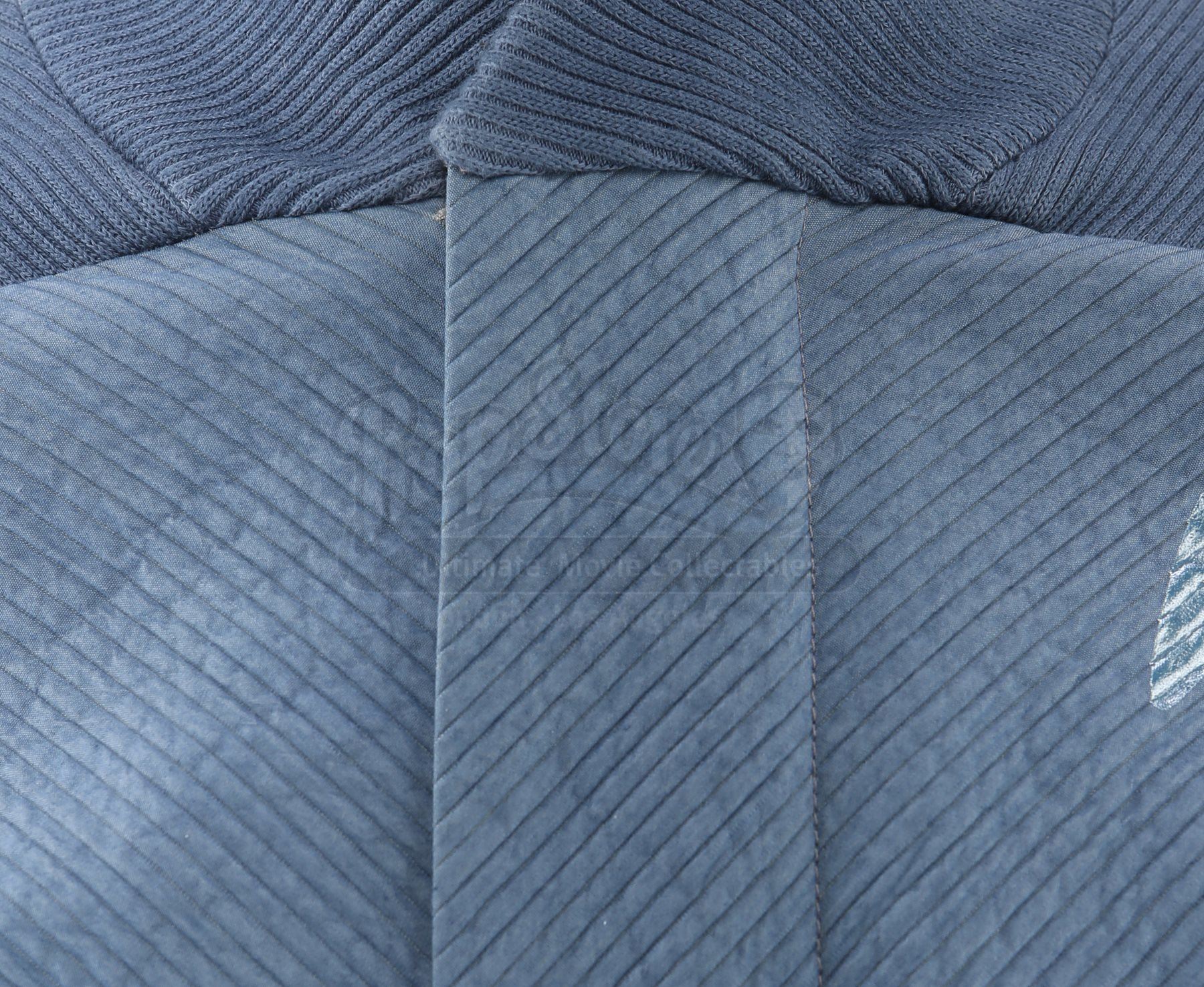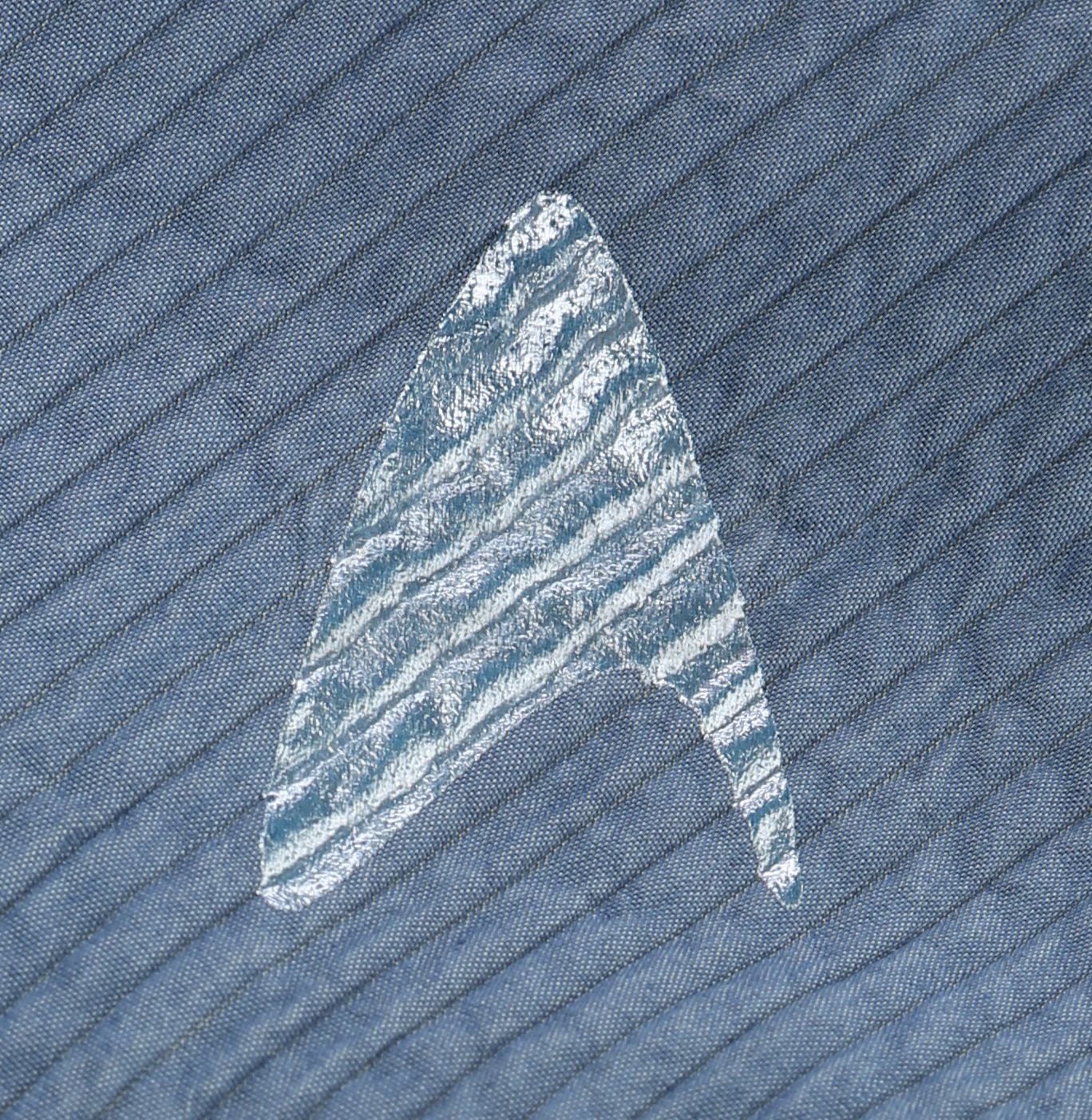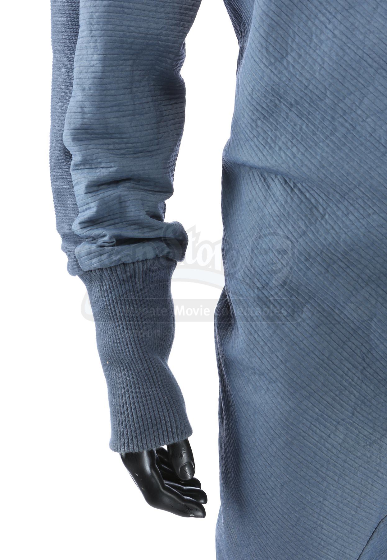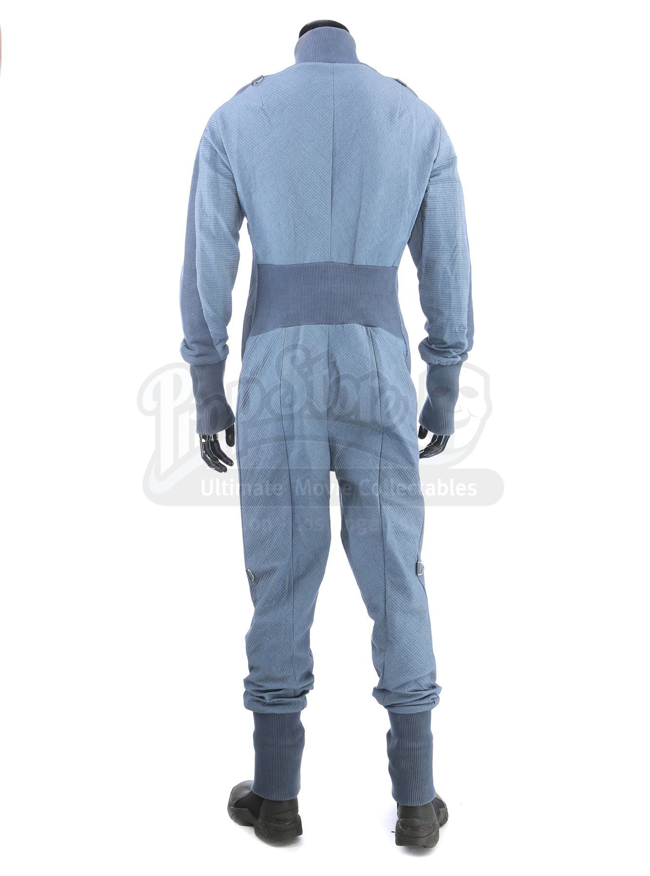 The jumpsuit is made of a blue-grey synthetic blended fabric and cotton, with long wrist and ankle cuffs. The Starfleet insignia is printed on each jumpsuit over the left breast. Metal rings are anchored at several points, including the shoulders, waist and knees. The black boots are made of neoprene.