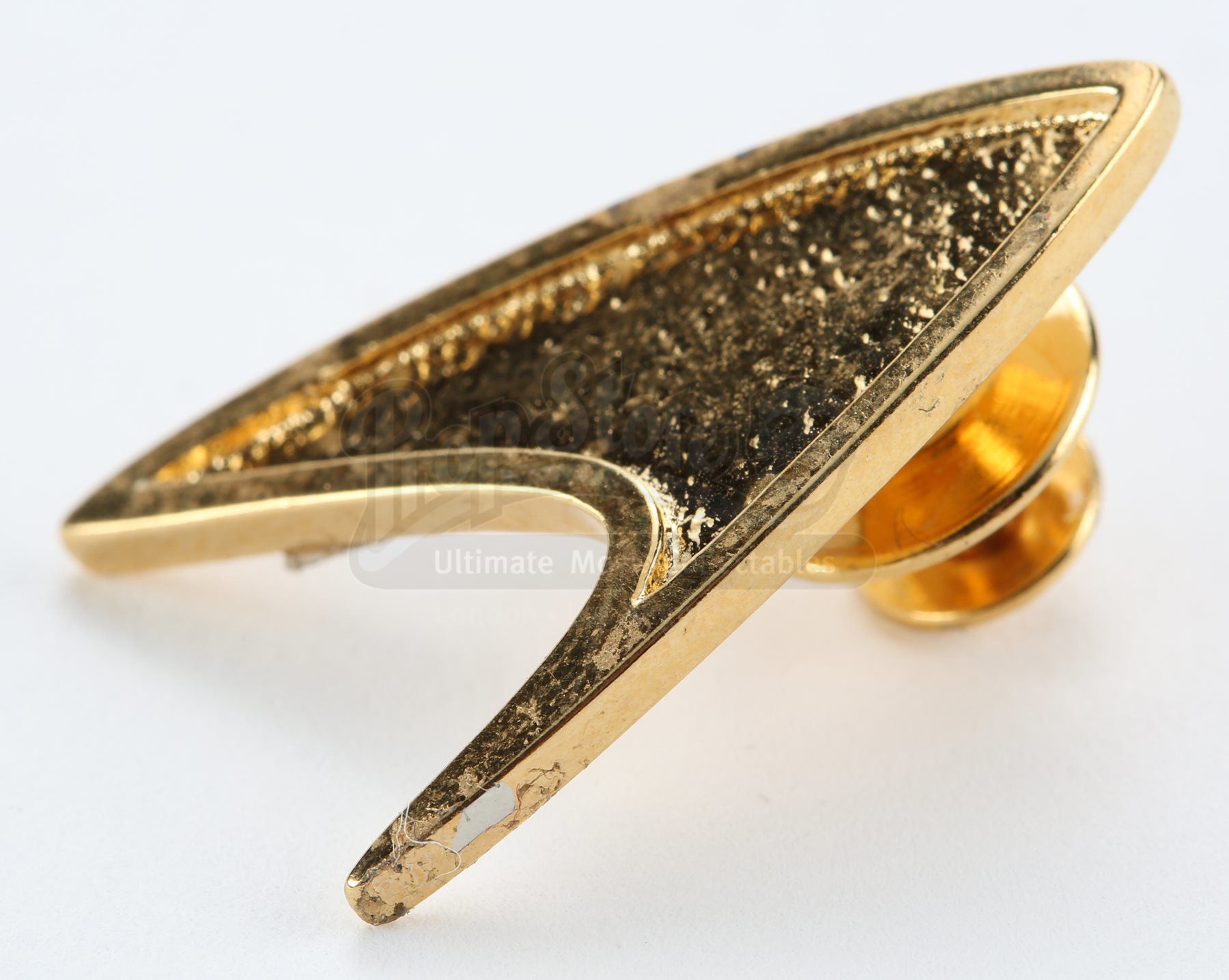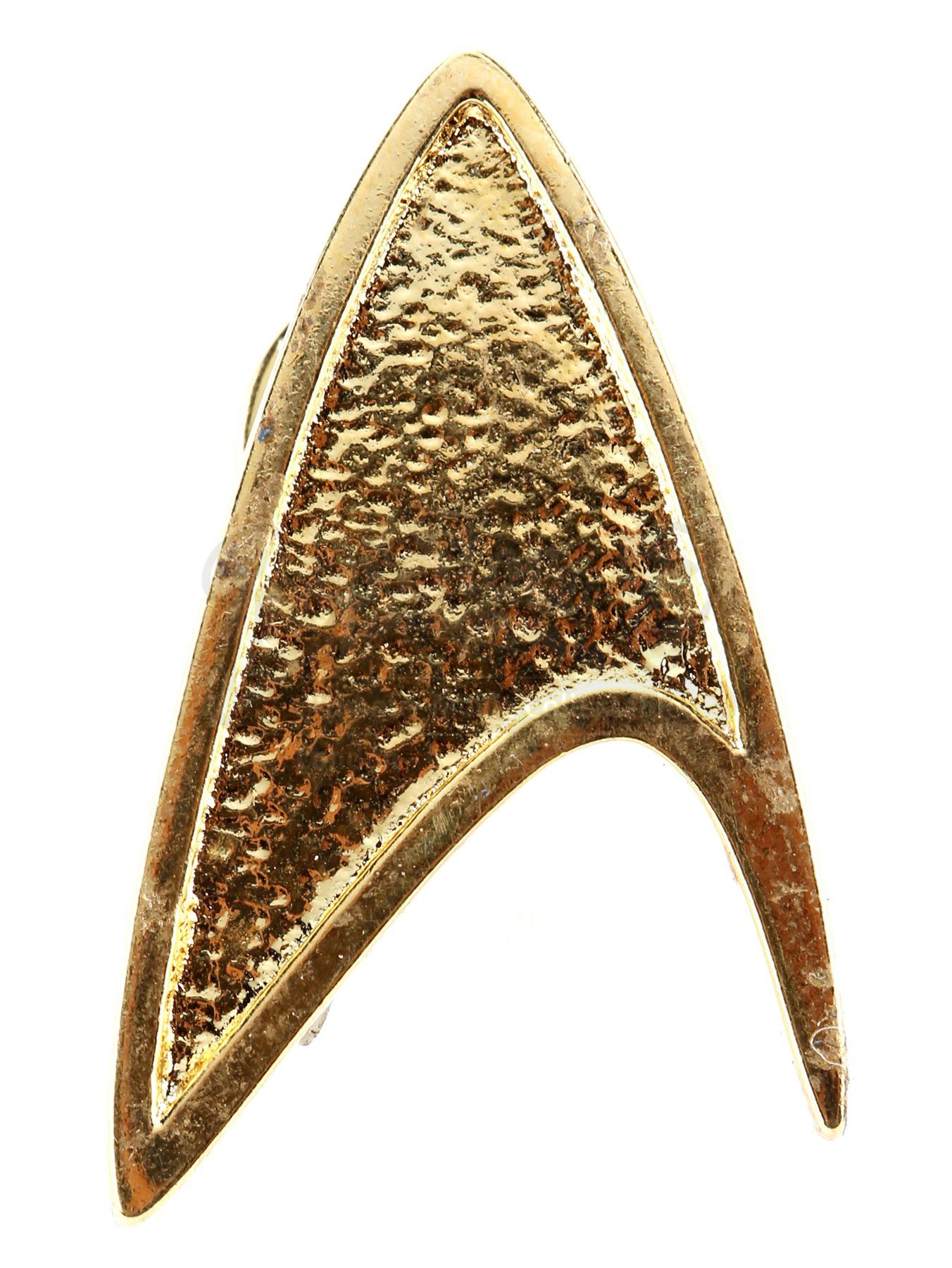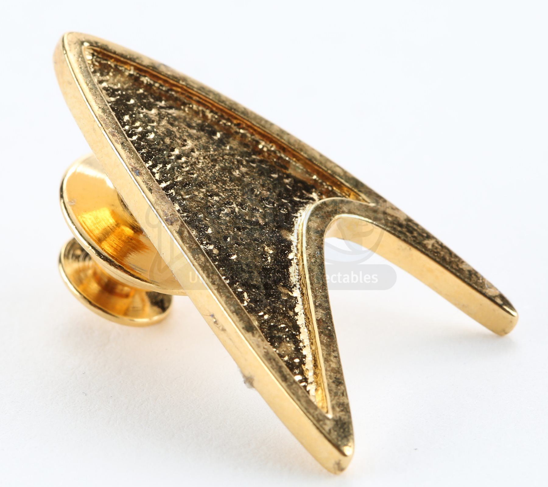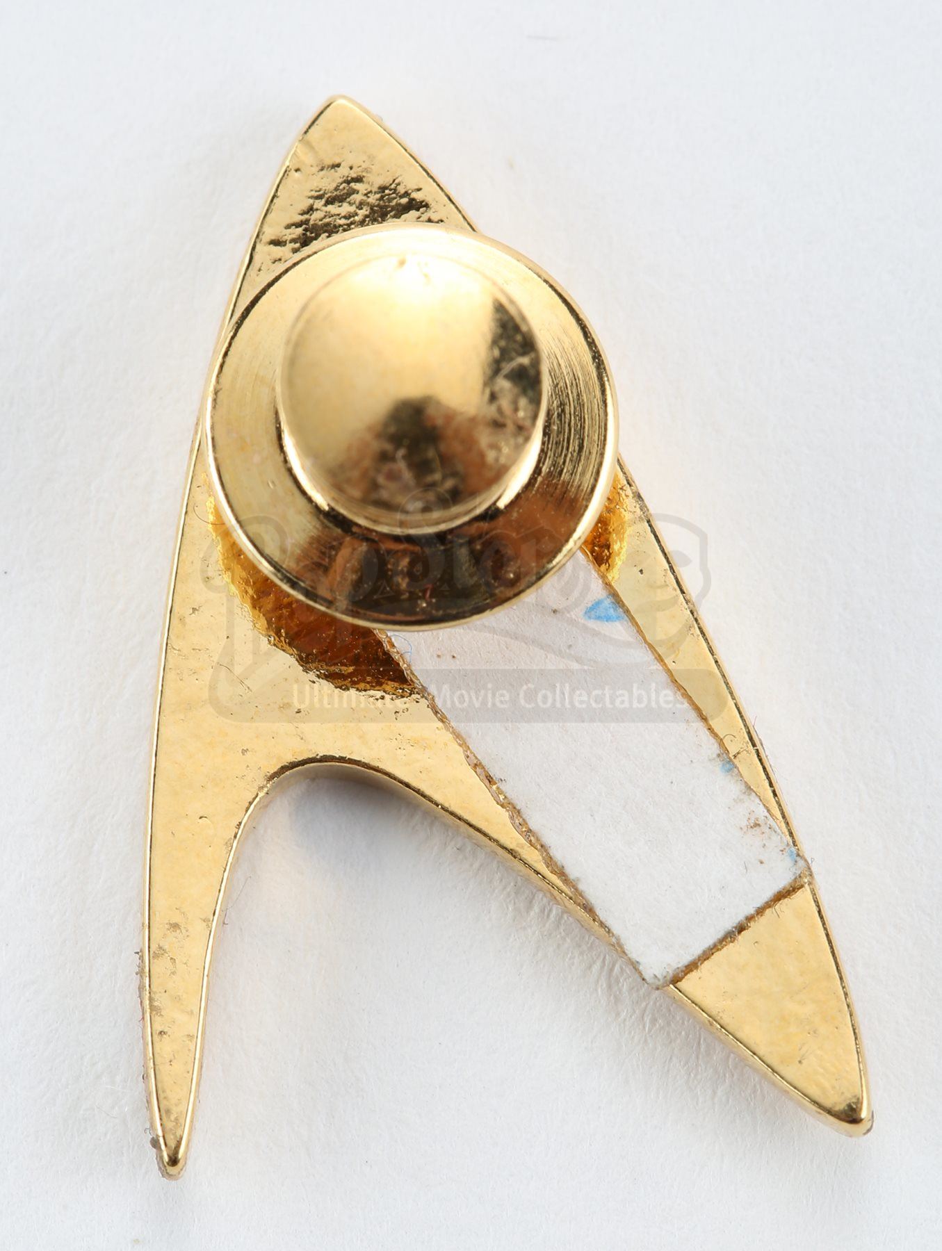 A Starfleet cadet uniform collar insignia from Star Trek. Cadets in Starfleet Academy wore Starfleet pins on the collars of their red uniforms. The goldtone pin is made of metal and includes a pin back for attaching to the wearer's clothing. Dimensions: 1 ¼" x 2" x ¼" (3 cm x 5 cm x 0.5 cm)Estimate: $600 - 800*Estimated sale price; sold without reserve.