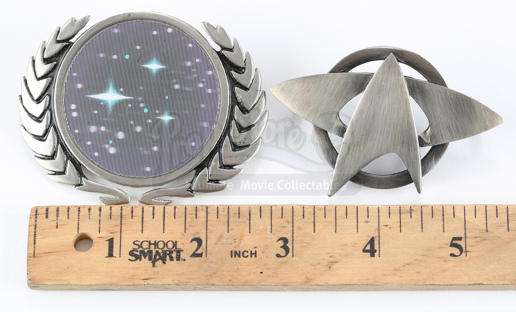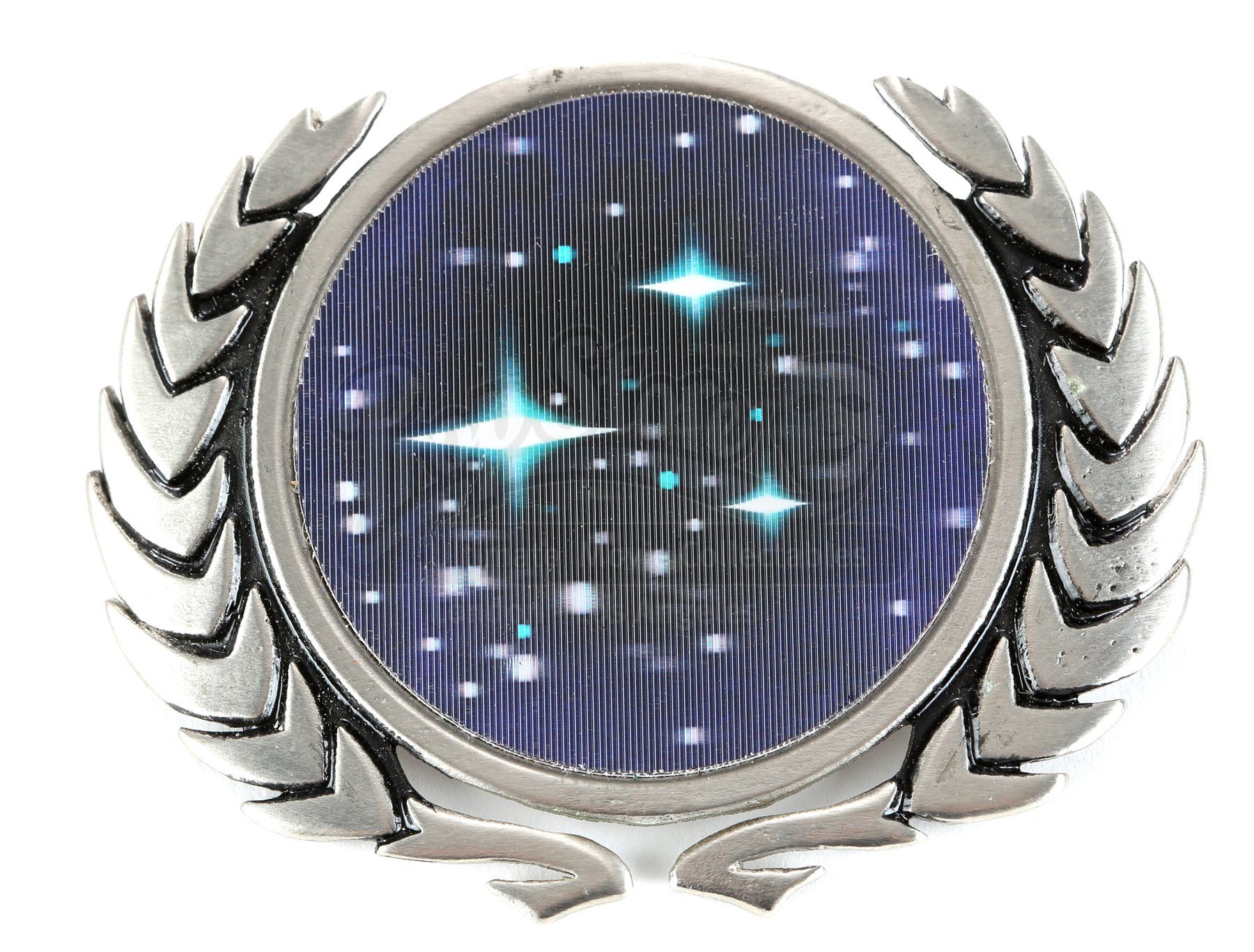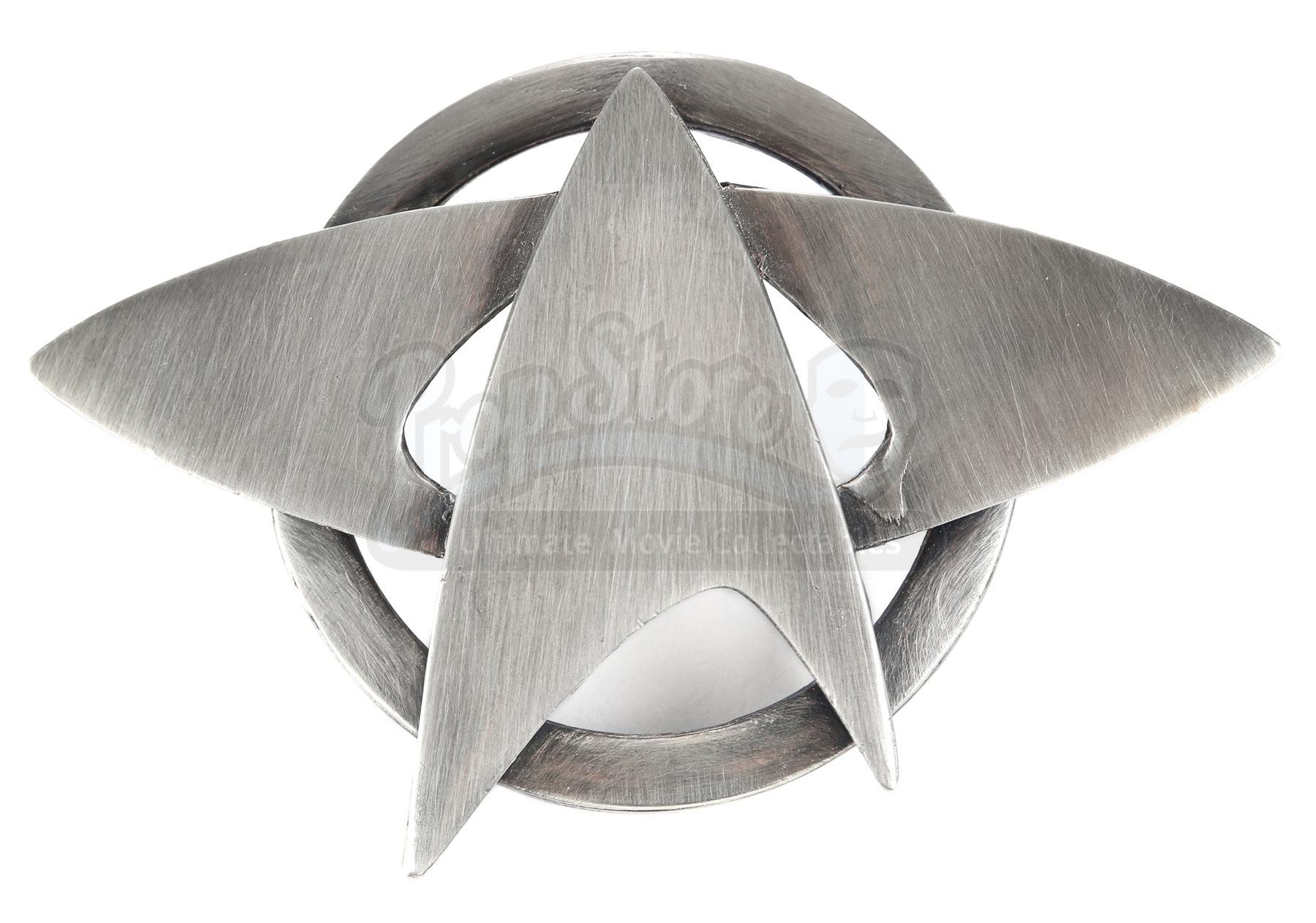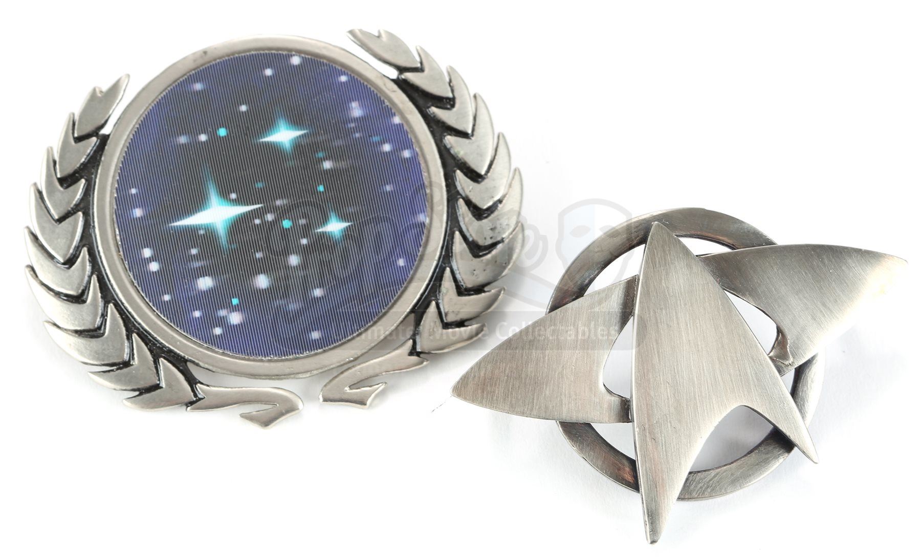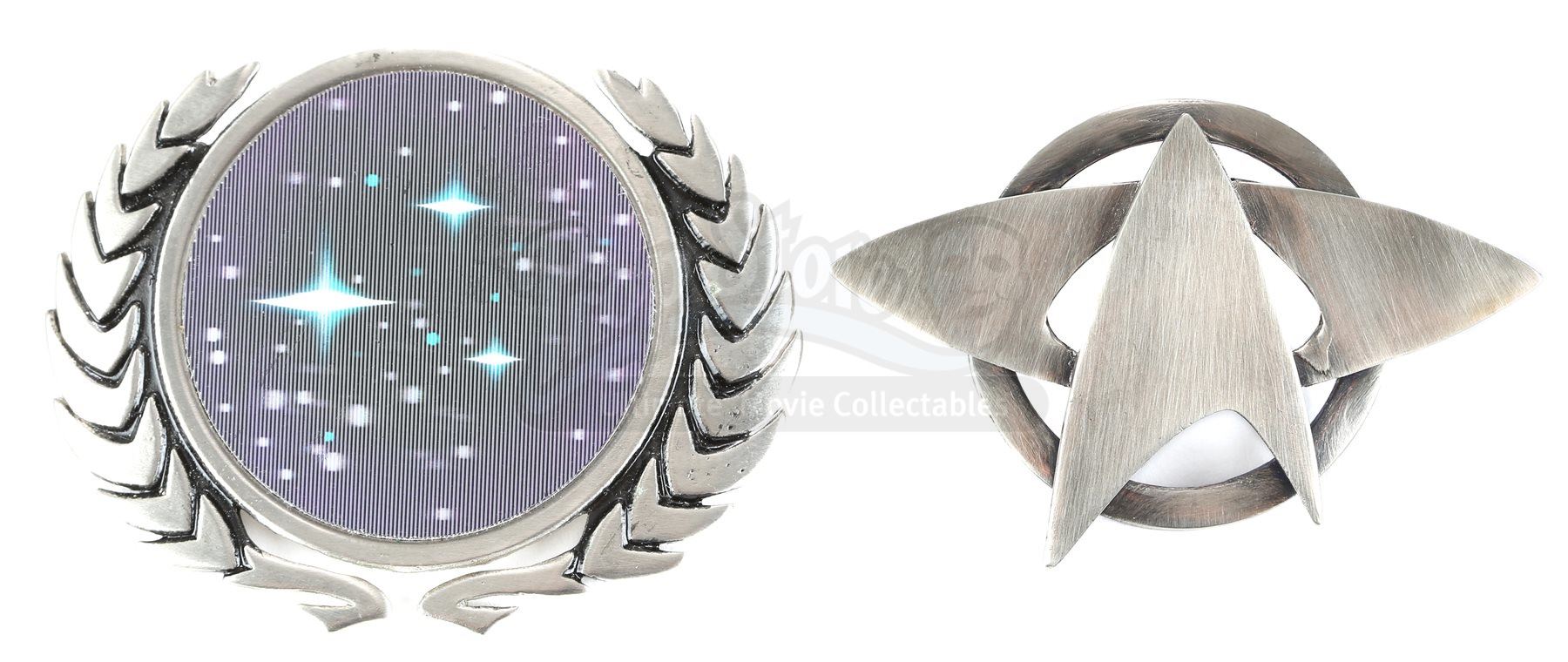 A Starfleet pin set from Star Trek. Starfleet staff wore various pins on their uniforms. The pins are made of metal with the lenticular pin belonging to a Starfleet command admiral's cap and the silvertone pin belonging to an enlisted crewman's cap. The silvertone pin includes two pin backs for attaching to the wearer's clothing, while the lenticular pin features a nut and bolt.Dimensions: 4" x 3" x 1" (10 cm x 8 cm x 2.5 cm)Estimate: $600 - 800*Estimated sale price; sold without reserve.