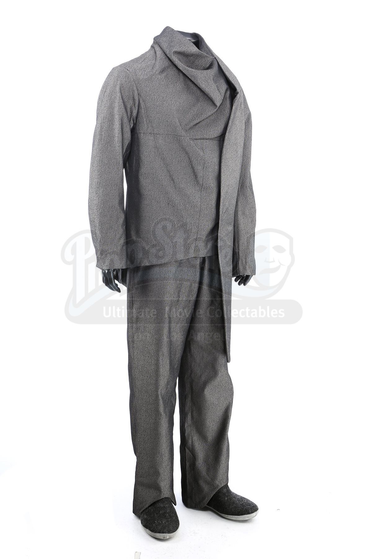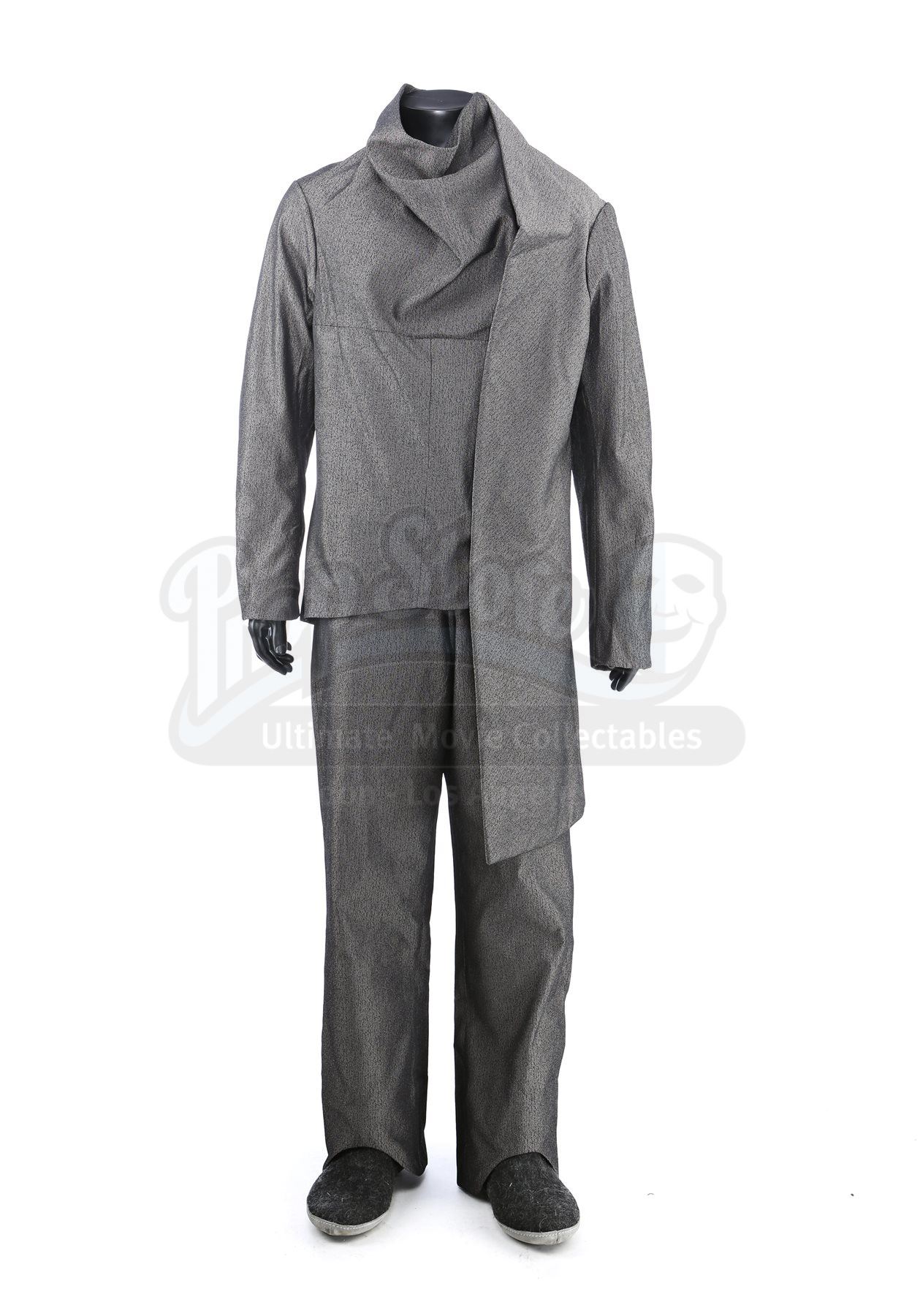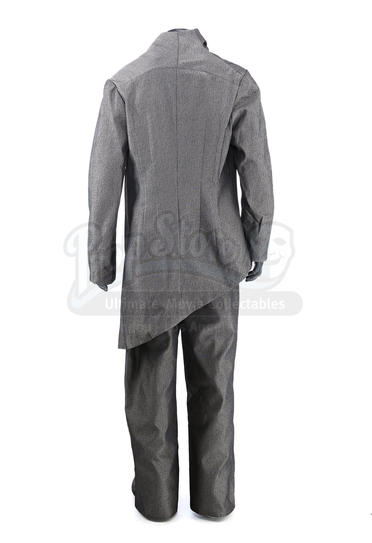 The asymmetrical tunic is made of a grey synthetic material with a metallic heathered fabric and fits like a suit jacket with one side draping longer than the other. The tunic includes a hidden front zipper with a foldover flap and includes snap buttons at the left breast. The pocket-free pants are made of the same material and feature a zipper at the hip. The shoes are made of faux fur with suede soles.