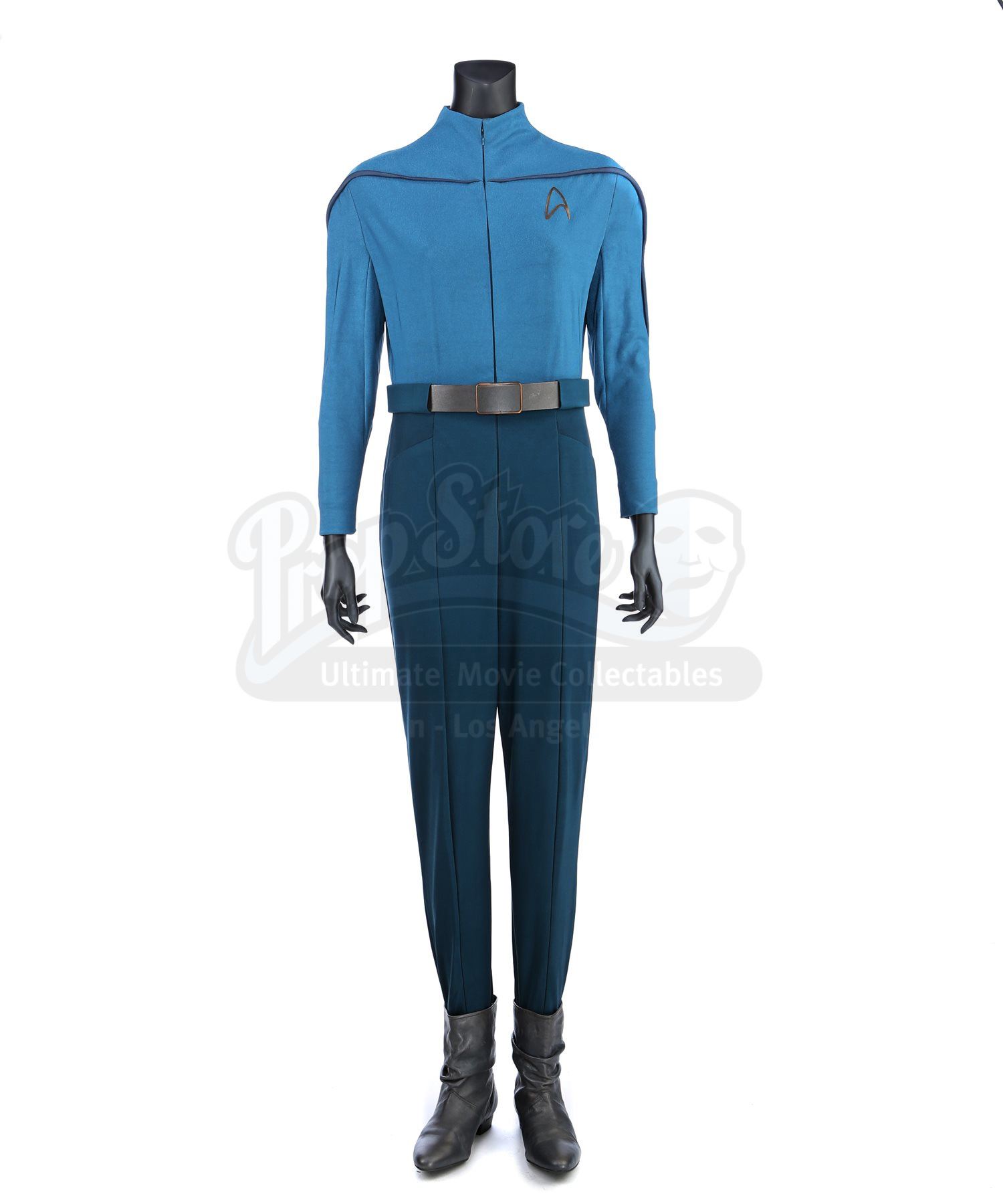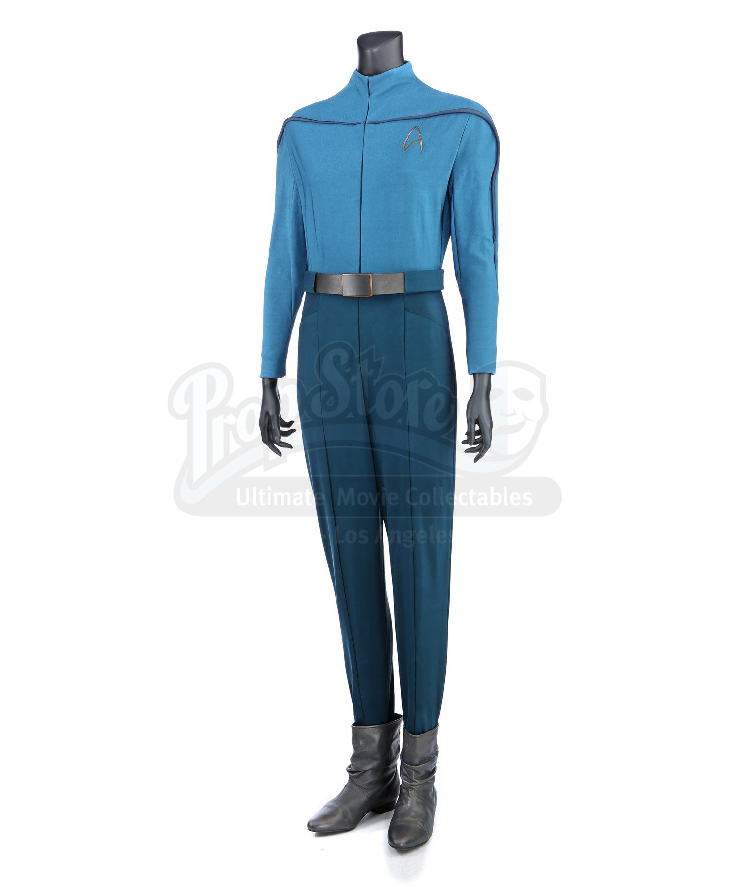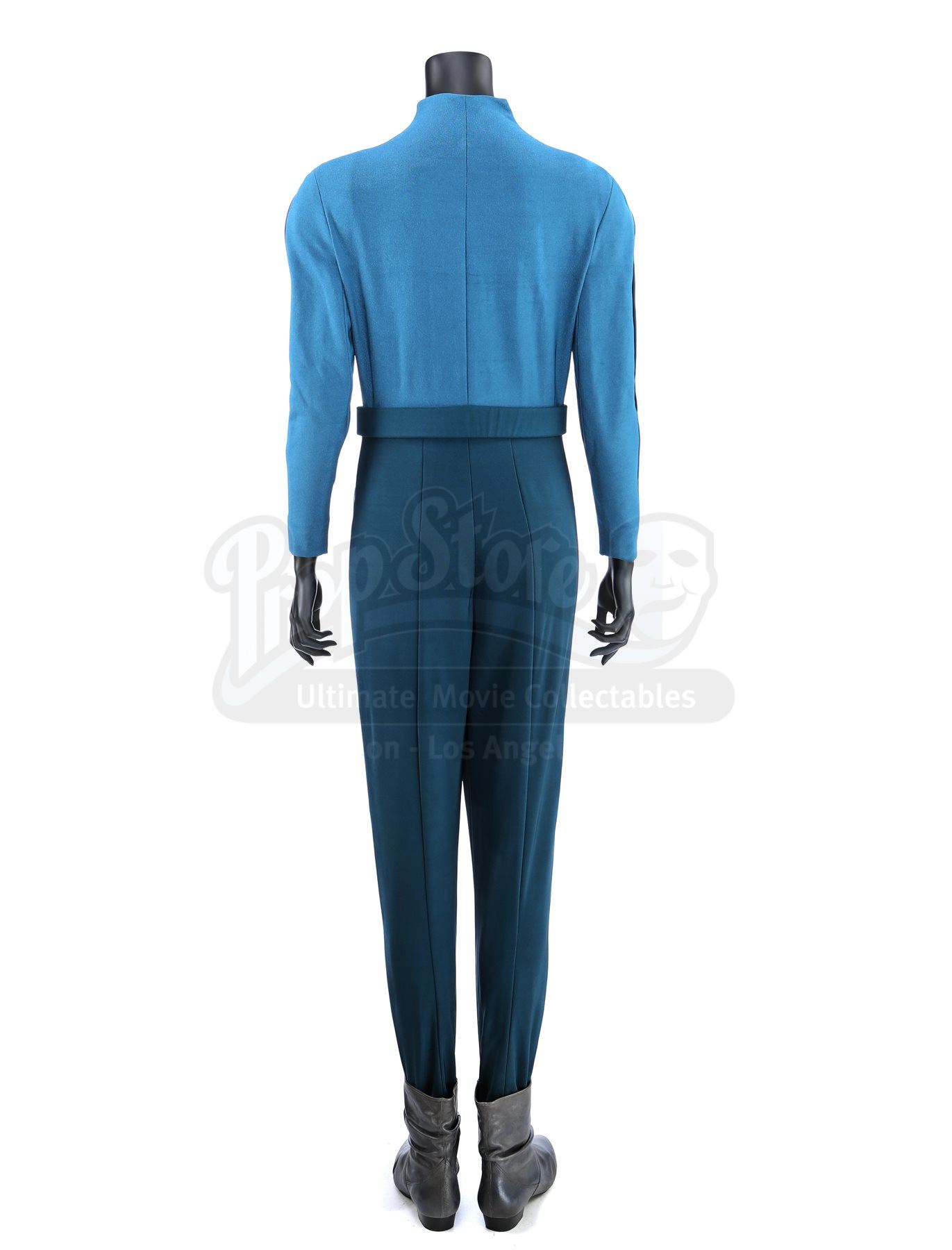 A women's Kelvin command uniform from Star Trek. Crewmen wore their uniforms on the USS Kelvin when they were attacked by the Narada, a Romulan ship that brought about an alternate reality. The uniform includes a custom-made Spandex Starfleet jumpsuit (approximate size medium) and a pair of women's leather boots (U.S. 7.5).