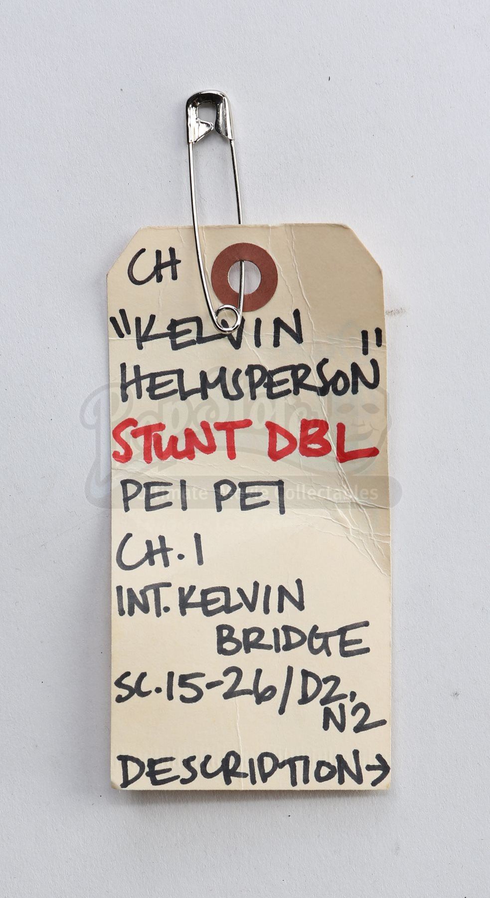 Stitched inside the jumpsuit is a wardrobe label for the stunt actor. Also included is a wardrobe tag with hand-written notes about the costume.