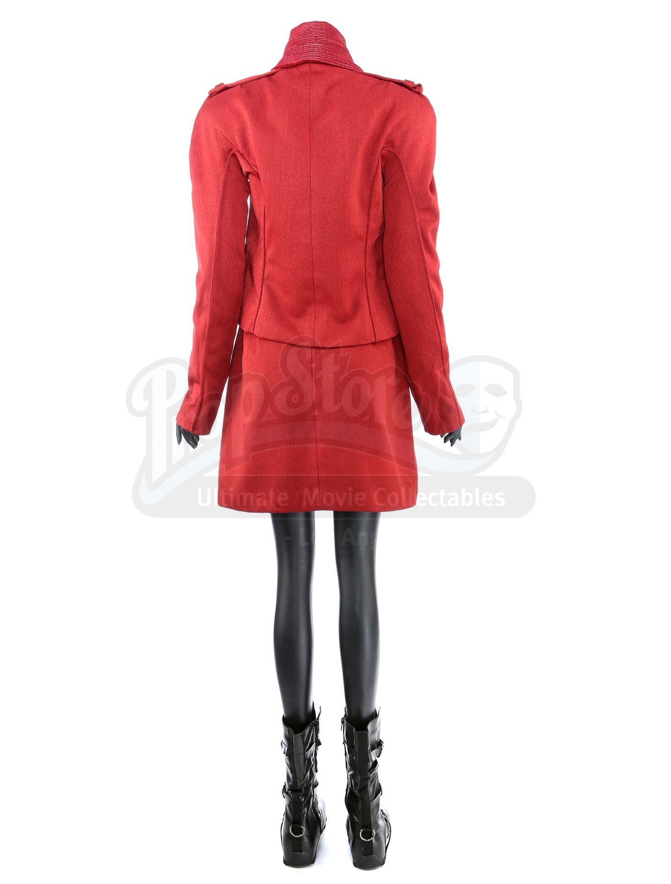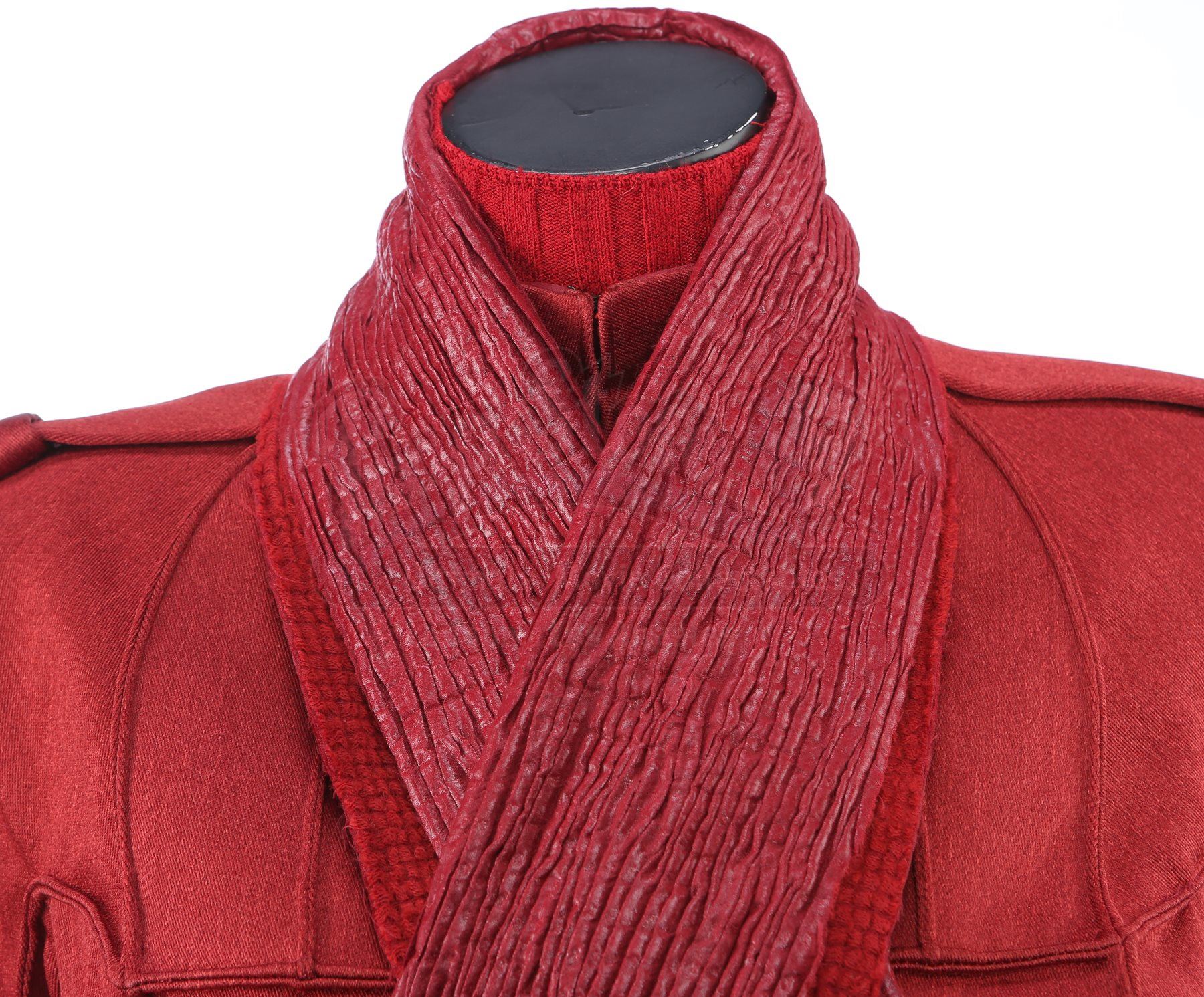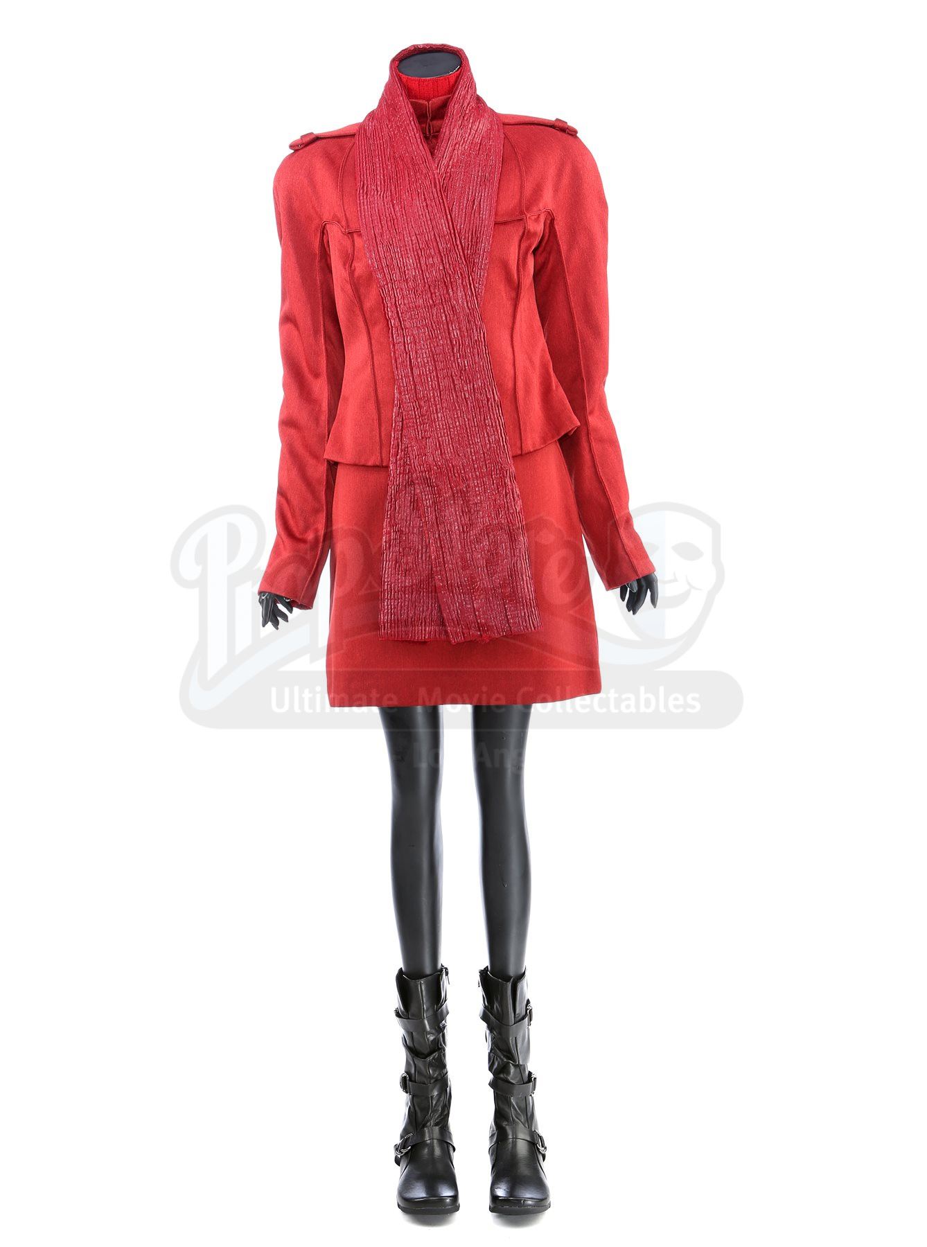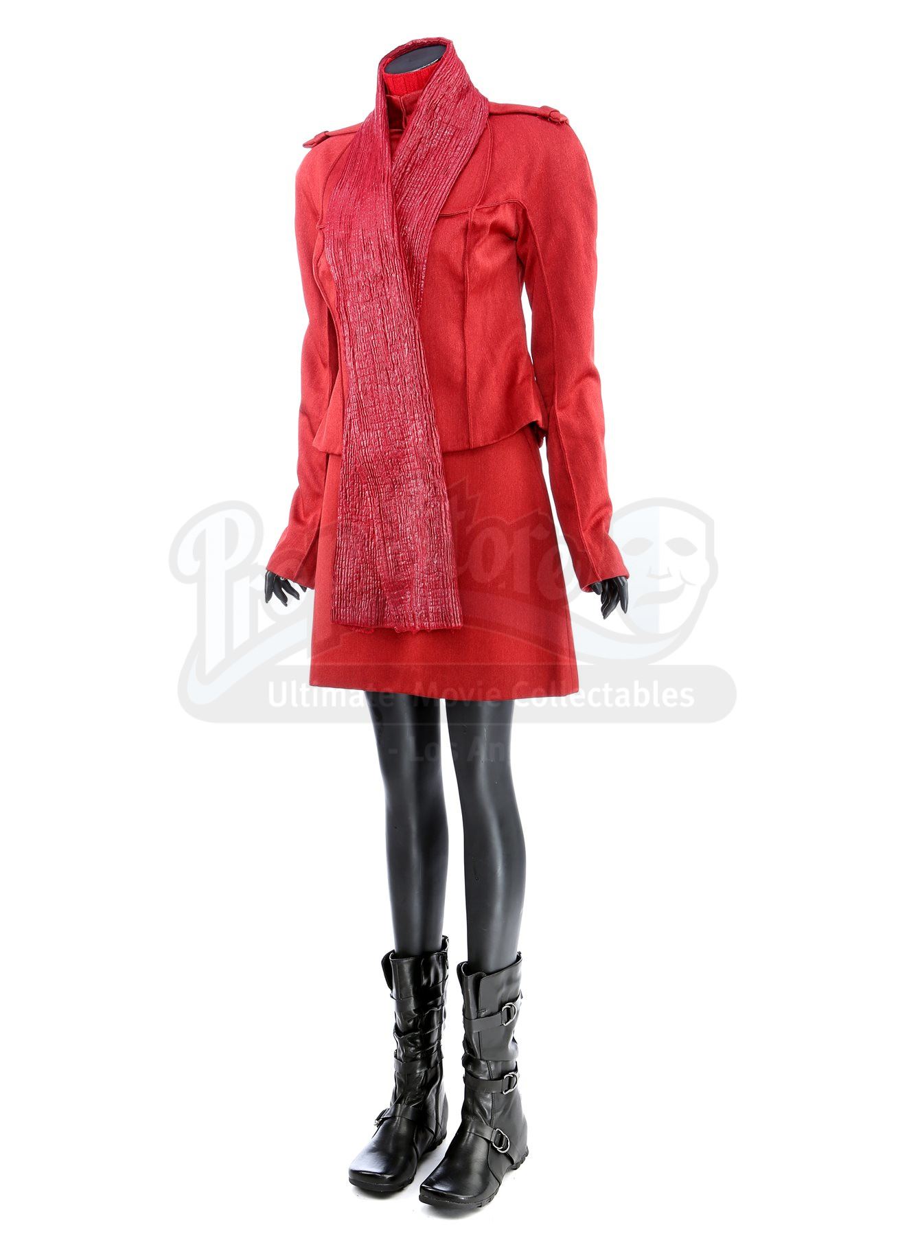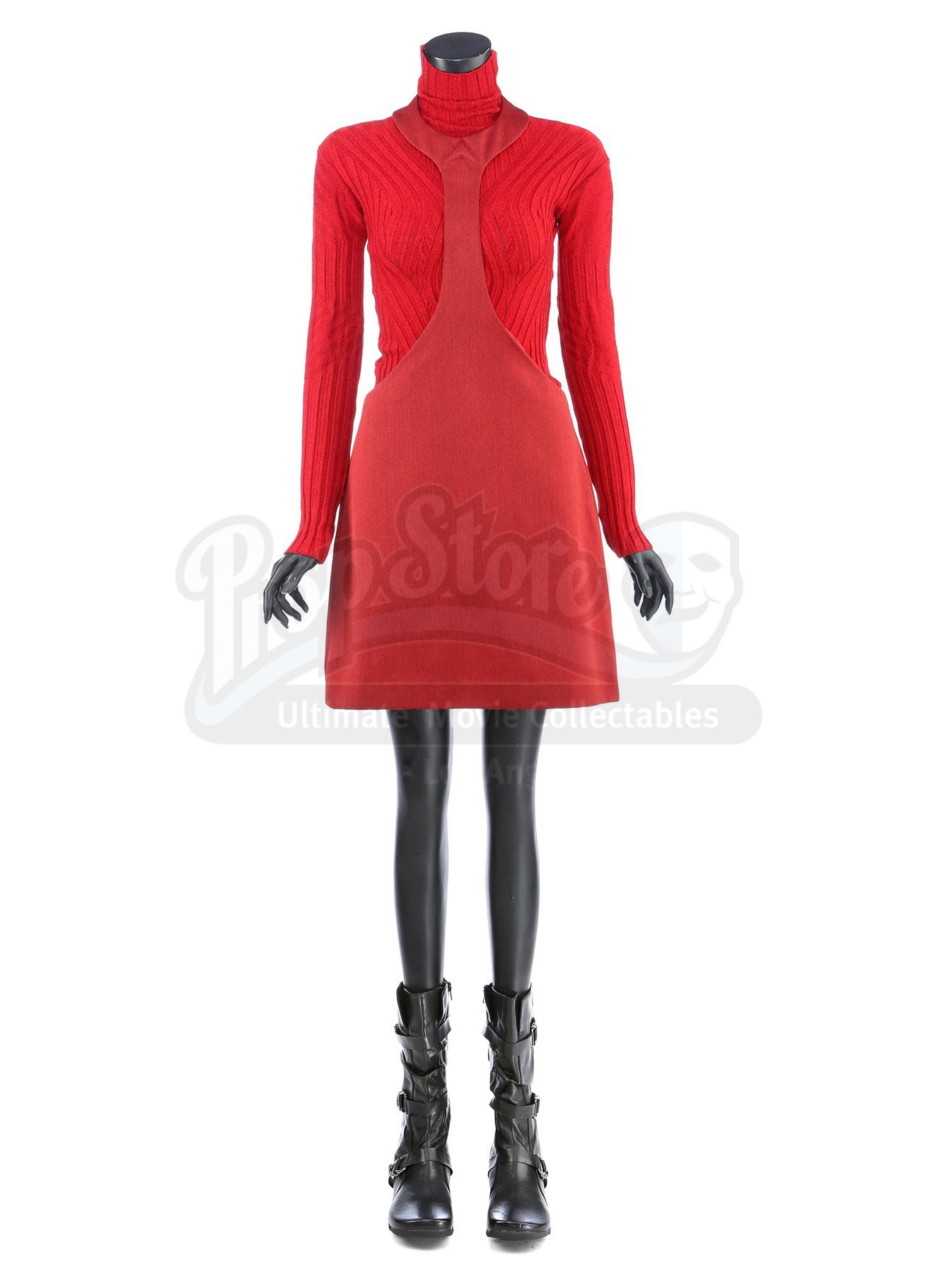 A women's Starfleet cadet uniform from Star Trek. Cadets wore their red uniforms while attending Starfleet Academy in San Francisco. Included with the uniform is a Starfleet Academy jacket (medium), a knit turtleneck sweater (medium), a cutout jumper (medium), a skirt (medium), scarf, and a pair of boots (U.S. 9). The jacket, jumper and skirt are made of a synthetic material with a metallic sheen. The zip-up jacket includes padded shoulders and a mid-length collar. The knit turtleneck features ribbing throughout and is made of a synthetic material. The scarf has a pleated metallic shimmer on one side, and appears woven on the reverse. The boots are made of faux leather with decorative straps along the vamp and shaft. Estimate: $600 - 800*Estimated sale price; sold without reserve.