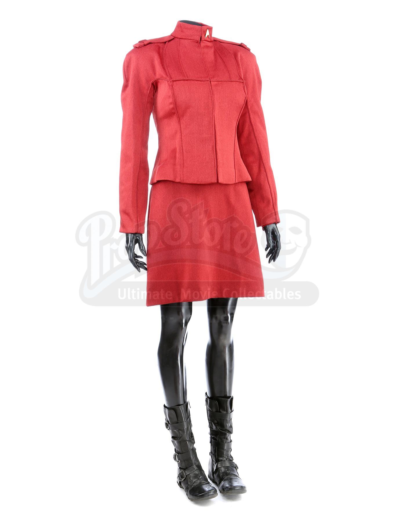 A women's Starfleet cadet uniform from Star Trek. Cadets wore their red uniforms while attending Starfleet Academy in San Francisco. Included with the uniform is a Starfleet Academy jacket (medium), a knit turtleneck sweater (large), a cutout jumper, skirt (large), pants (large), and a pair of boots (U.S. 7).