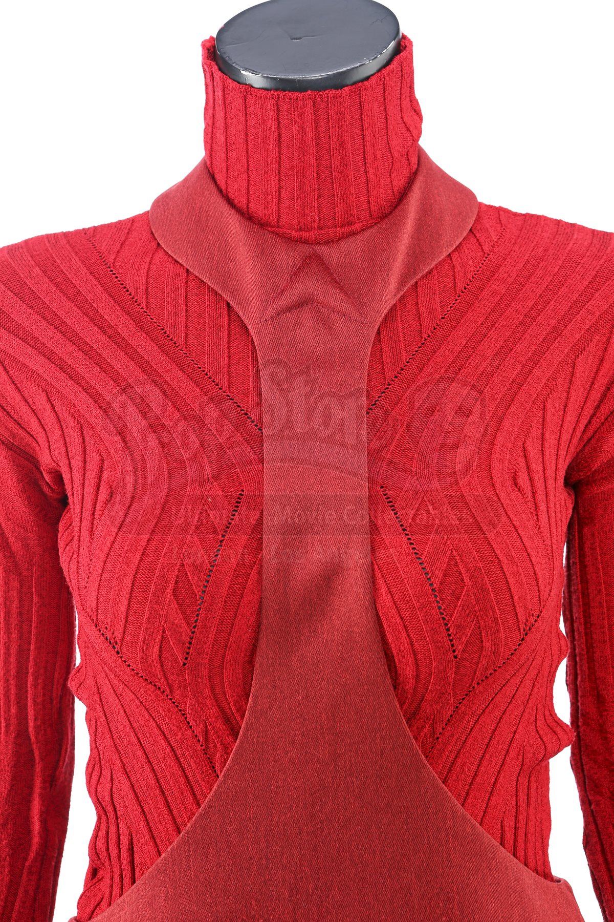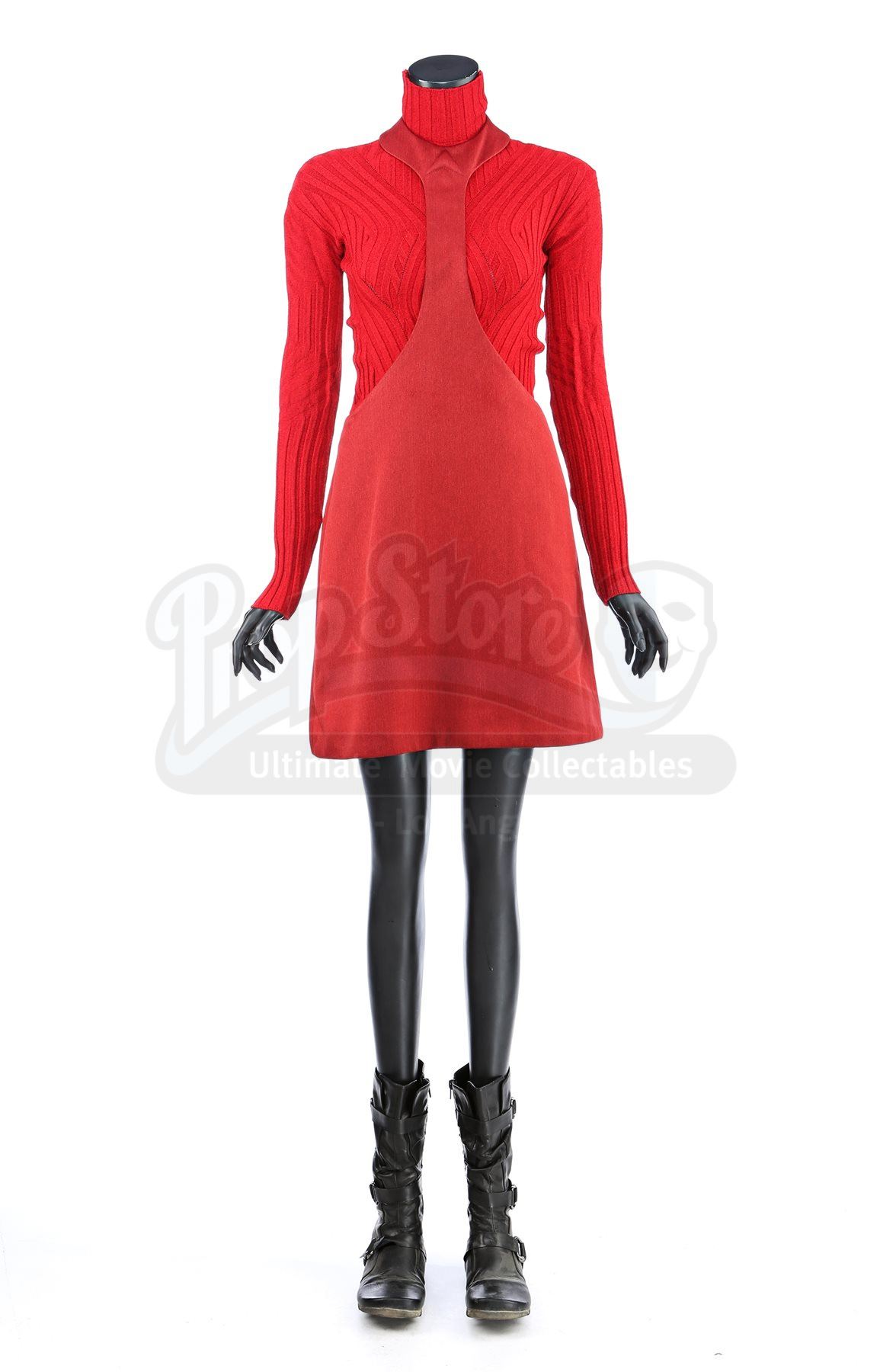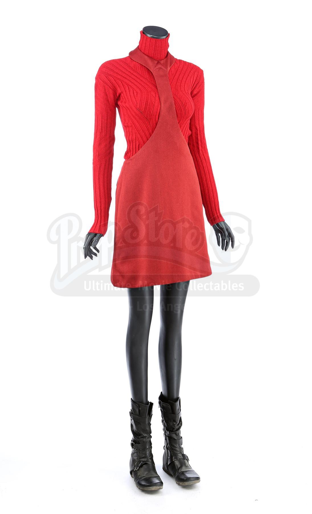A women's Starfleet cadet uniform from Star Trek. Cadets wore their red uniforms while attending Starfleet Academy in San Francisco. Included with the uniform is a turtleneck sweater (medium), two cutout jumpers (one small, one extra small) and a pair of boots (U.S. 6). The jumpers are made of a synthetic material with a metallic sheen. The knit turtleneck features ribbing throughout and is made of a synthetic material. The boots are made of faux leather with decorative straps along the vamp and shaft. Estimate: $600 - 800*Estimated sale price; sold without reserve.