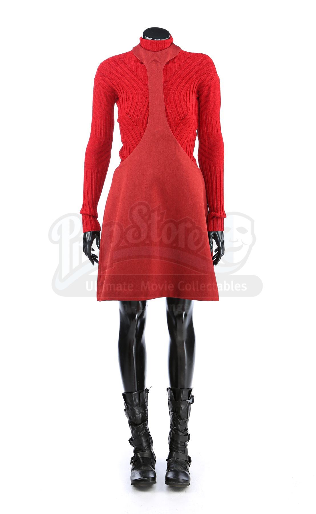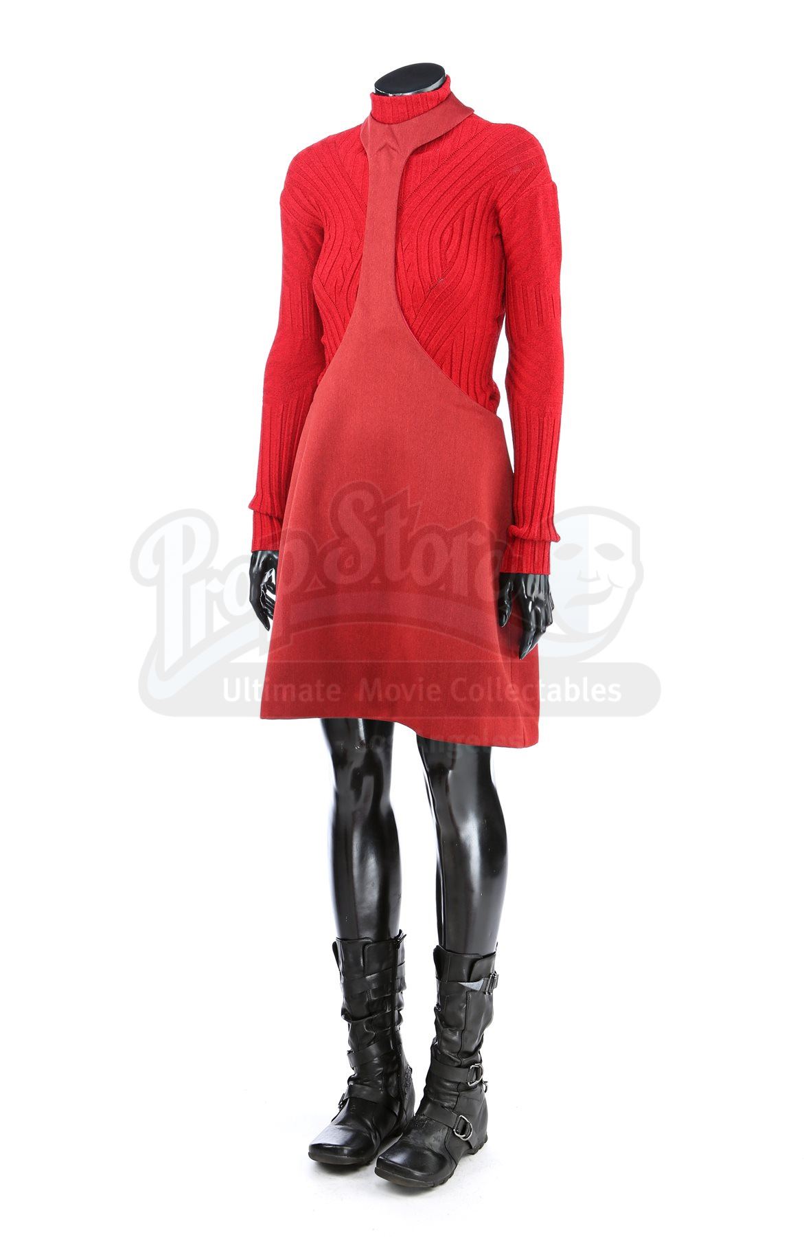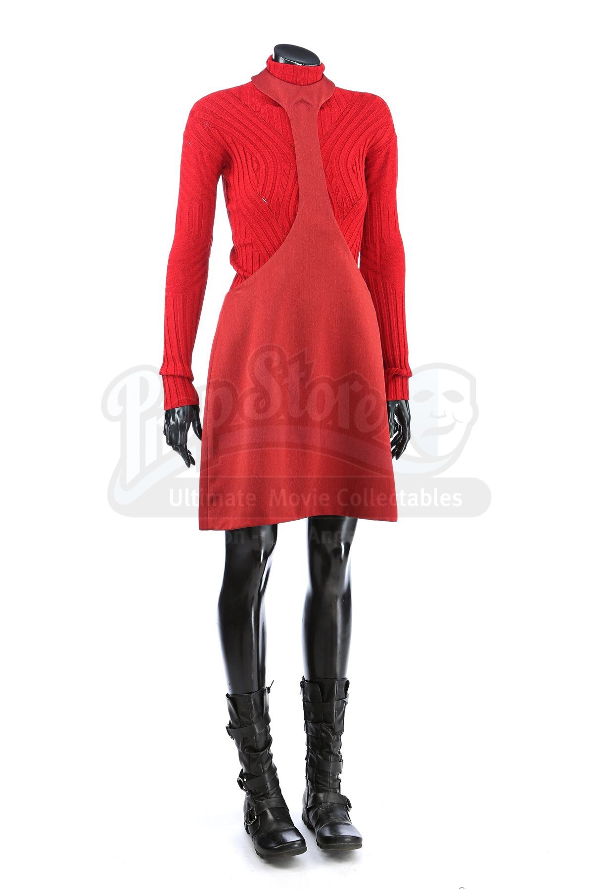 A women's Starfleet cadet uniform from Star Trek. Cadets wore their red uniforms while attending Starfleet Academy in San Francisco. Included with the uniform is a knit turtleneck sweater (large), a cutout jumper (large), a skirt (large), pants (large), and a pair of boots (U.S. 7.5). The knit turtleneck features ribbing throughout and is made of a synthetic material. The pants, jumper and skirt are made of a synthetic material with a metallic sheen. The boots are made of faux leather with decorative straps along the vamp and shaft. Estimate: $600 - 800*Estimated sale price; sold without reserve.