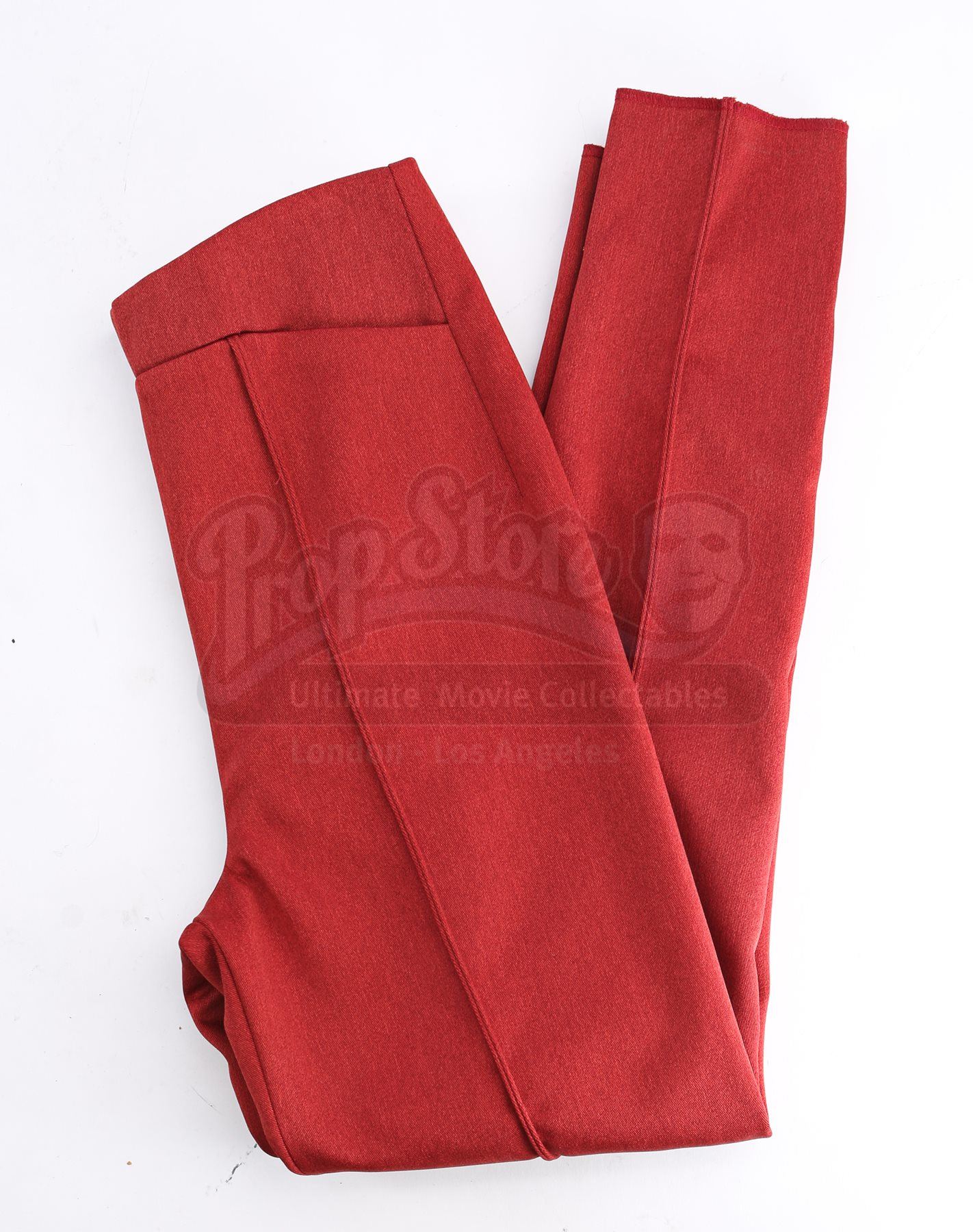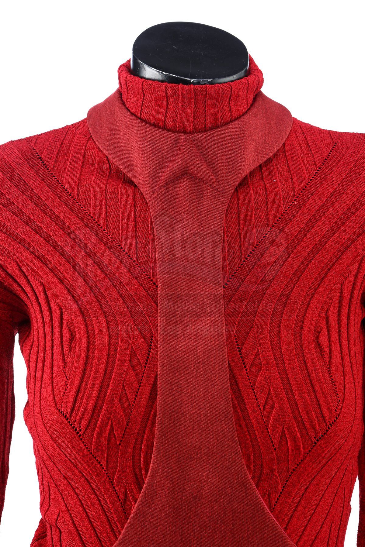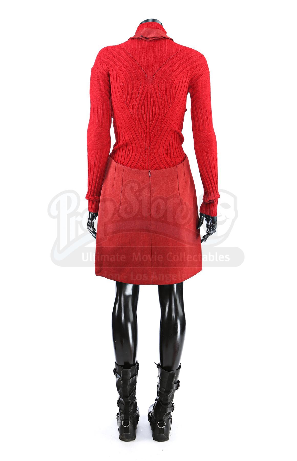A women's Starfleet cadet uniform from Star Trek. Cadets wore their red uniforms while attending Starfleet Academy in San Francisco. Included with the uniform is a knit turtleneck sweater (large), a cutout jumper (large), a skirt (large), pants (large), and a pair of boots (U.S. 7.5). The knit turtleneck features ribbing throughout and is made of a synthetic material. The pants, jumper and skirt are made of a synthetic material with a metallic sheen. The boots are made of faux leather with decorative straps along the vamp and shaft. Estimate: $600 - 800*Estimated sale price; sold without reserve.