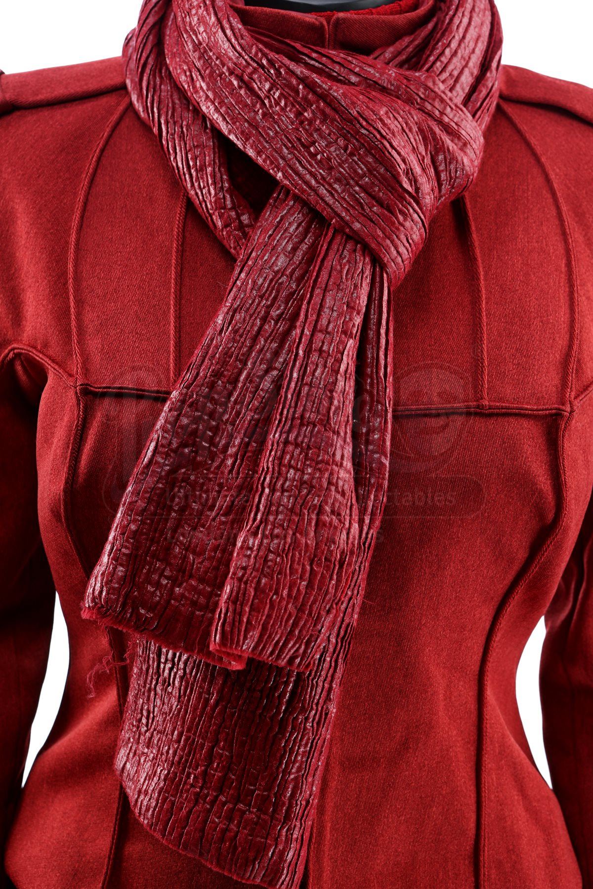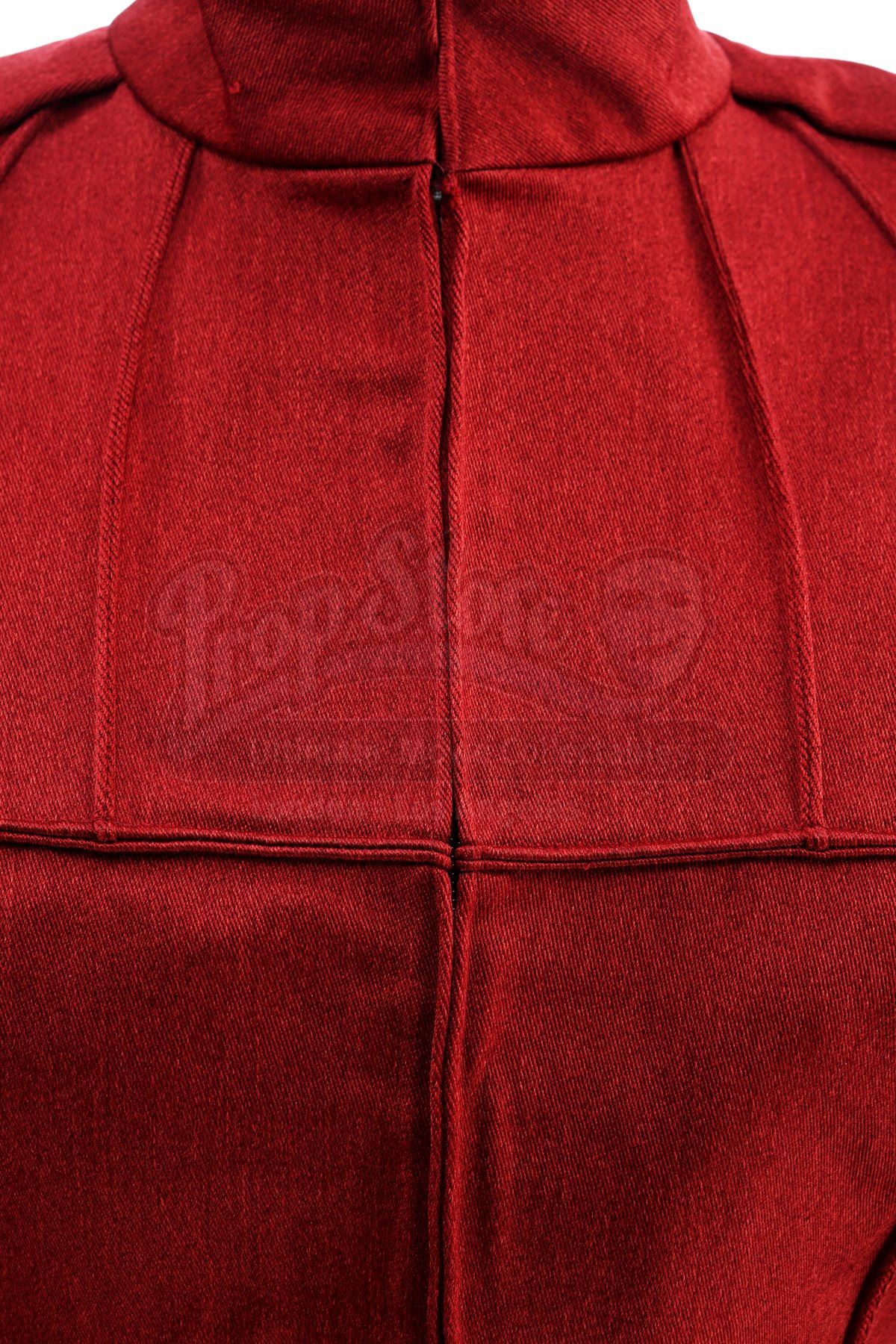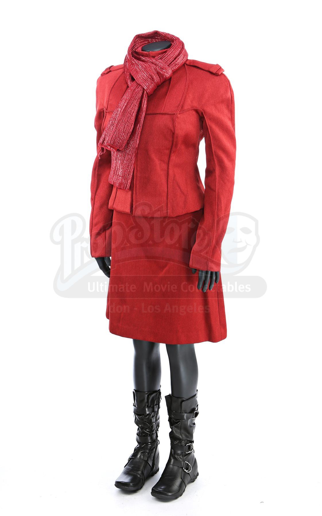 A women's Starfleet cadet uniform from Star Trek. Cadets wore their red uniforms while attending Starfleet Academy in San Francisco. Included with the uniform is a Starfleet Academy jacket (medium), a knit turtleneck sweater (large), skirt (large), scarf, and a pair of boots (U.S. 6.5). The jacket and skirt are made of a synthetic material with a metallic sheen and have ribbed seams. The zip-up jacket includes padded shoulders and a mid-length collar. The knit turtleneck features ribbing throughout and is made of a synthetic material. The pants and skirt are also made of a synthetic material with a metallic sheen and the pants feature ribbed seams. The scarf has a pleated metallic shimmer on one side and appears woven on the reverse. The boots are made of faux leather with decorative straps along the vamp and shaft. Estimate: $600 - 800*Estimated sale price; sold without reserve.