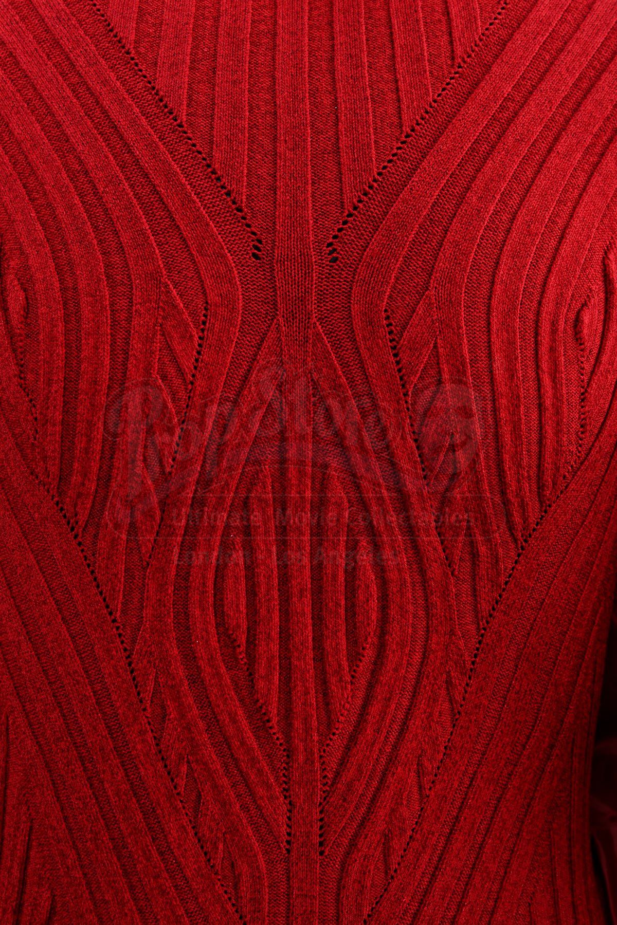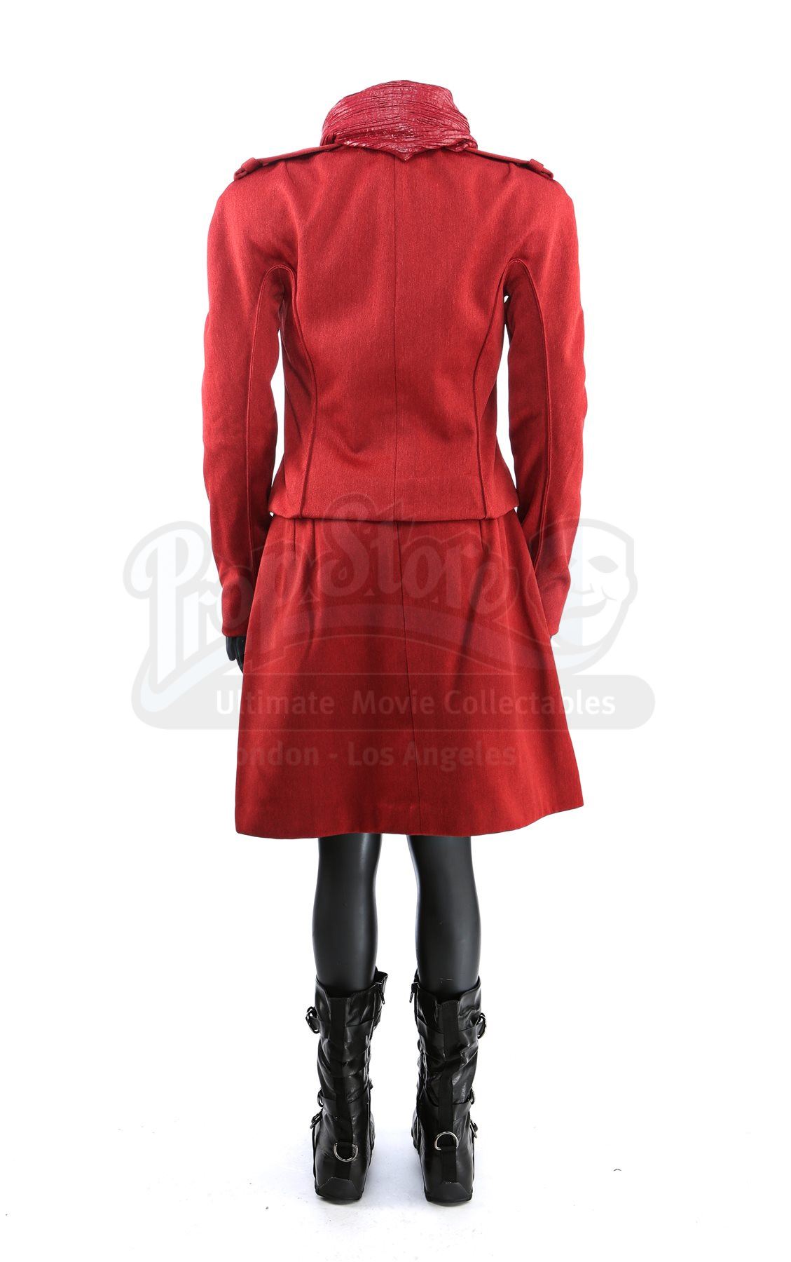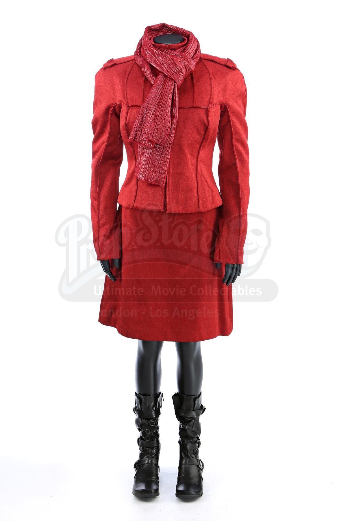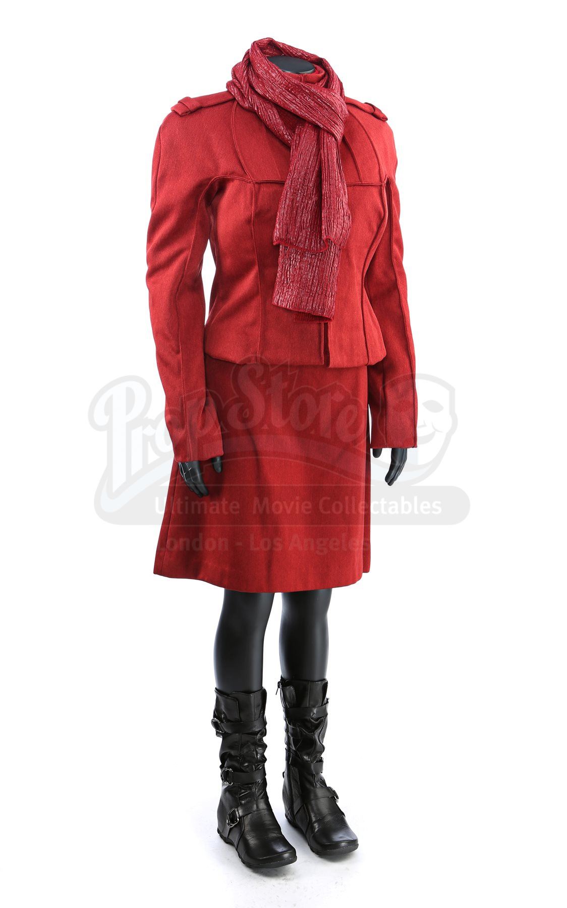 A women's Starfleet cadet uniform from Star Trek. Cadets wore their red uniforms while attending Starfleet Academy in San Francisco. Included with the uniform is a Starfleet Academy jacket (medium), a knit turtleneck sweater (large), skirt (large), scarf, and a pair of boots (U.S. 6.5). The jacket and skirt are made of a synthetic material with a metallic sheen and have ribbed seams. The zip-up jacket includes padded shoulders and a mid-length collar. The knit turtleneck features ribbing throughout and is made of a synthetic material. The pants and skirt are also made of a synthetic material with a metallic sheen and the pants feature ribbed seams. The scarf has a pleated metallic shimmer on one side and appears woven on the reverse. The boots are made of faux leather with decorative straps along the vamp and shaft. Estimate: $600 - 800*Estimated sale price; sold without reserve.