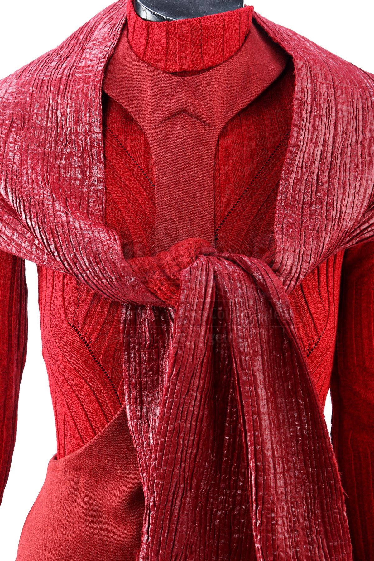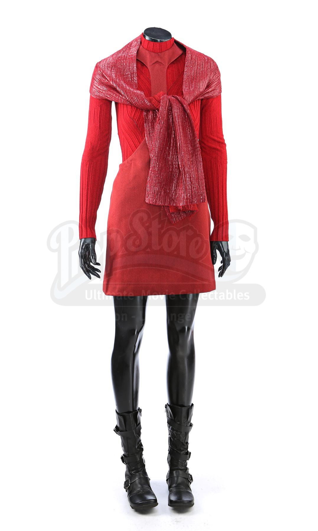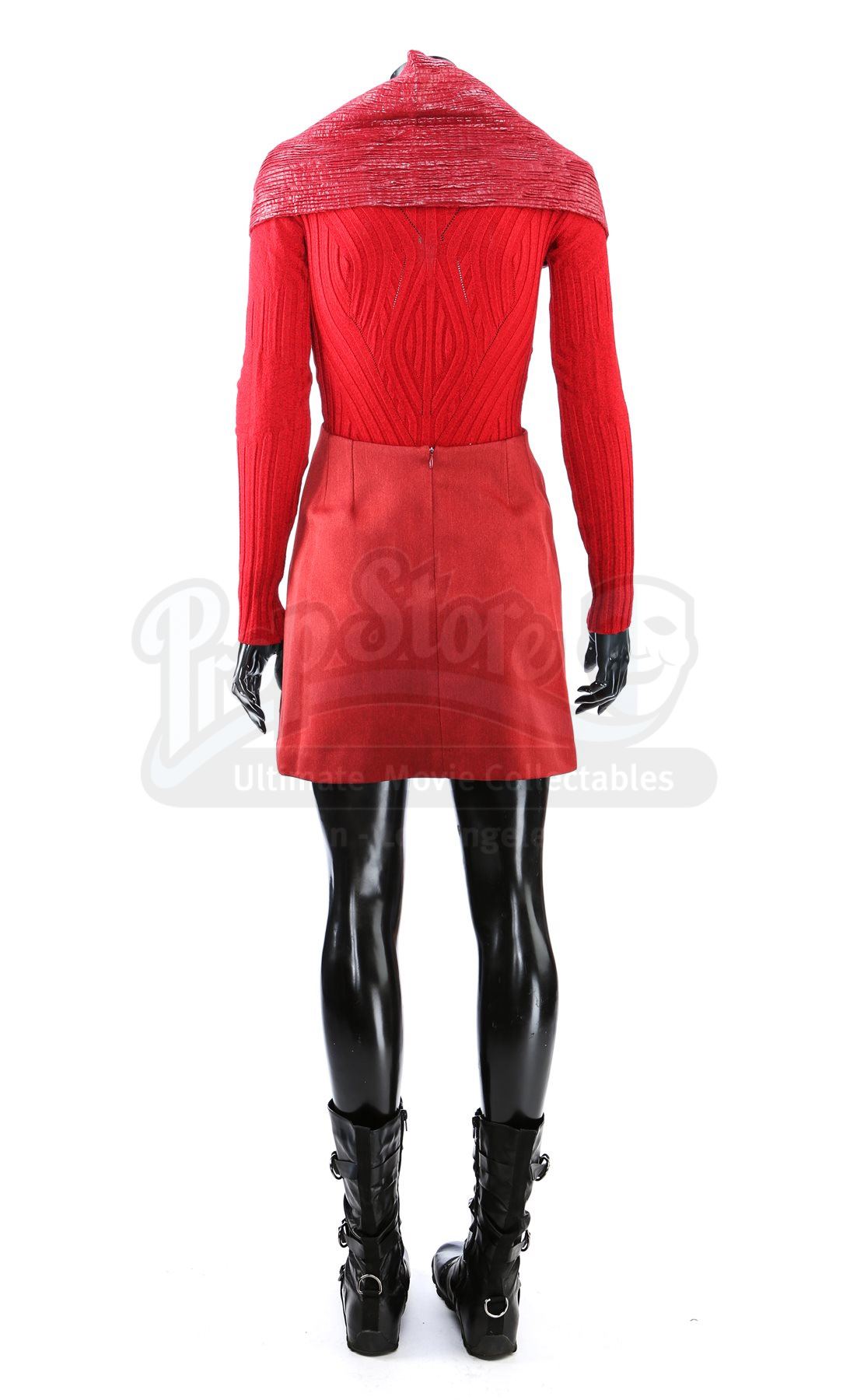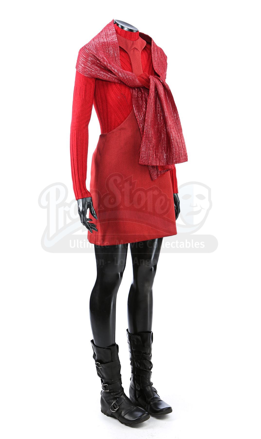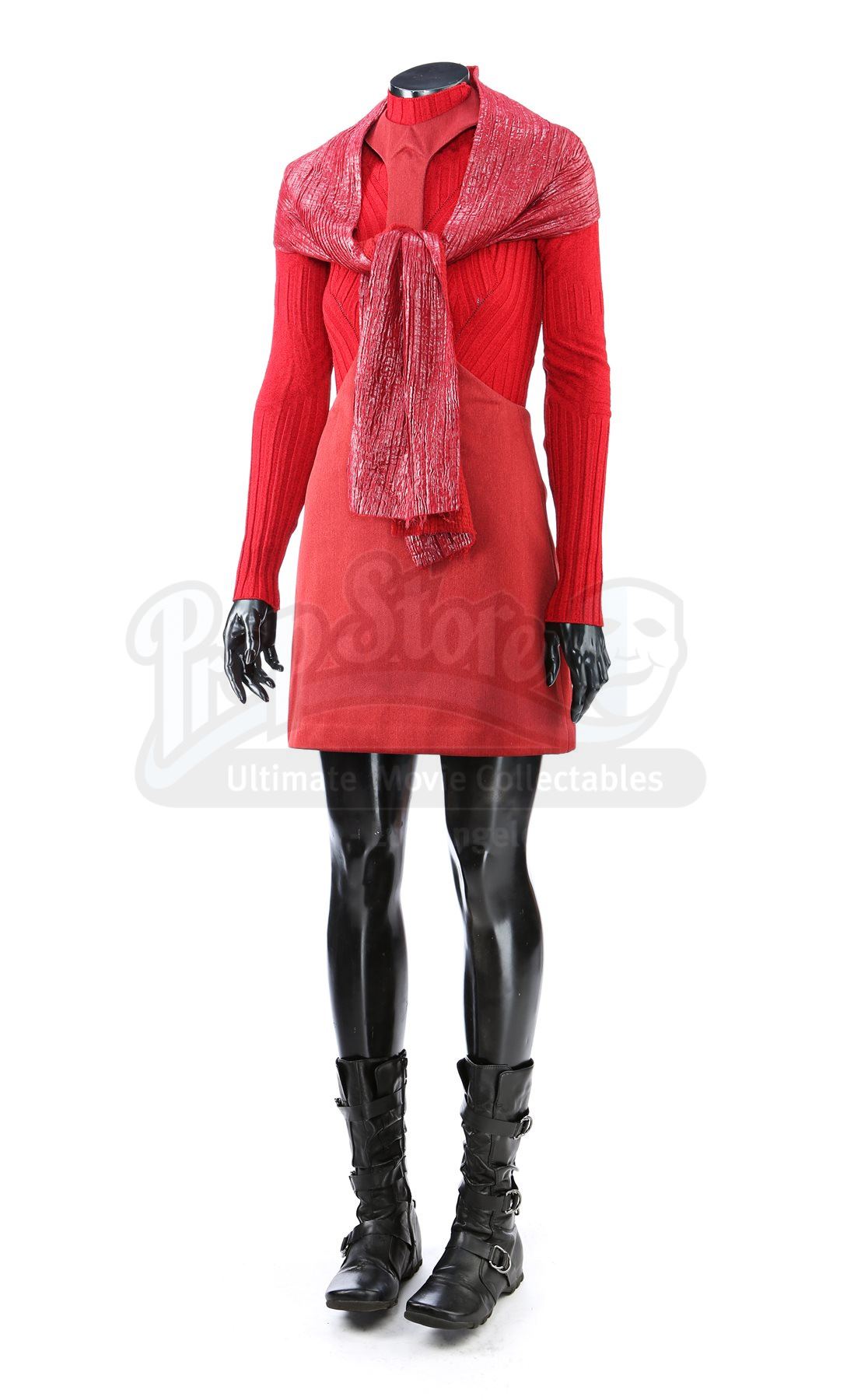 A women's Starfleet cadet uniform from Star Trek. Cadets wore their red uniforms while attending Starfleet Academy in San Francisco. Included with the uniform is a knit turtleneck sweater (medium), cutout jumper (small), scarf, and a pair of boots (U.S. 7.5). The knit turtleneck features ribbing throughout and is made of a synthetic material. The skirt has a metallic shimmer and includes a collar that hooks behind the neck. The scarf has a pleated metallic shimmer on one side and appears woven on the reverse. The boots are made of faux leather with decorative straps along the vamp and shaft. Estimate: $600 - 800*Estimated sale price; sold without reserve.