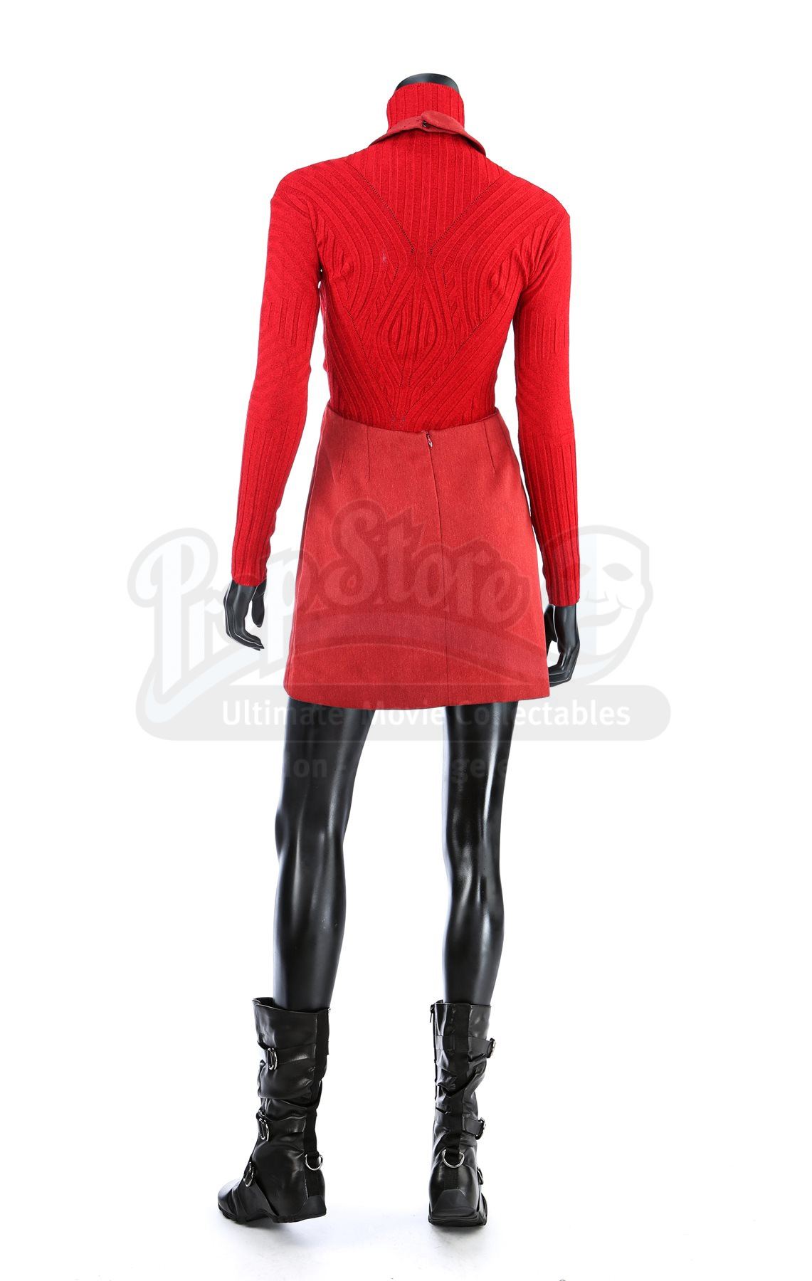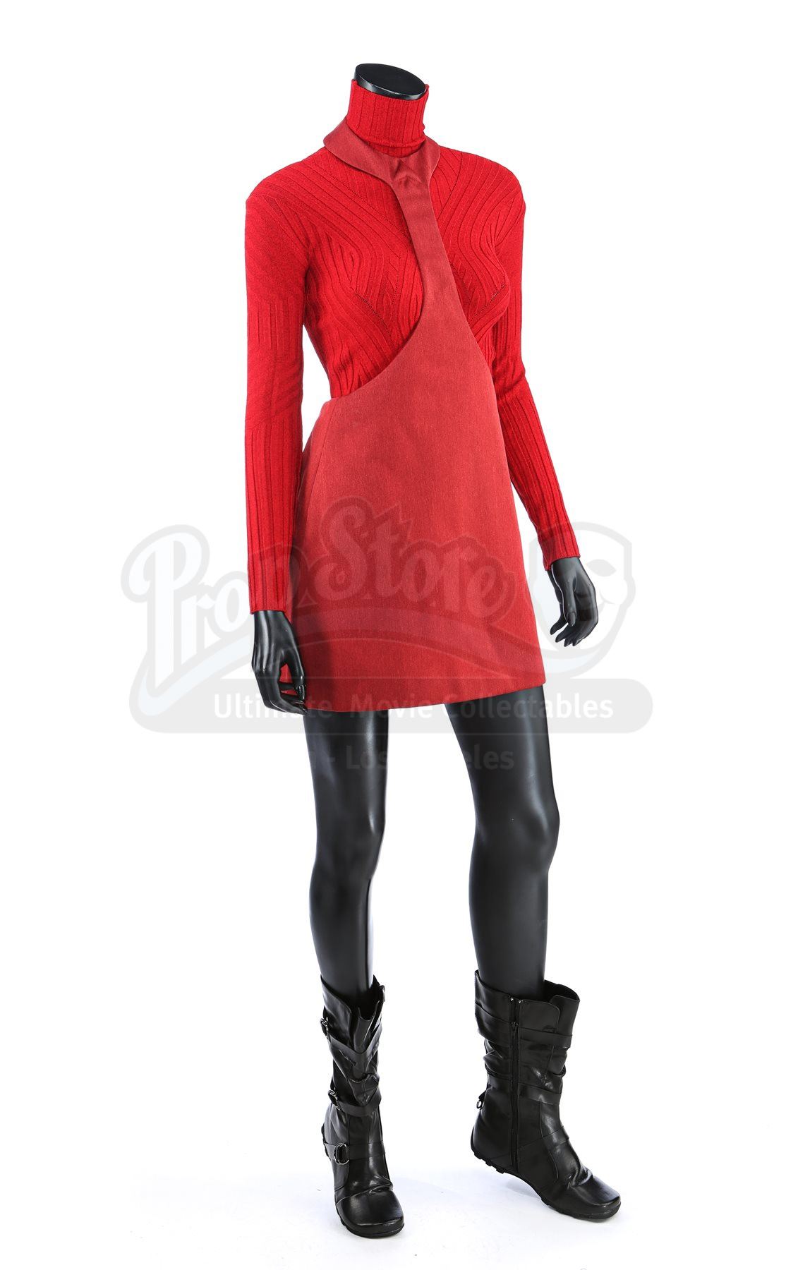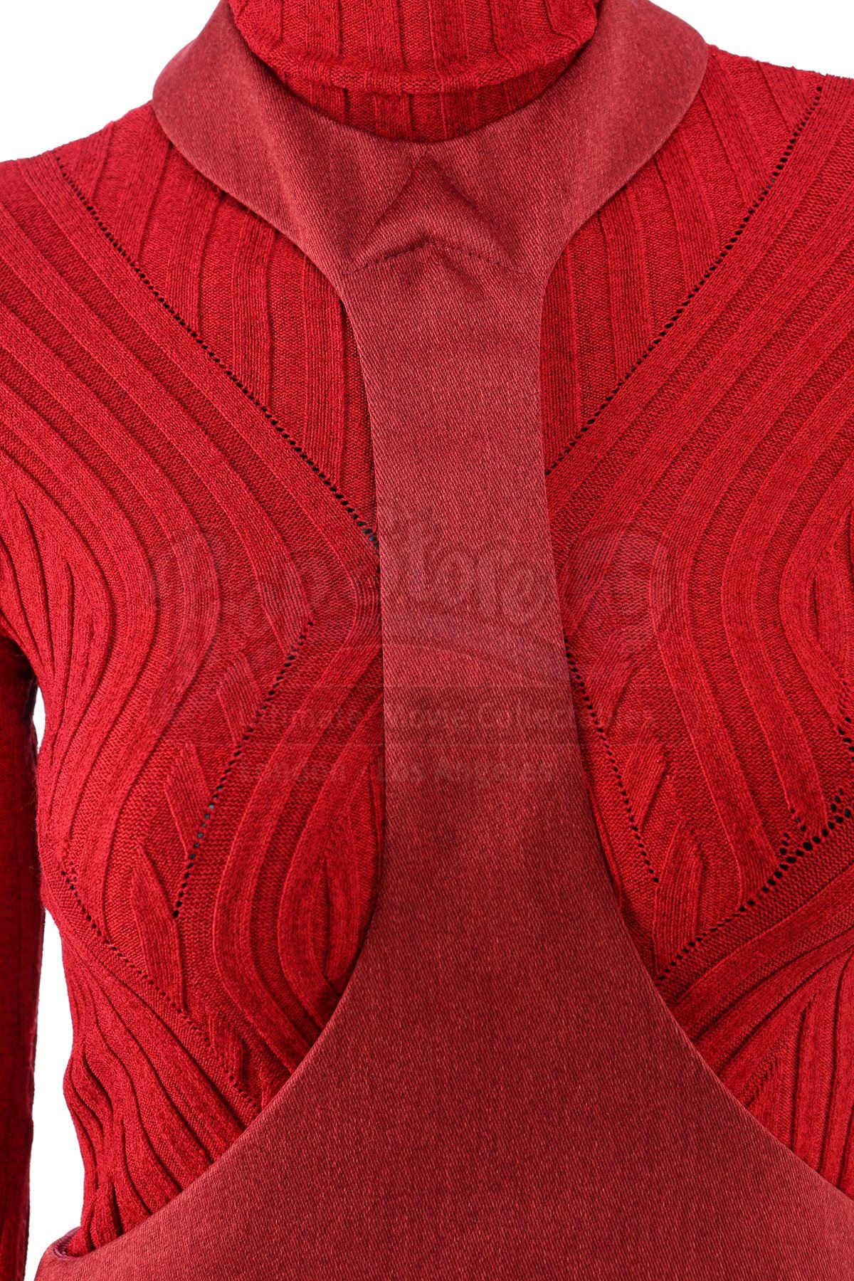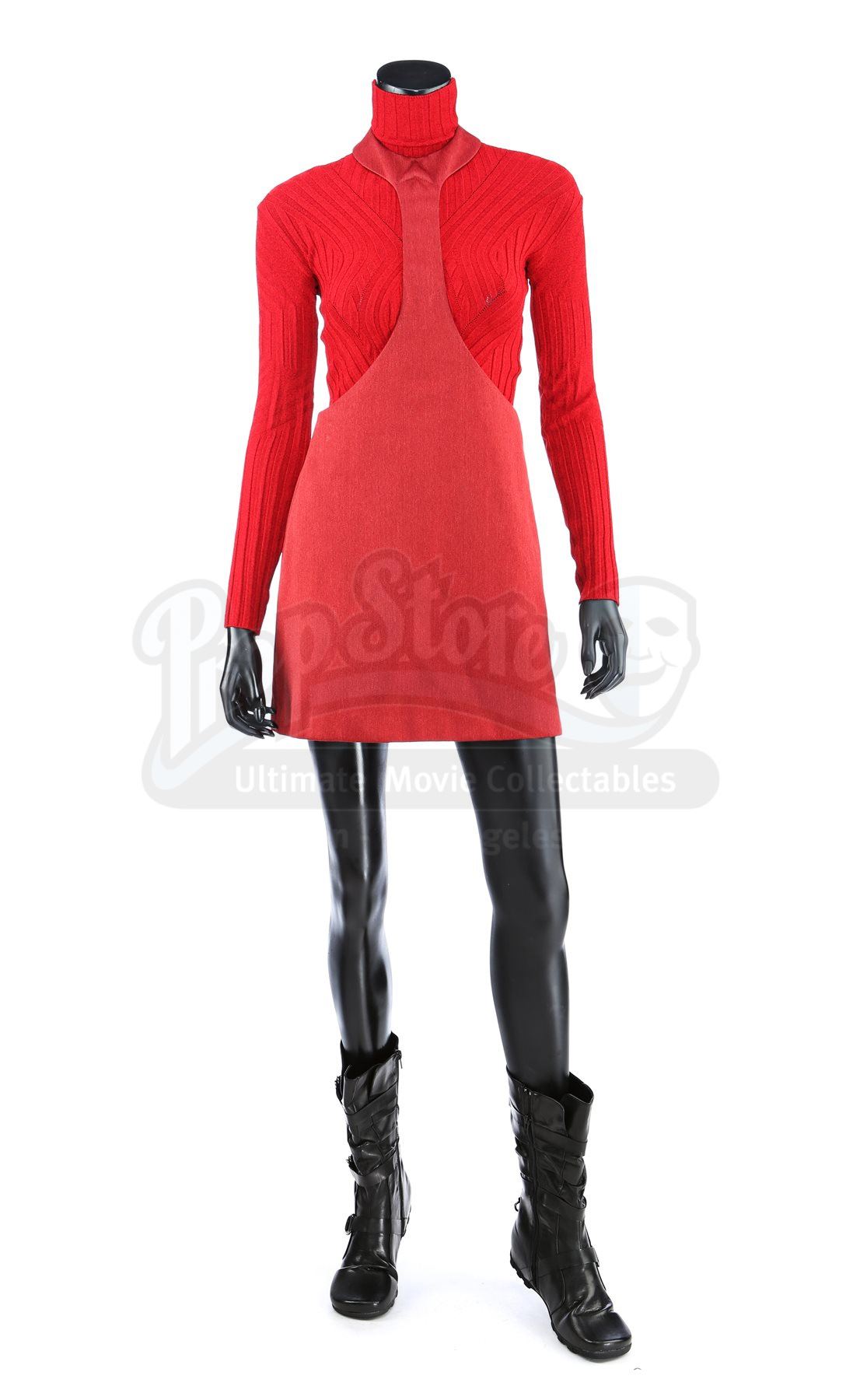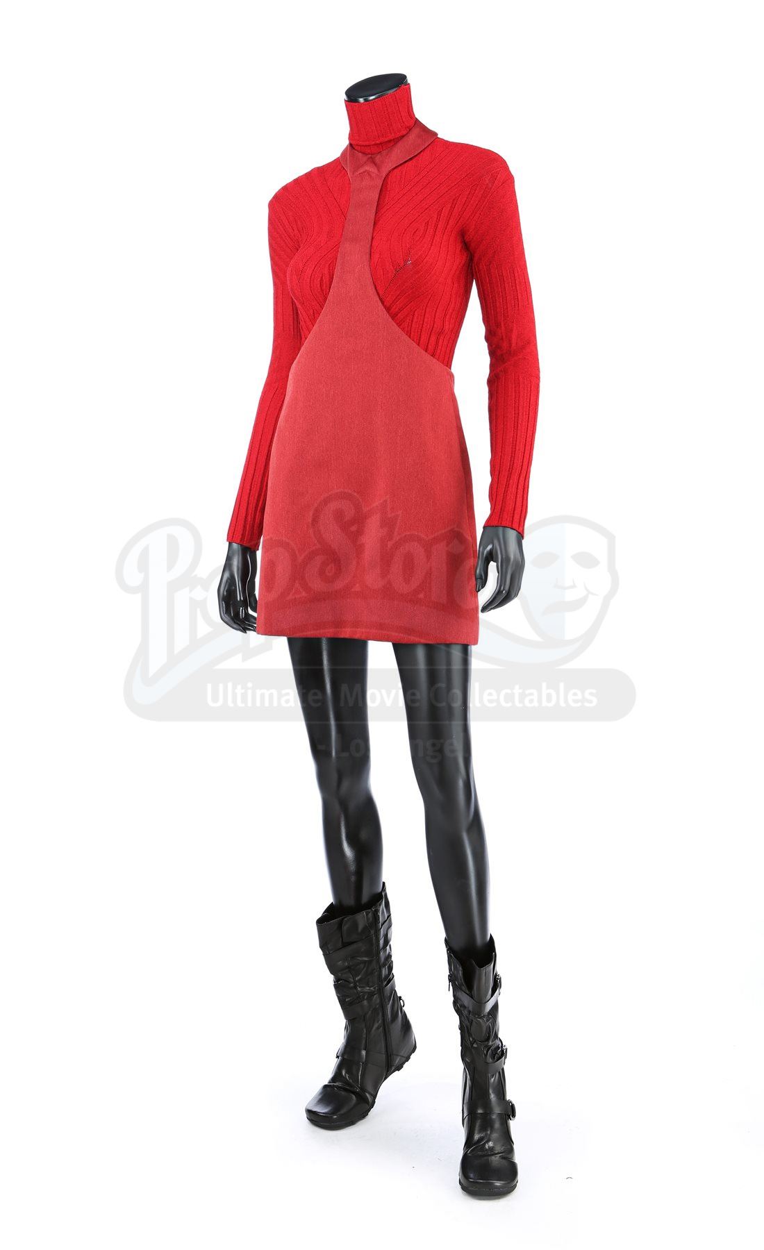A women's Starfleet cadet uniform from Star Trek. Cadets wore their red uniforms while attending Starfleet Academy in San Francisco. Included with the uniform is a turtleneck sweater (medium), two cutout jumpers (one small, one extra small) and a pair of boots (U.S. 9). The cutout jumpers are made of a synthetic material with a metallic sheen. The knit turtleneck features ribbing throughout and is made of a synthetic material. The boots are made of faux leather with decorative straps along the vamp and shaft.Estimate: $600 - 800*Estimated sale price; sold without reserve.
