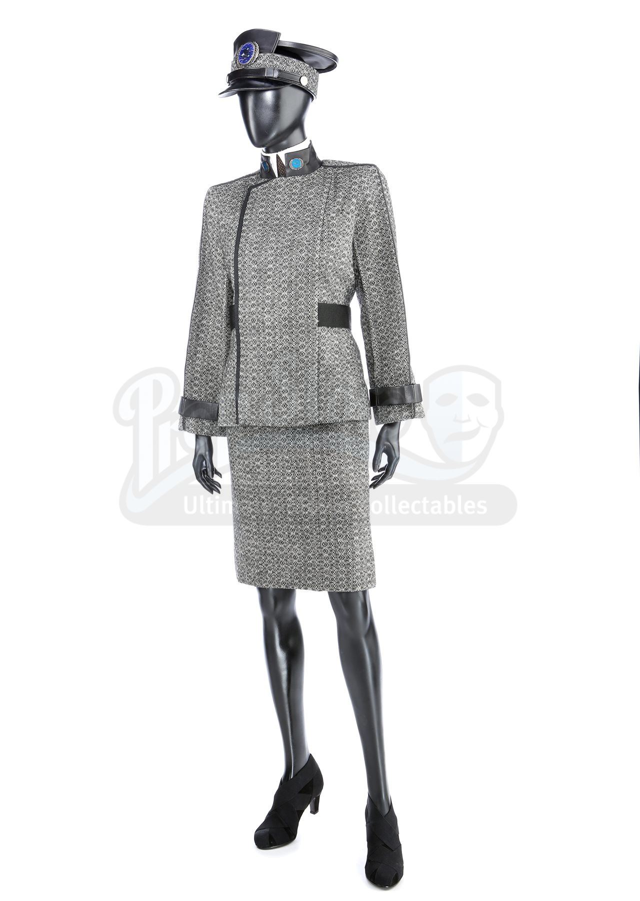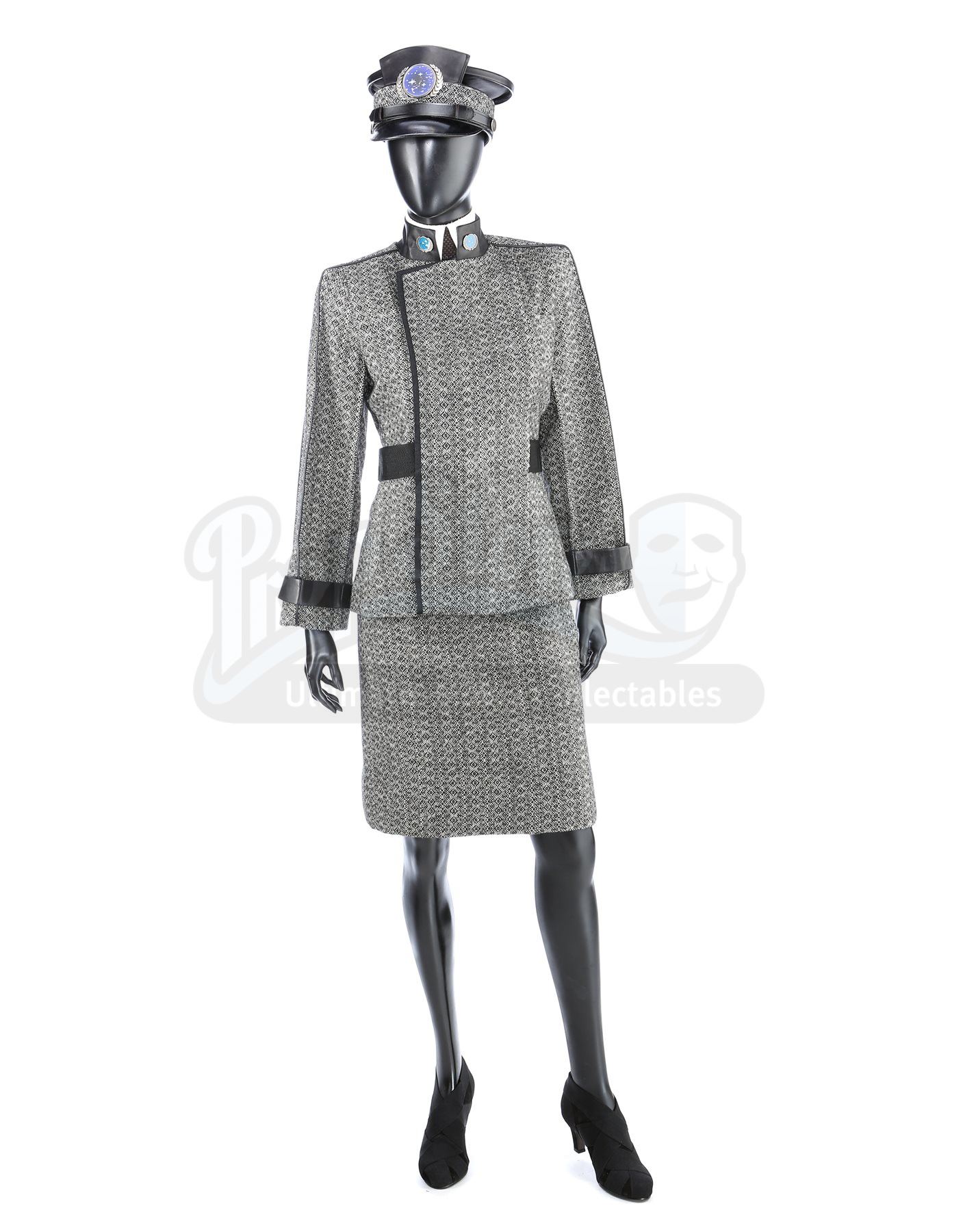 A women's Starfleet council member uniform from Star Trek. Starfleet admirals wore their uniforms when Captain Kirk attended a disciplinary hearing for his actions in the Kobayashi Maru simulation. The uniform includes a cap, jacket (approximate size large), hook-and-loop collar, belt, skirt (approximate size medium), and a pair of black high heel shoes (Euro 37).
